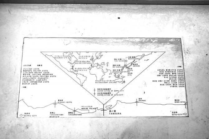 展望台の床には、別府で亡くなった詩人・佐藤渓の詩「ともだち経」と共に、大分市、別府市それぞれの姉妹都市が地図上に描かれている。
