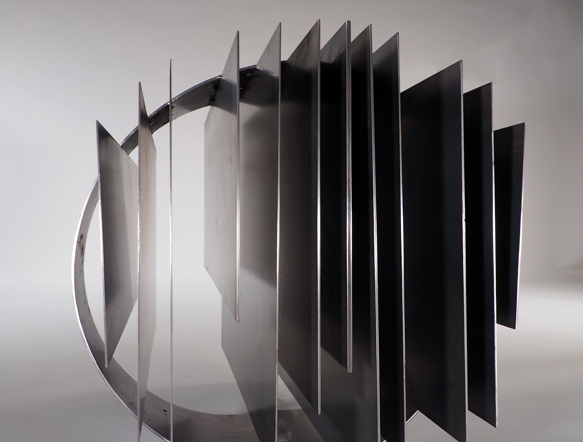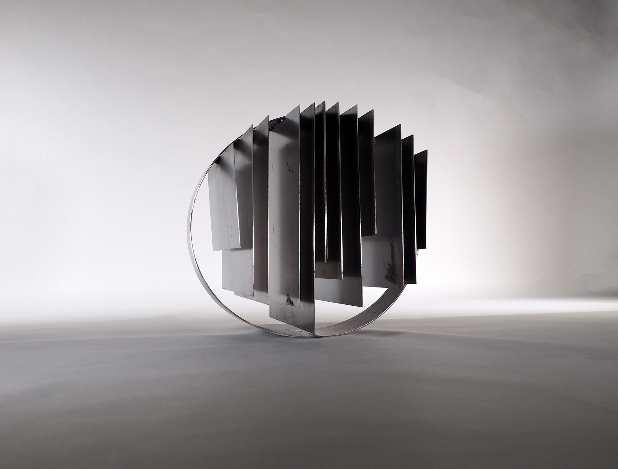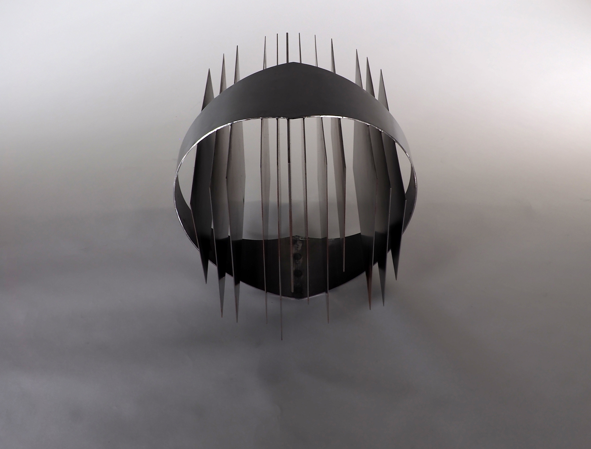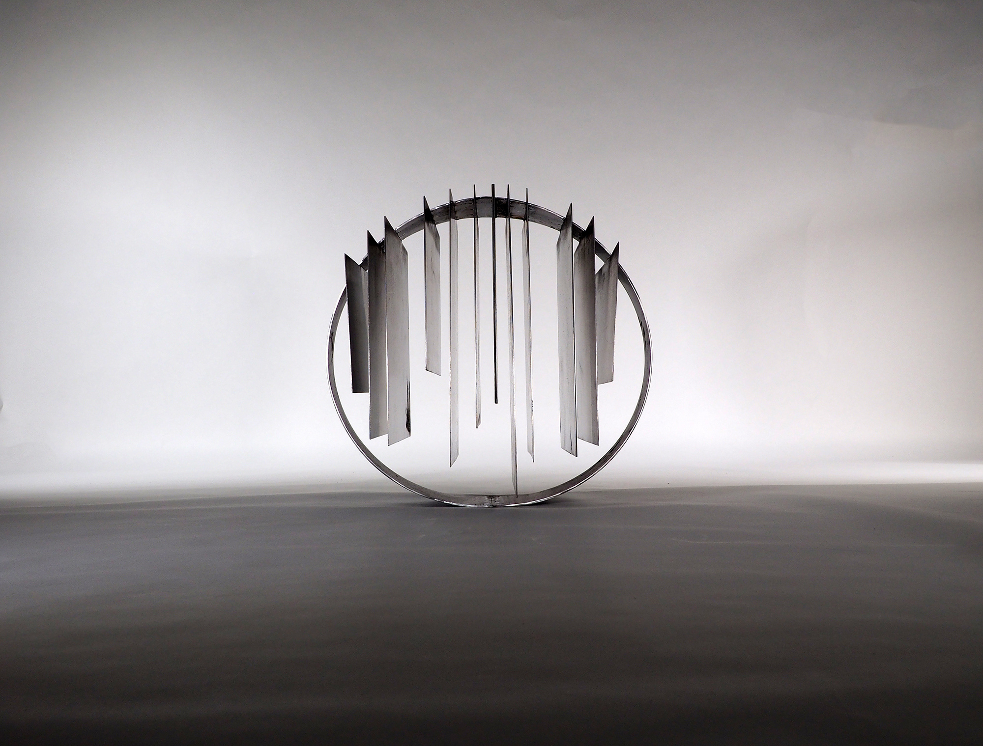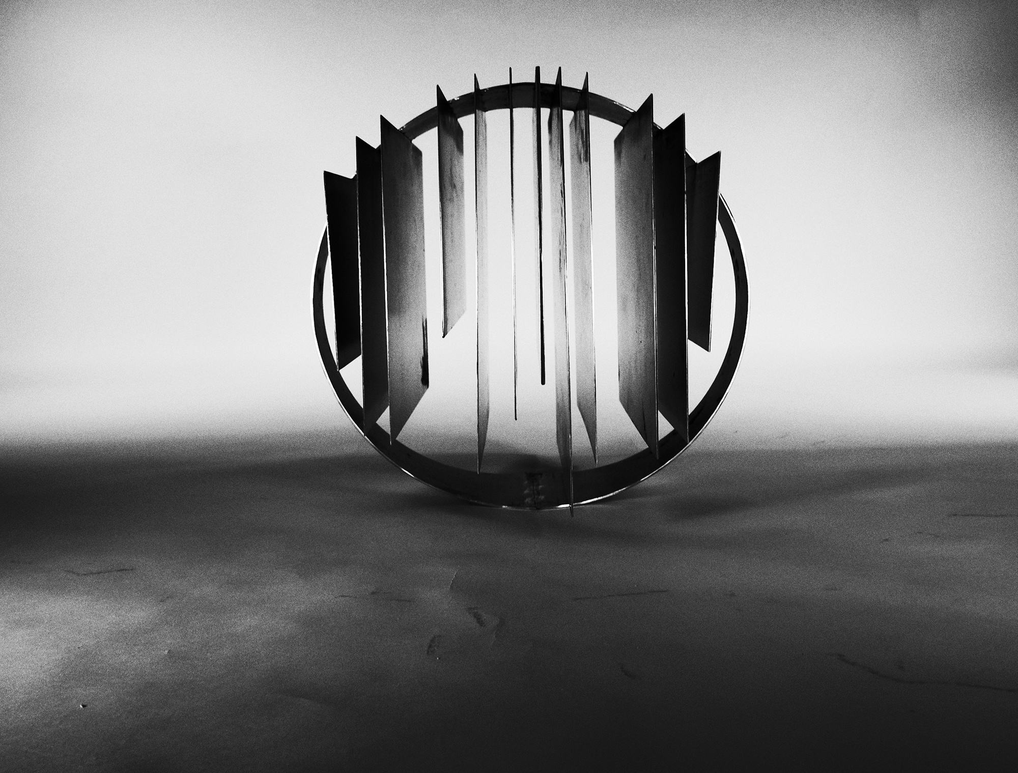 JIG is a three-dimensional element with a well-ordered, geometric, perfect circular ring shape, inside which steel plates of different thicknesses are suspended like barcodes at different heights.