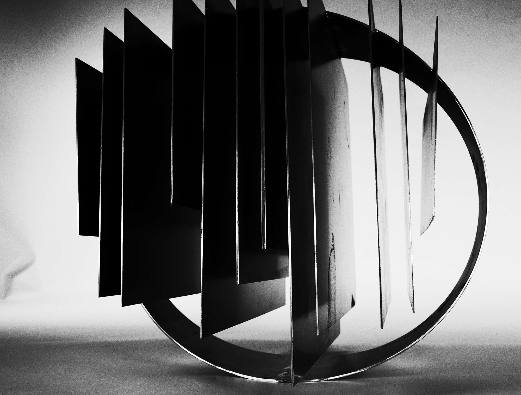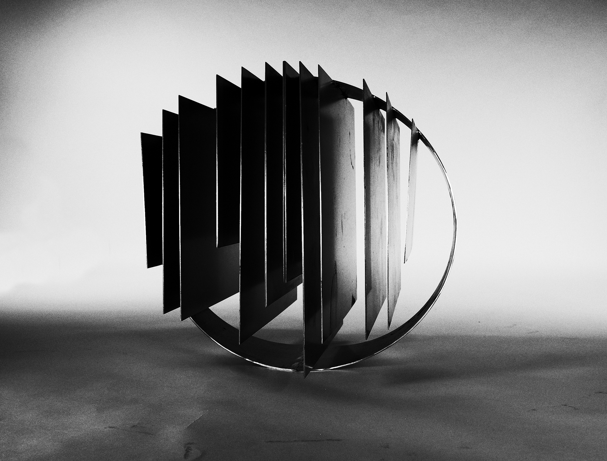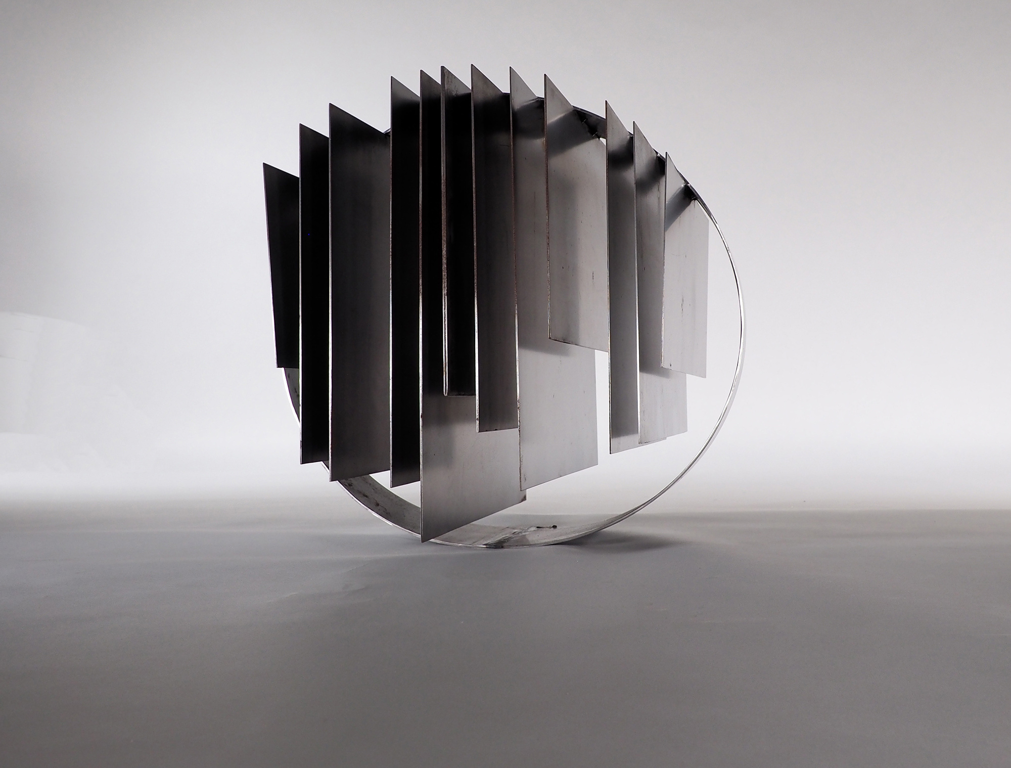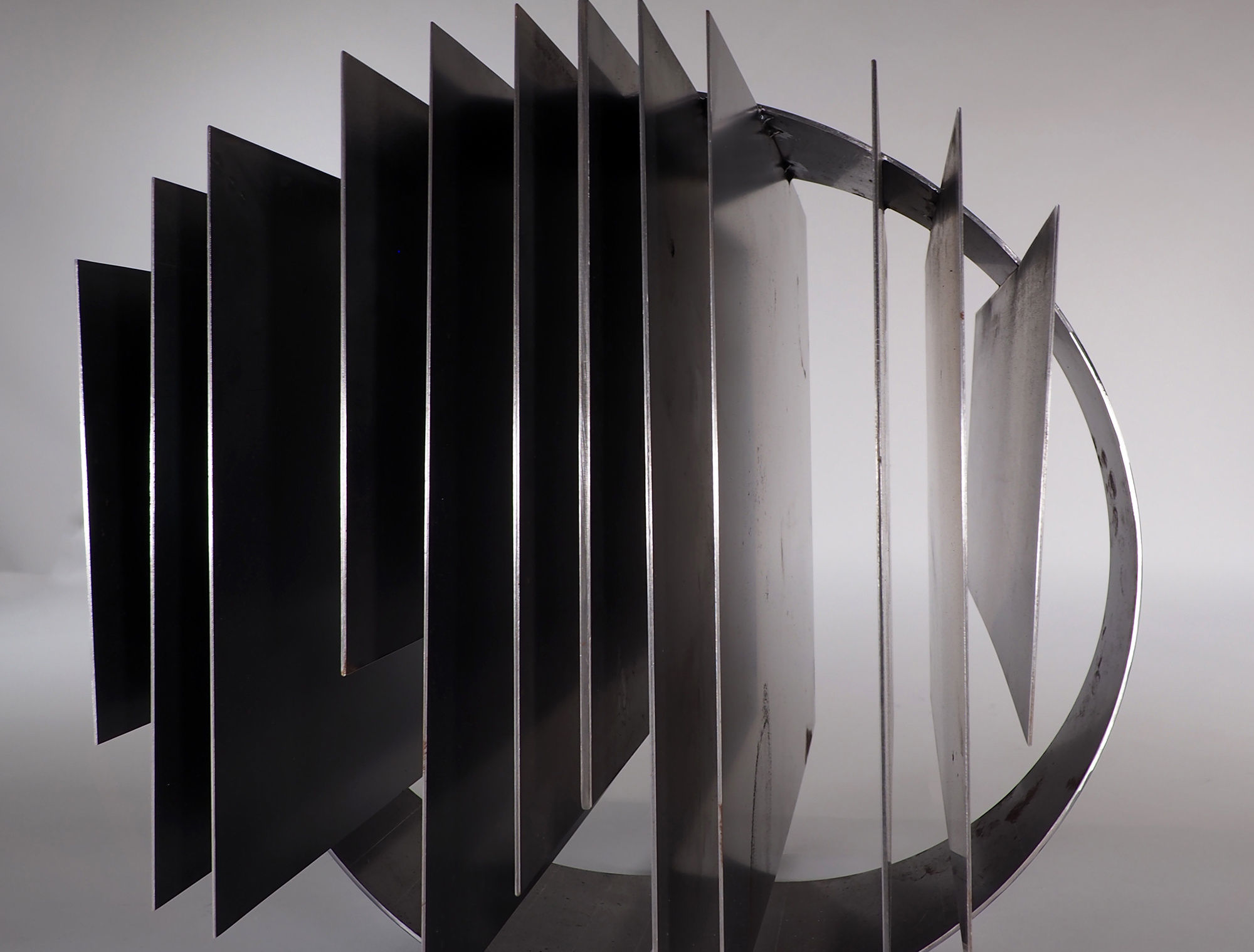 JIG is a three-dimensional element with a well-ordered, geometric, perfect circular ring shape, inside which steel plates of different thicknesses are suspended like barcodes at different heights.