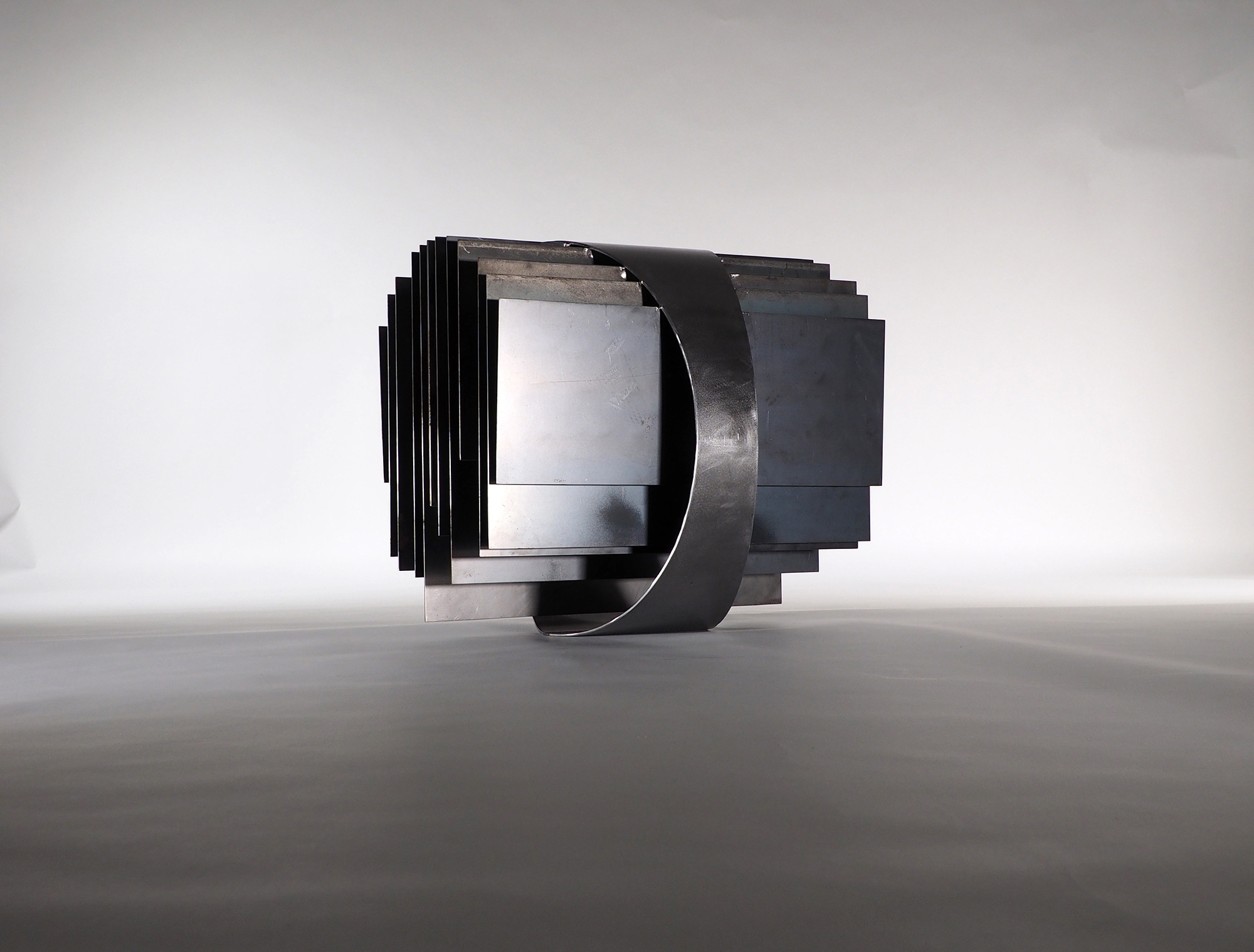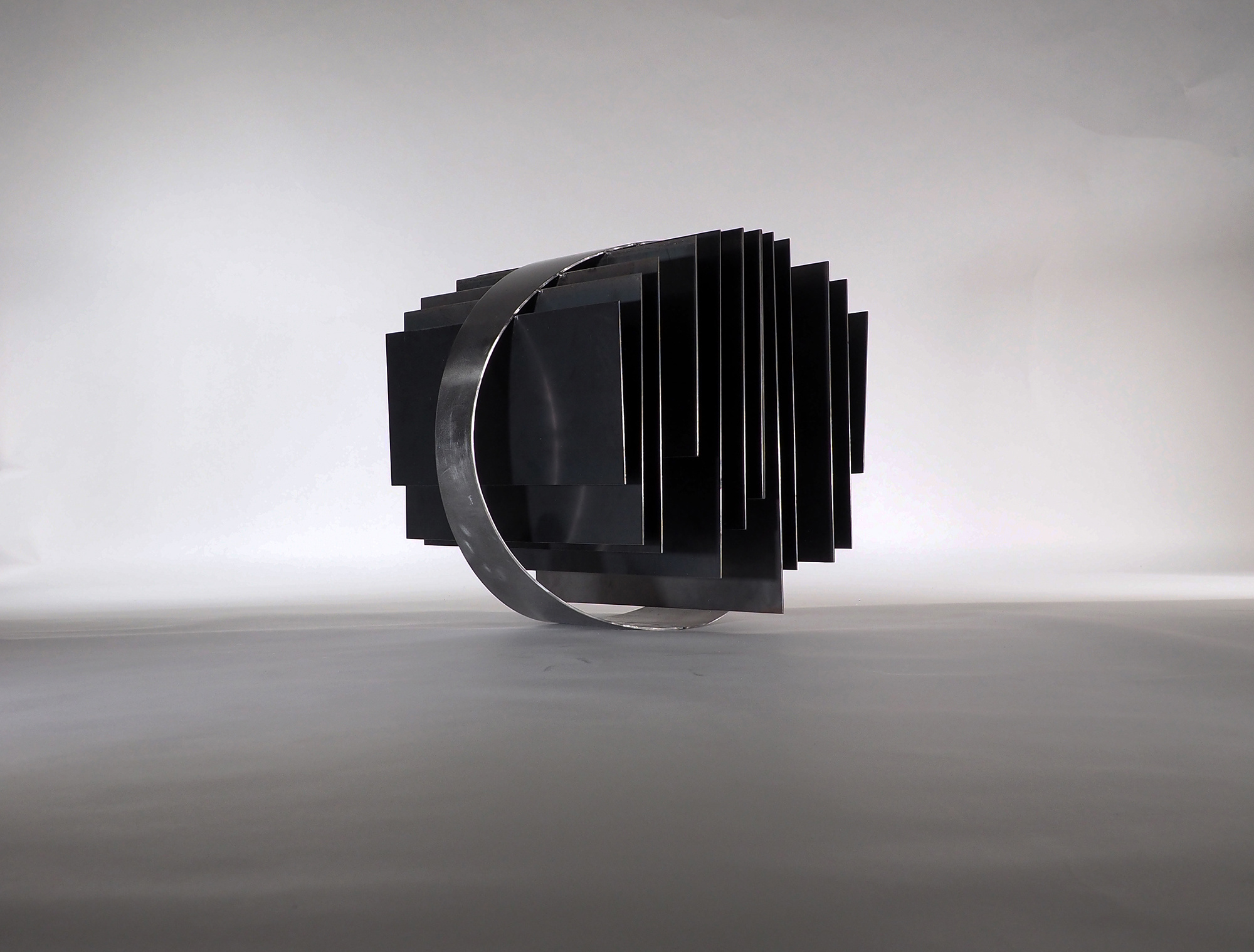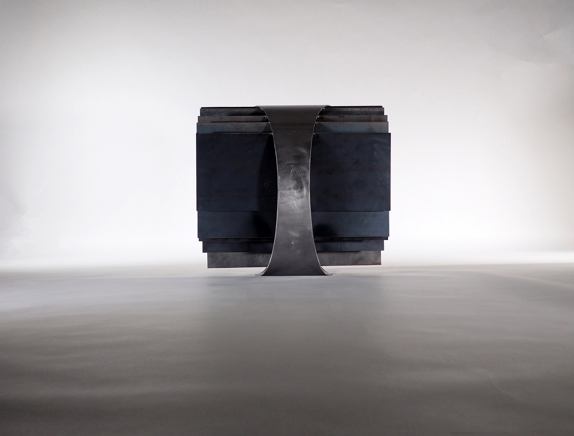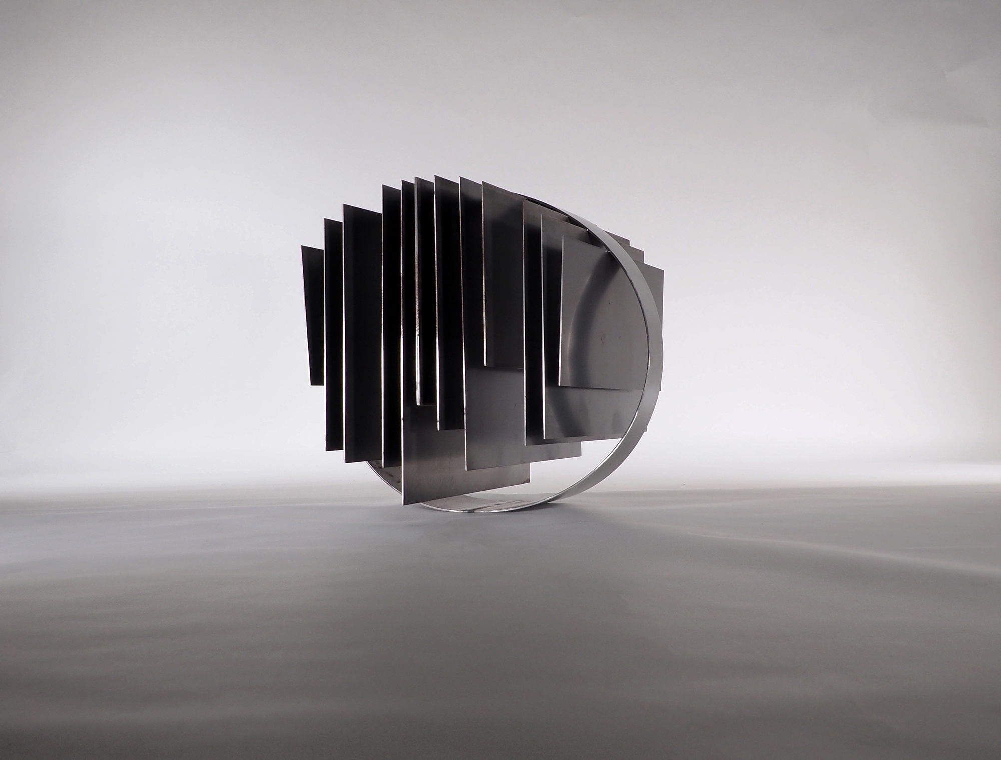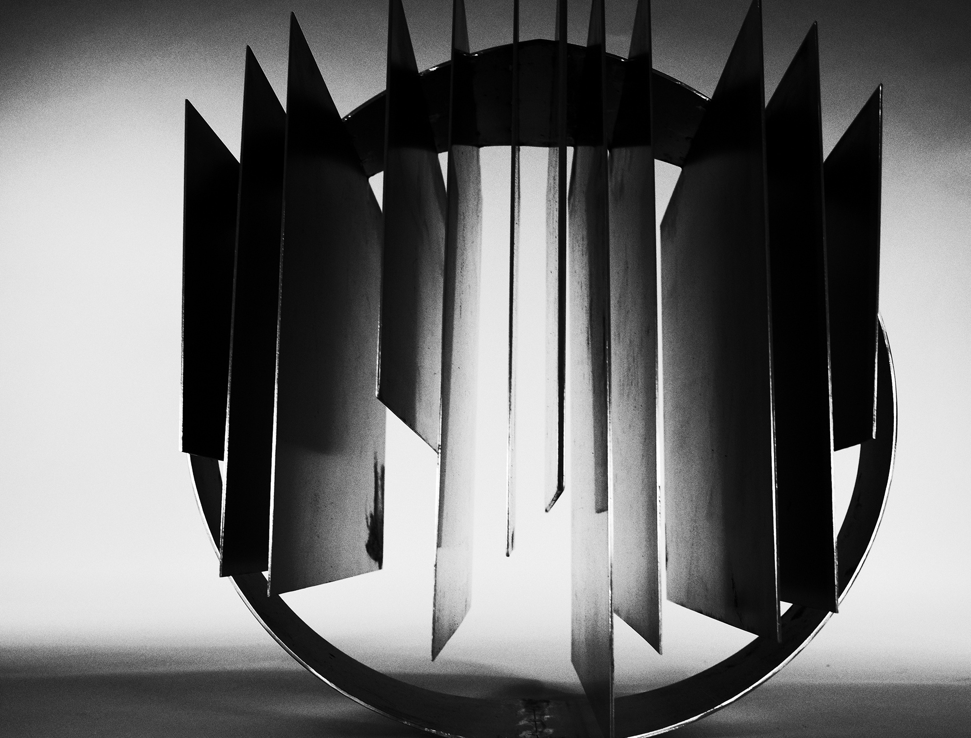 JIG is a three-dimensional element with a well-ordered, geometric, perfect circular ring shape, inside which steel plates of different thicknesses are suspended like barcodes at different heights.