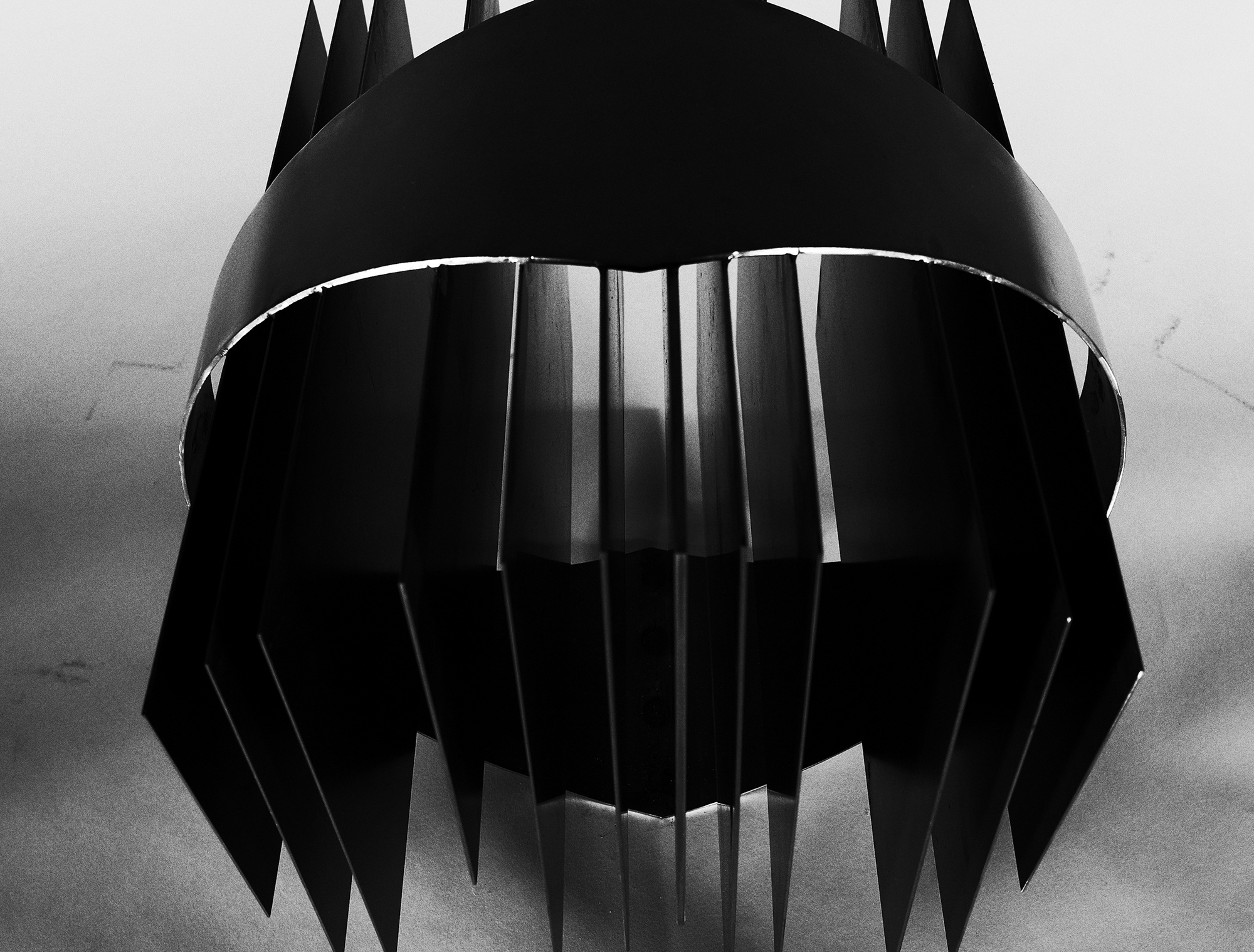 In addition, the outer ring is not a simple cylindrical shape, but is cut diagonally when viewed from the top. By doing so, the iron plates, which are hung in an orderly manner, appear to change their length and the amount of light reflected irregularly depending on the viewing angle.