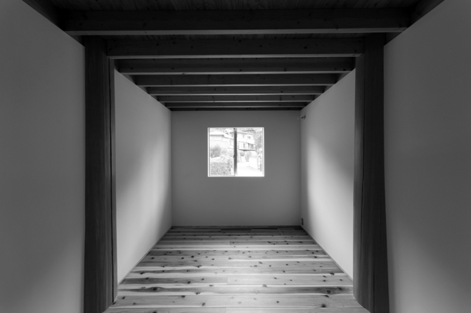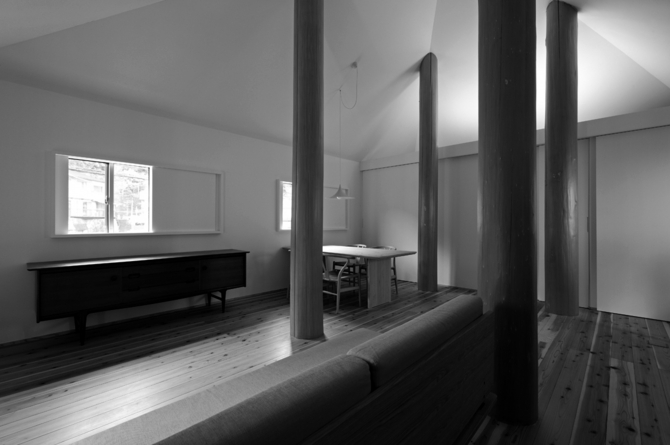 まず大地に四本の柱を立てることを決めた。最初に住宅の中心的な架構をつくり、そこを起点に住まいを構成していく。必ずしも住宅に象徴的な中心の場を作ることではなく、概念的な“中心”を内包した住宅のつくり方である。そしてこれは、旧広瀬家住宅のように甲府盆地東部に古くから見られる民家形式「四つ建て」に繋がる。更に古くは、竪穴式住居の四本の柱にも繋がると考える。その意味でも、この形式は、住宅建築の原型を表していると言えるだろう。