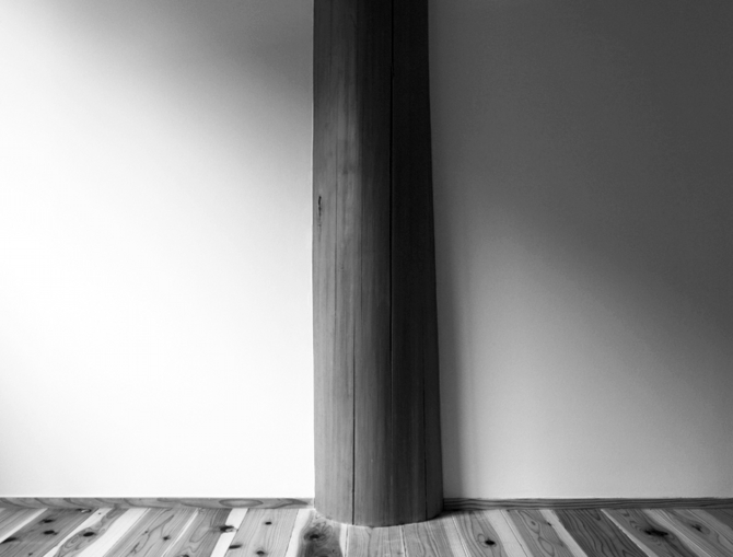 柱というものがどのように人間の生活に影響を及ぼすであろうか?その思いは、合理的な配置や寸法だけで決められていく現代の構造(柱)の在り方への疑問からも浮かび上がった。合理的に計算すれば、柱の太さは通常の105角で済んだであろう。だが、私は直径400を超える荒々しい杉丸太を選んだ。