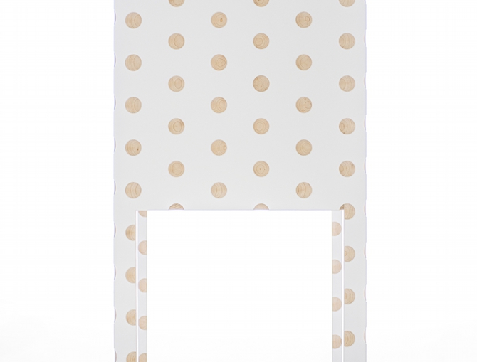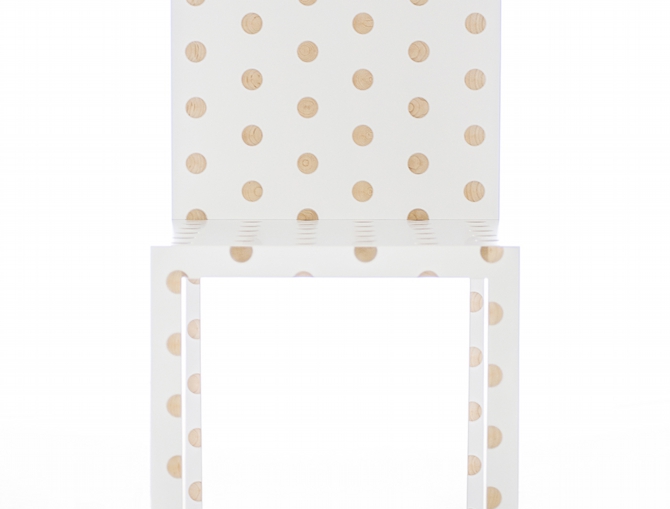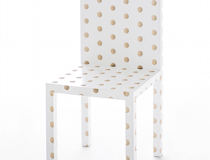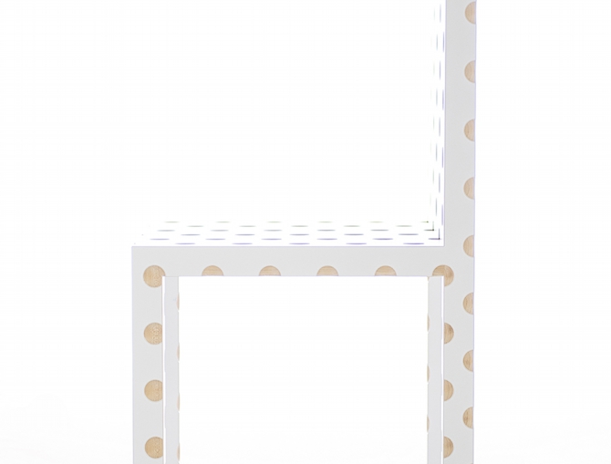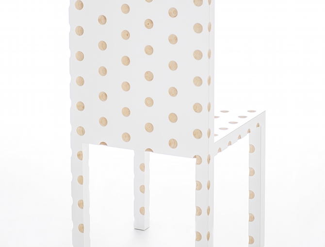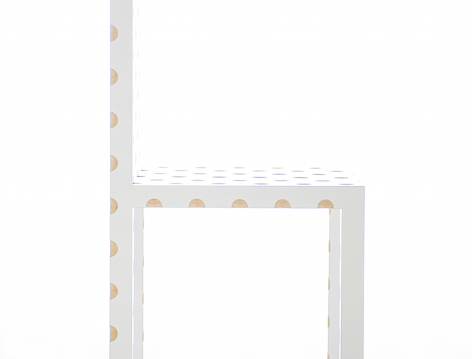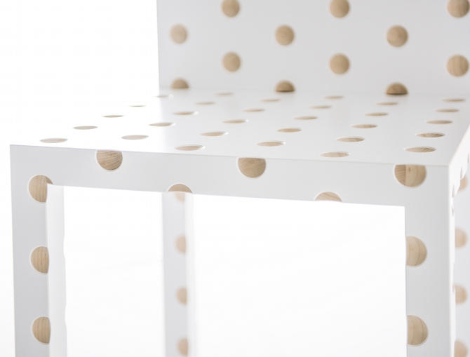 The chair called LYR, is a simple shape chair, made of a hard maple with a thickness of 40mm, covered by a white melamine resin facing plane. The hard maple underneath appears by cutting off the resin surface by a lots of sphere shapes composing a dotted pattern three dimensionally.