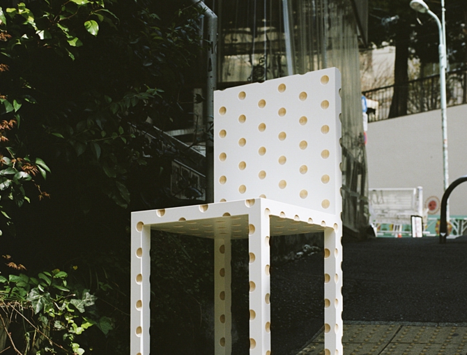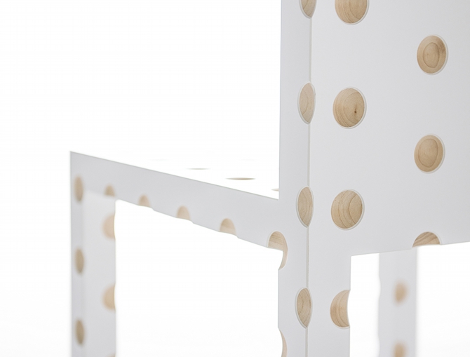 椅子にドットを施すために、すべての表面にメラミン板を貼り、特殊なルーターで圴一に球状の穴をあけた。そうすることで、さらに各部の在り方は均質になる一方、いわゆる椅子の触感は激変した。
