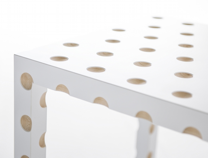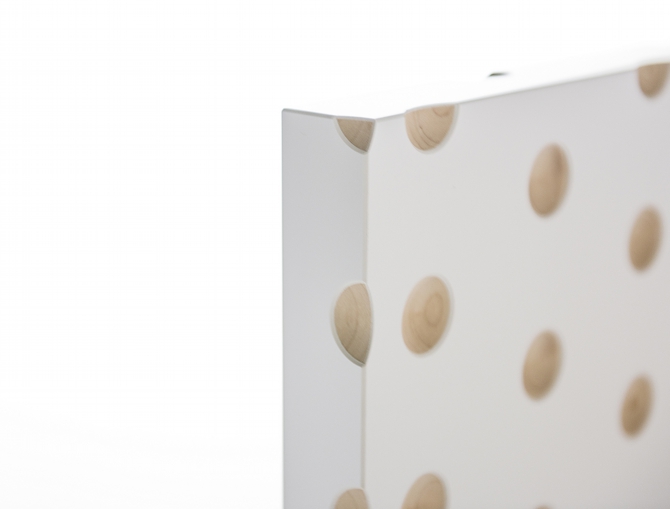 球状にあけられた穴からは、素地のハードメープルが見え、そして感じることもできる。表面のメラミン板は、経年による多少の色のくすみはあるものの、大きな色の変化は起こらない。それに対し、穴から見えるハードメープルは、無塗装にすることで、色などが経年変化して行く。メラミンを白にしたのも、当初のハードメープルの白さから経年変化していく際の色のコントラストを少しでも際立たせるためである。