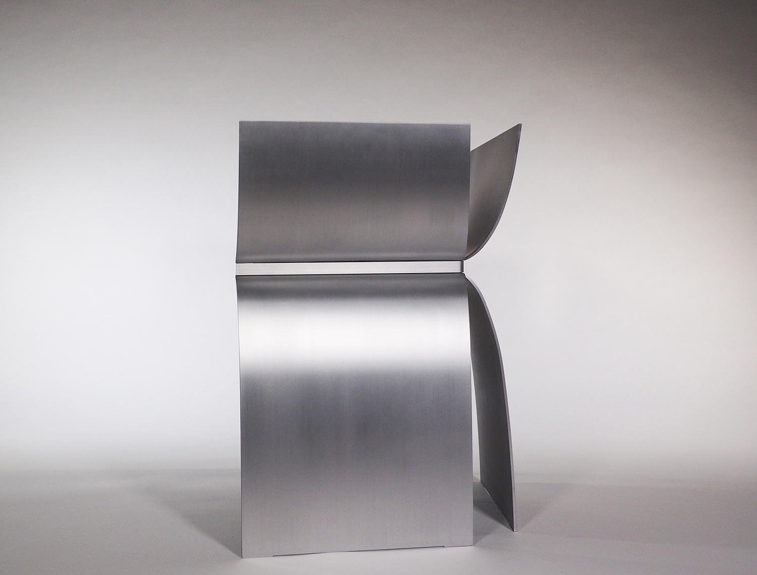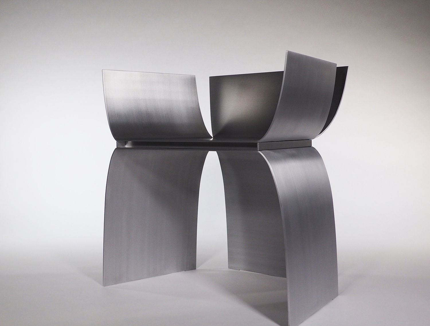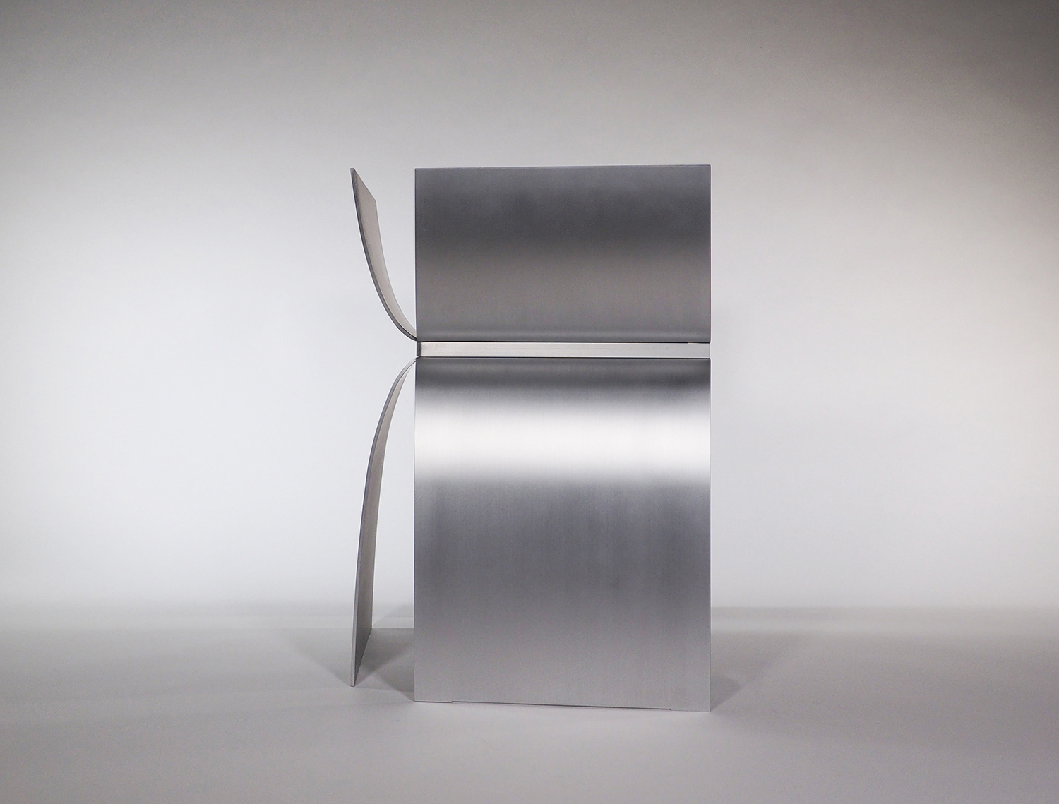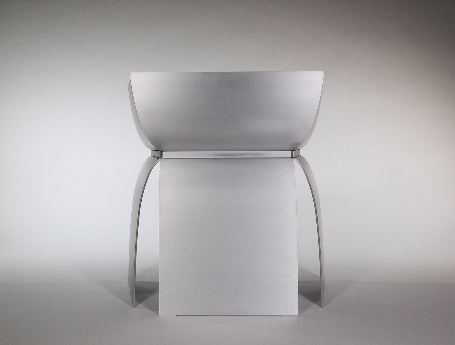 アルミニウムの溶接において、厚みを3mm以下にすると歪みの問題が生じることが経験上分かってきたので、薄くしても4mm厚を使用することが多い。今回の形状は前面の座面下が開いており、構造的な不安が残っていた。最初に図面化した際に、側板をとりあえず5mm厚で設定し、試作を作りながら厚みを上げていくことを考えていた。しかし、色々な製作方法の検討を重ねることで、当初の5mm厚で構造的に全く問題なく出来ることが分かった。また意外なことに、今までデザインしてきたアルミニウム製の椅子の中で構造的に最も強い形状の一つとなり、100kgの体重が掛かっても全く問題なかったのは驚きであった。