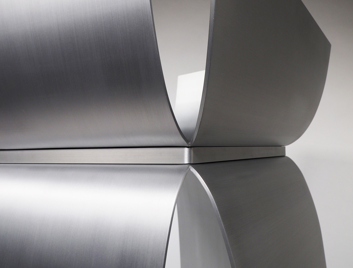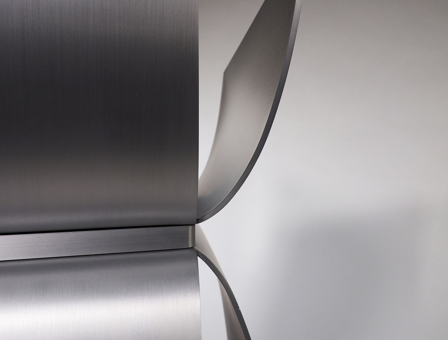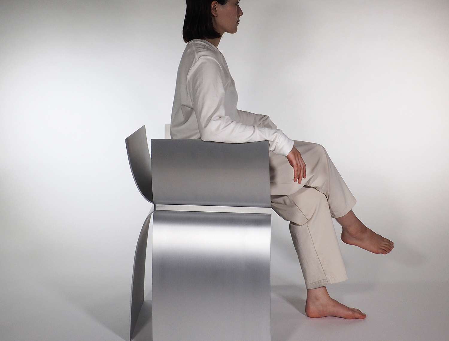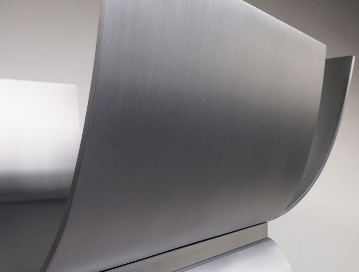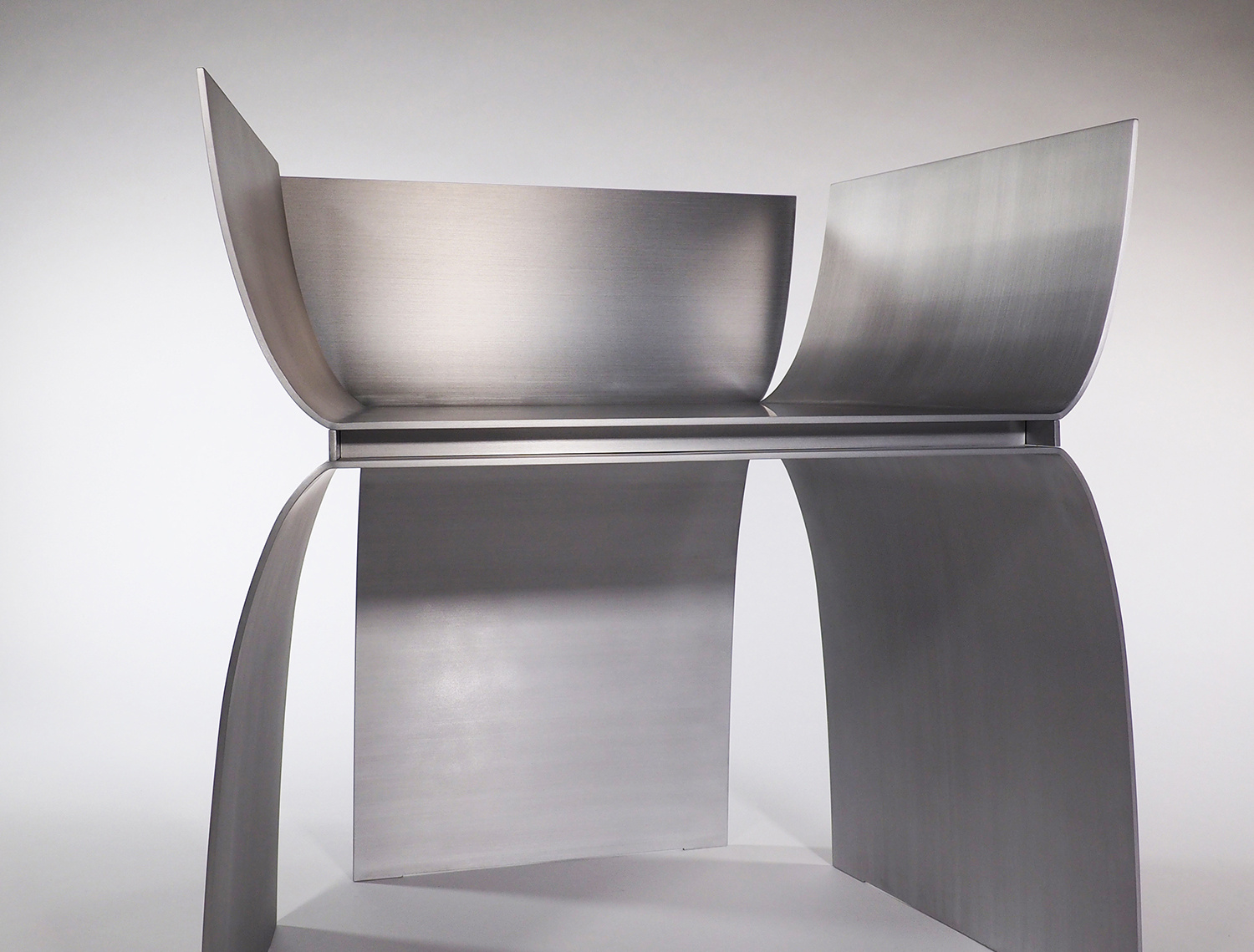 アルミニウムの溶接において、厚みを3mm以下にすると歪みの問題が生じることが経験上分かってきたので、薄くしても4mm厚を使用することが多い。今回の形状は前面の座面下が開いており、構造的な不安が残っていた。最初に図面化した際に、側板をとりあえず5mm厚で設定し、試作を作りながら厚みを上げていくことを考えていた。しかし、色々な製作方法の検討を重ねることで、当初の5mm厚で構造的に全く問題なく出来ることが分かった。また意外なことに、今までデザインしてきたアルミニウム製の椅子の中で構造的に最も強い形状の一つとなり、100kgの体重が掛かっても全く問題なかったのは驚きであった。