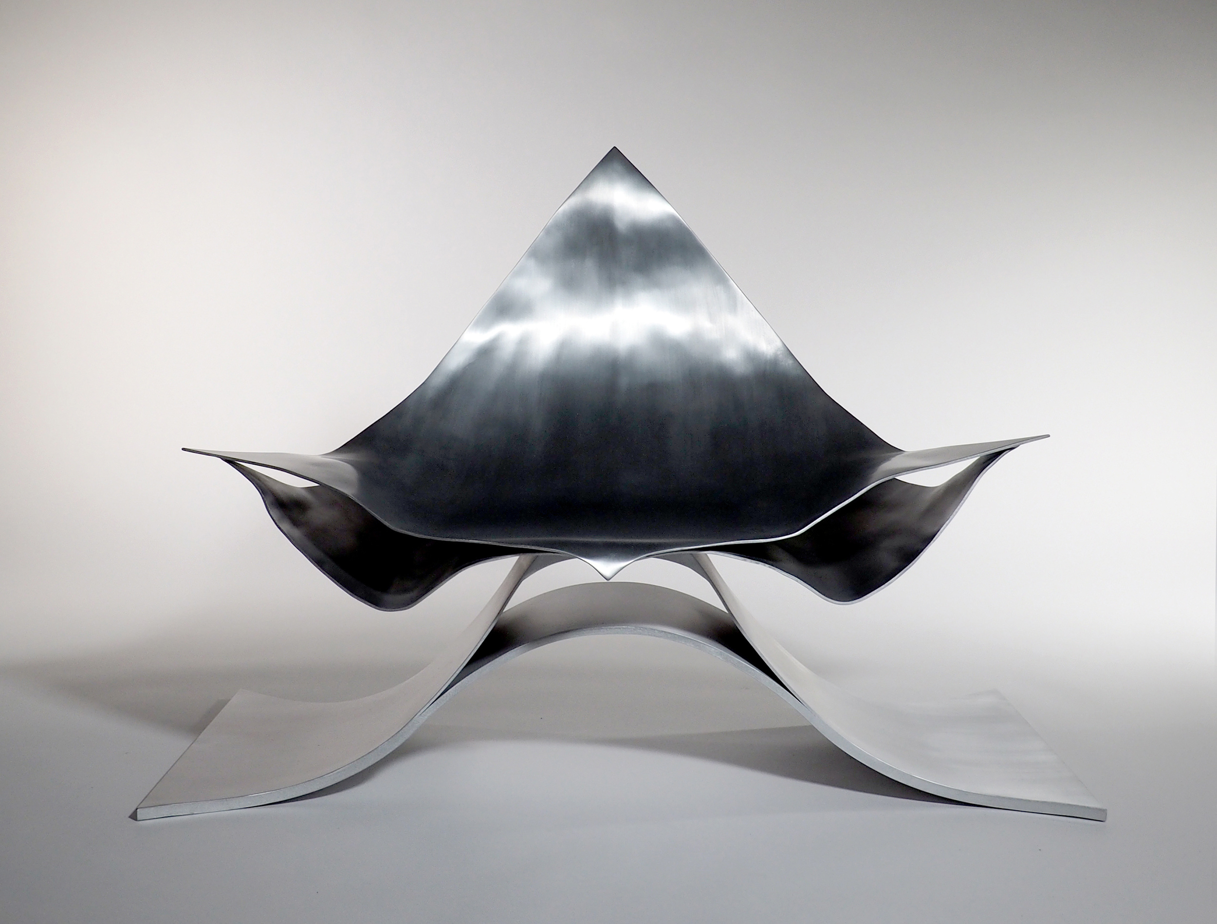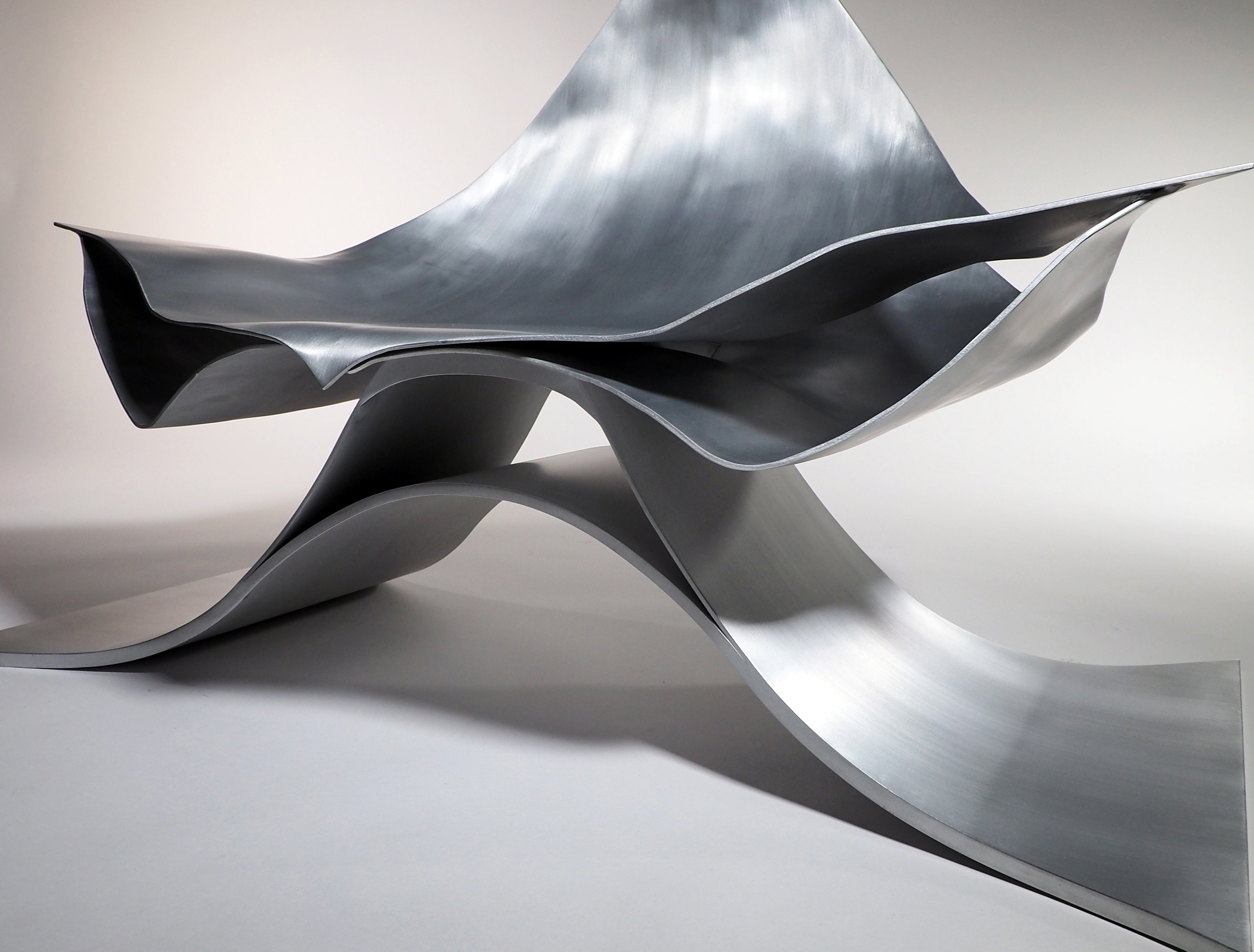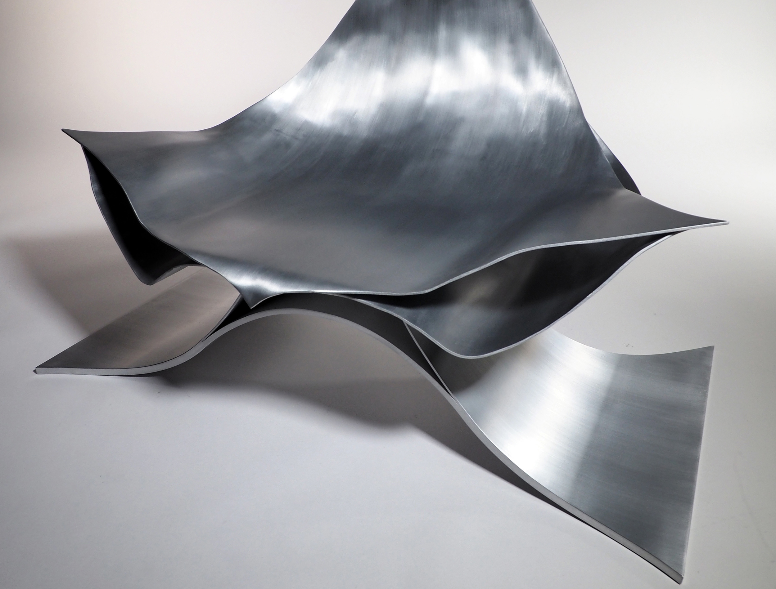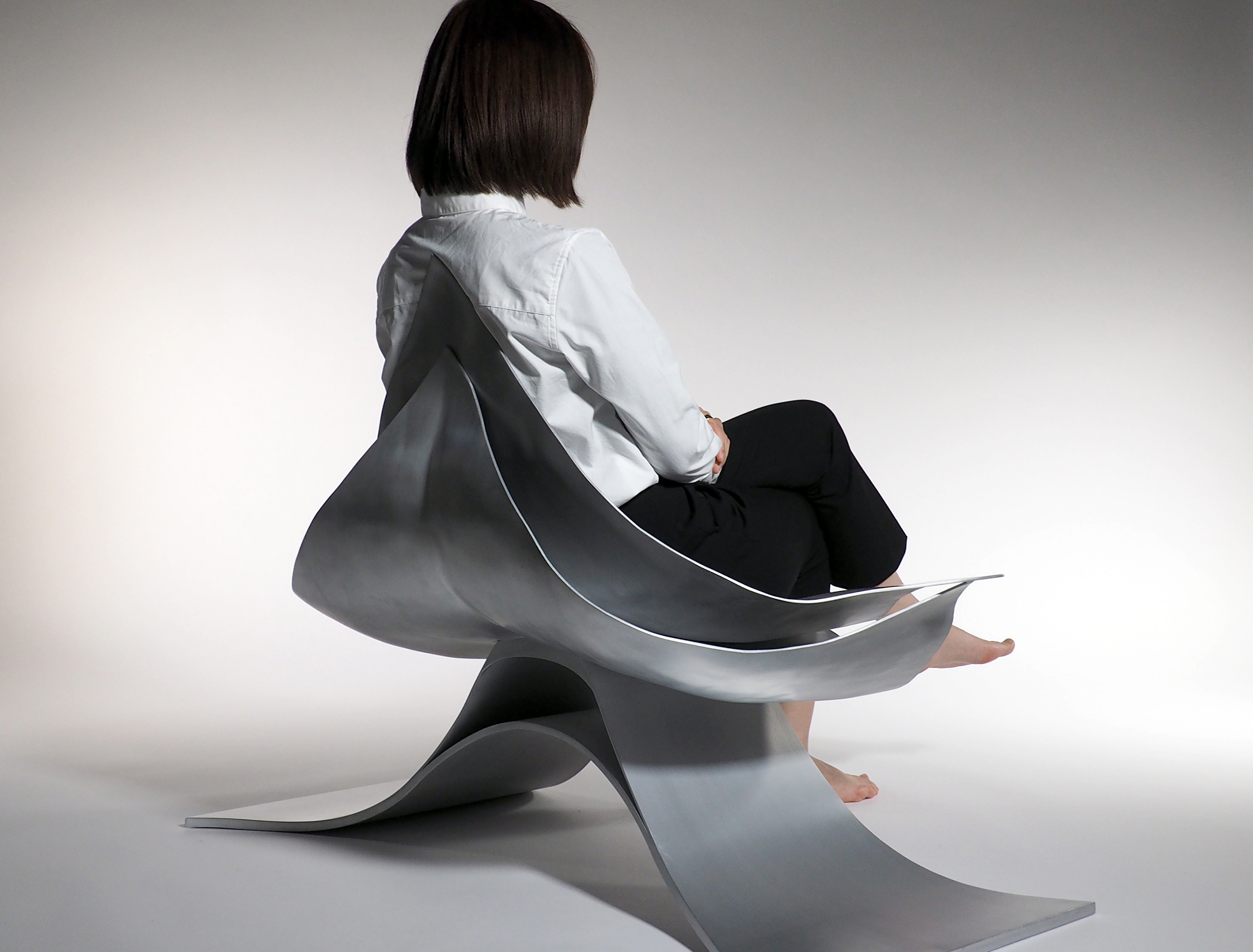 アルミニウム板を三次曲面加工することで生まれる表面の流れるような表情は、実に美しく、優しい表情をもっている。この美しさと優しさを保ちながら、薄いアルミニウム板を最小限重ねることで、100kgの重さにも耐えられるラウンジチェーが出来ないかと思った。