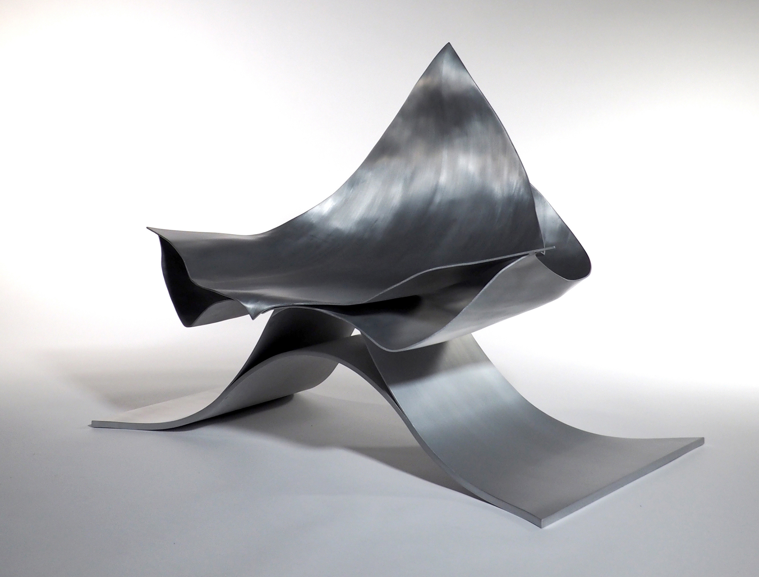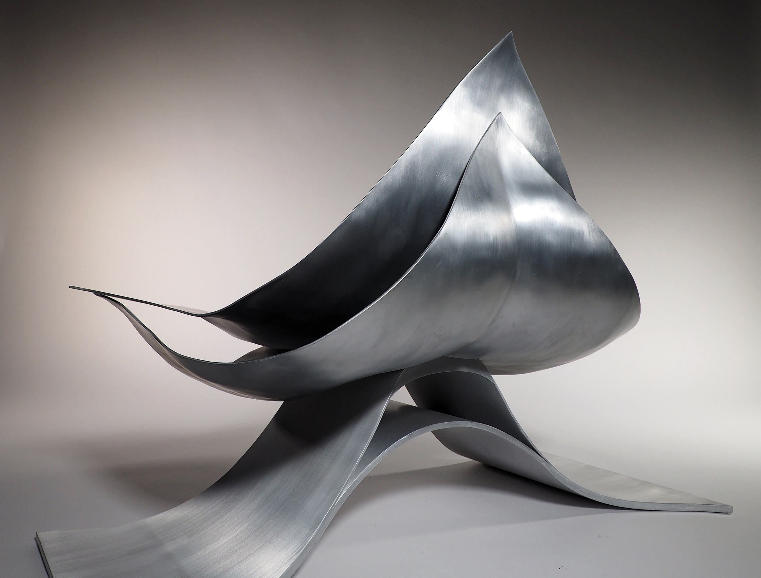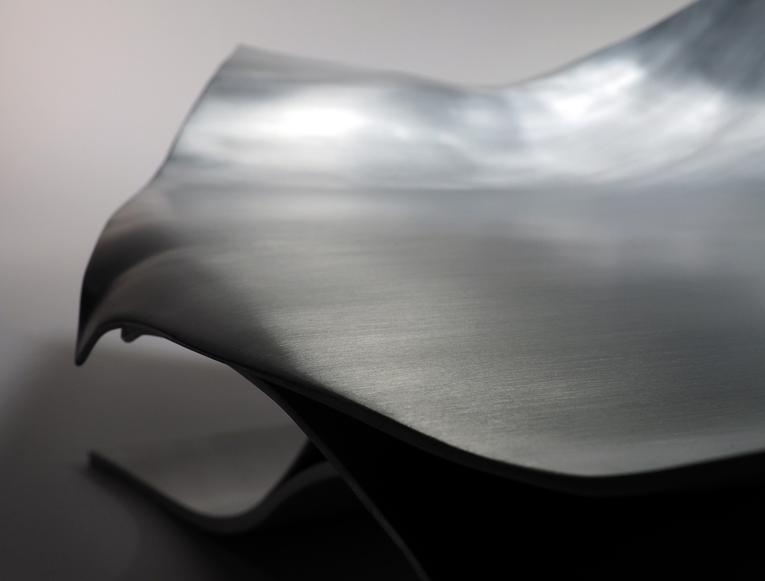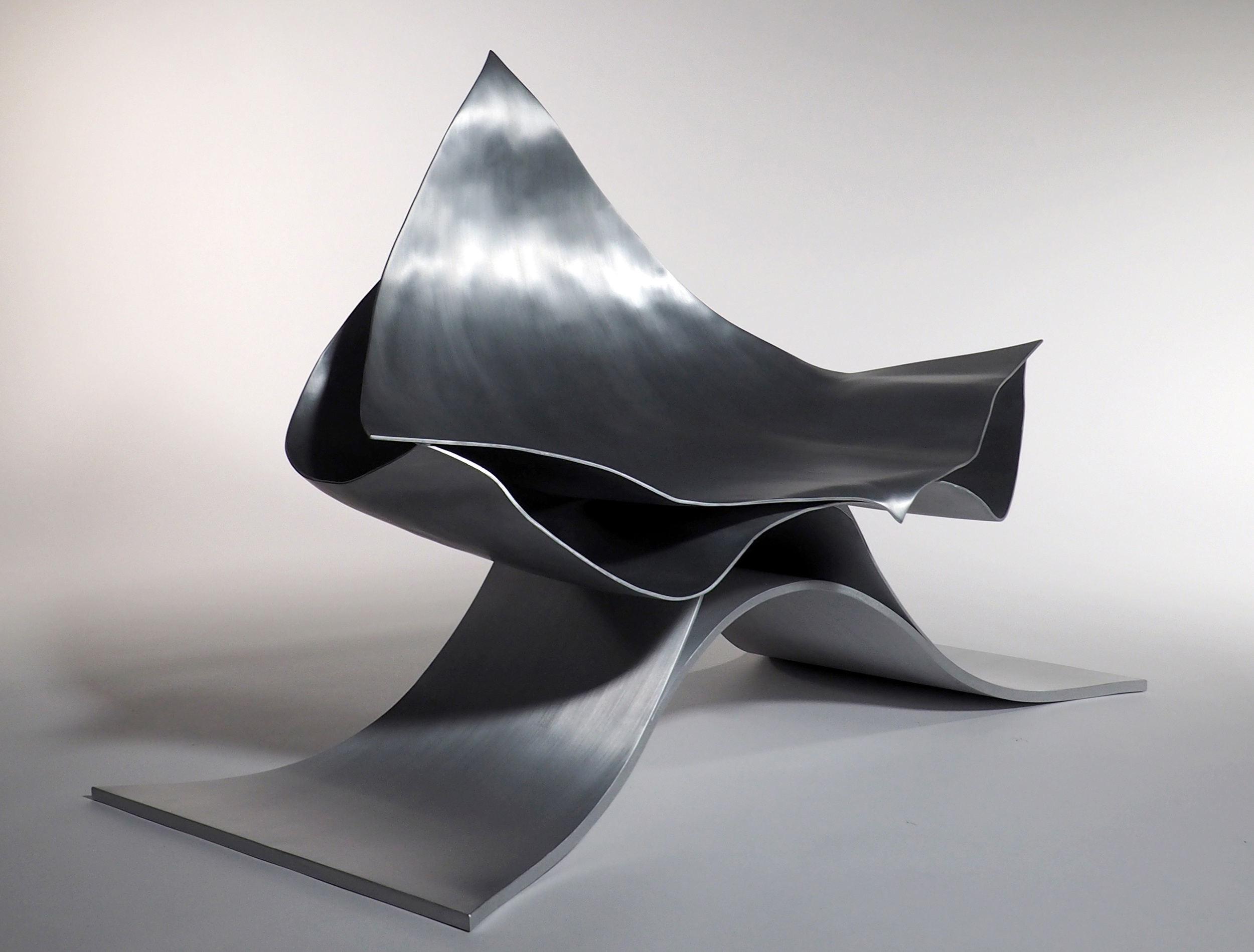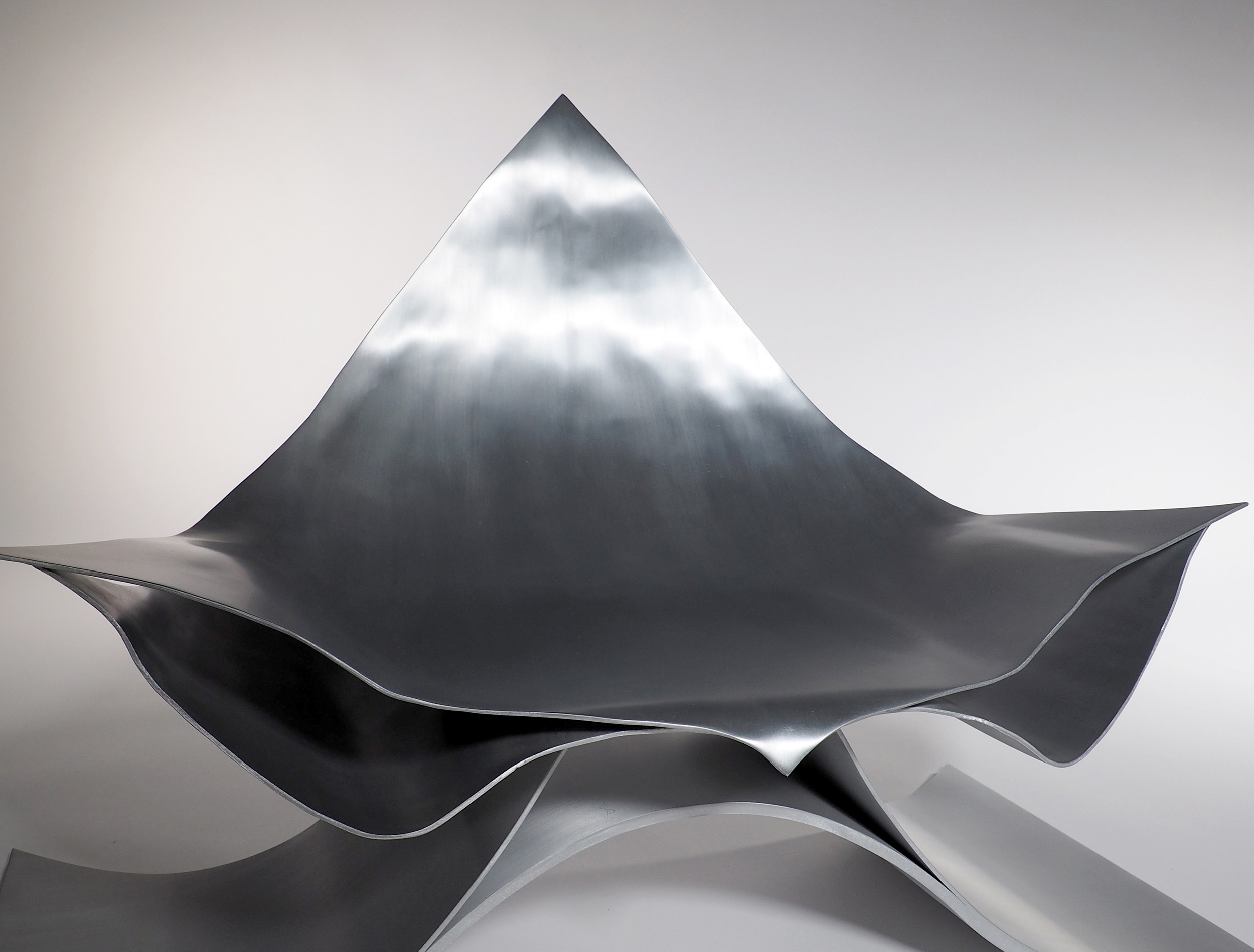アルミニウム板を三次曲面加工することで生まれる表面の流れるような表情は、実に美しく、優しい表情をもっている。この美しさと優しさを保ちながら、薄いアルミニウム板を最小限重ねることで、100kgの重さにも耐えられるラウンジチェーが出来ないかと思った。