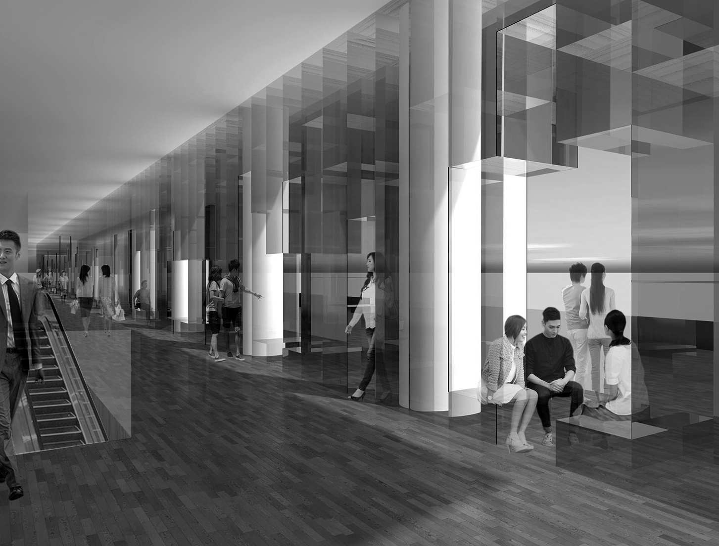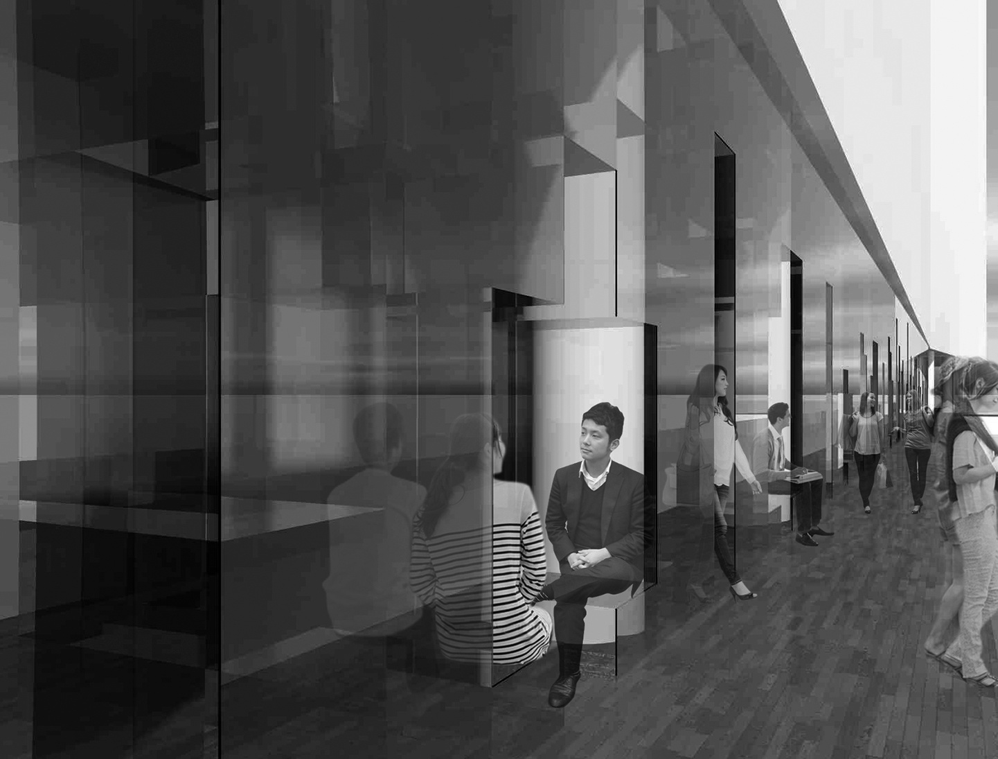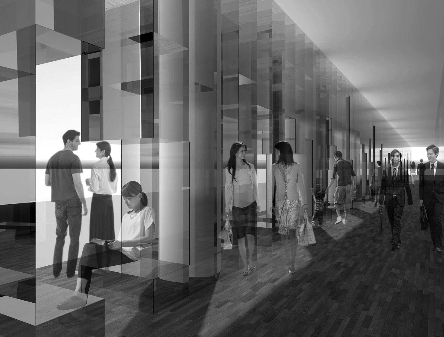 そこで我々は、歩行者通路空間に、このパノラマビューを楽しみながら憩い、そしてアートを体験できるアートギャラリー空間を提案します。アートギャラリーは、幅1.2m、高さ5mの透明なガラス壁が112枚、70cm間隔で立ち並び、その間を様々な高さのガラスの棚で繋がれた、長いディスプレイ・ウォールを中心に構成されています。