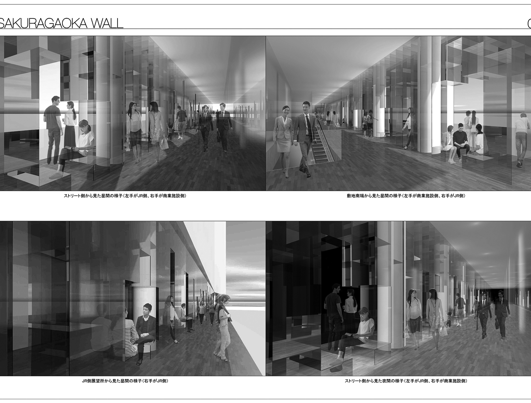 また、このギャラリー空間を構成する長い壁としてのディスプレイ・ウォールは、大きなスクリーンとしても機能し、提案場所の歩行空間からだけでなく、JRのプラットホームや周辺環境から眺めることのできる「都市のスクリーン」として、街に賑わいをもたらすことでしょう。