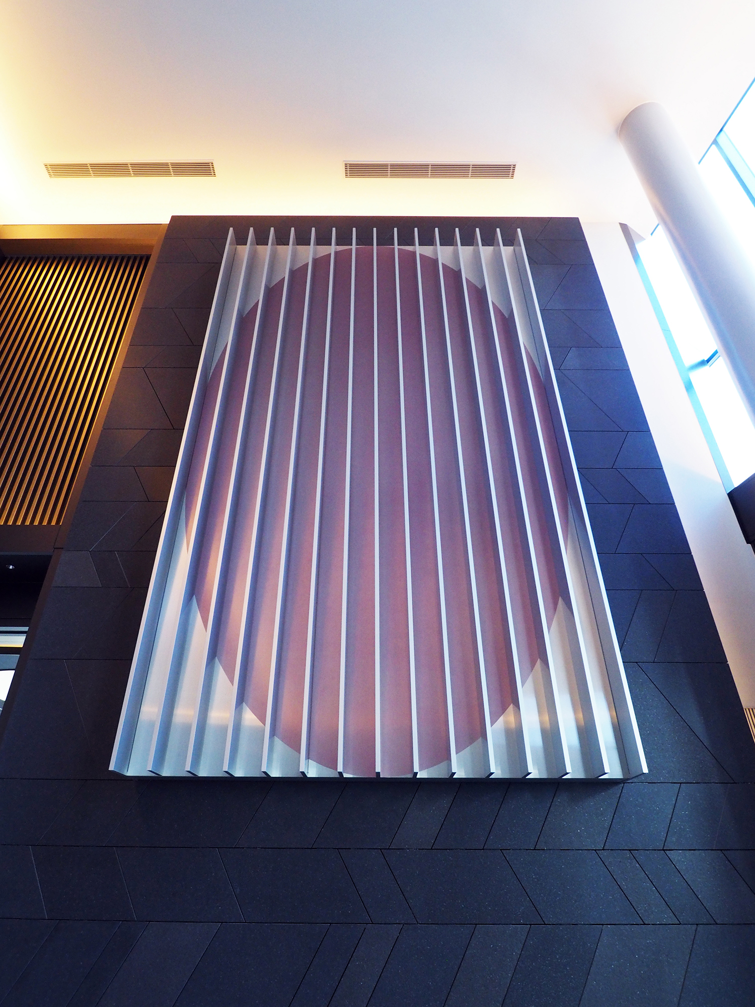 この作品は、建物のグランドエントランスに設置した高さ5m、幅3mの巨大な金属製の立体である。