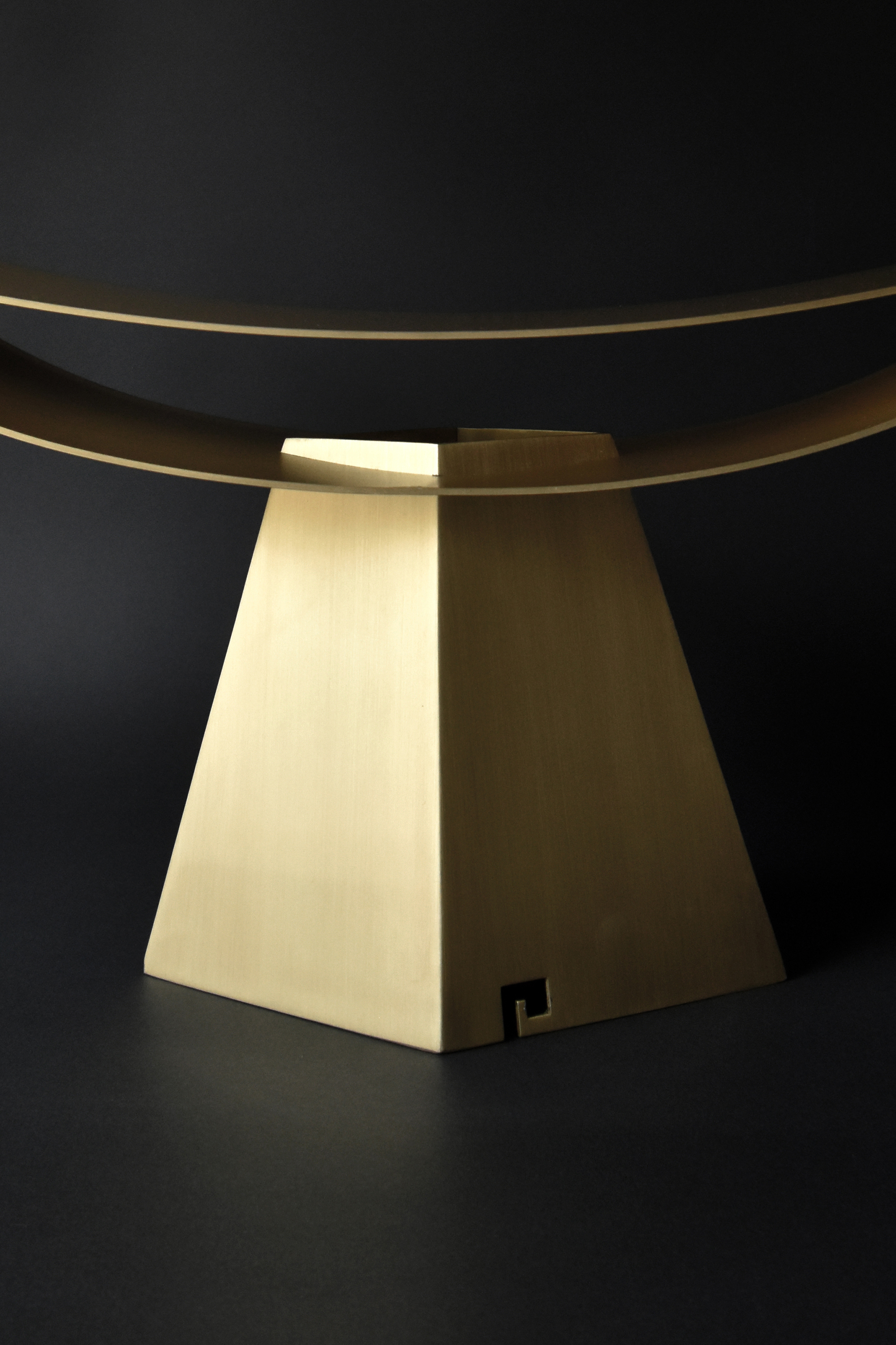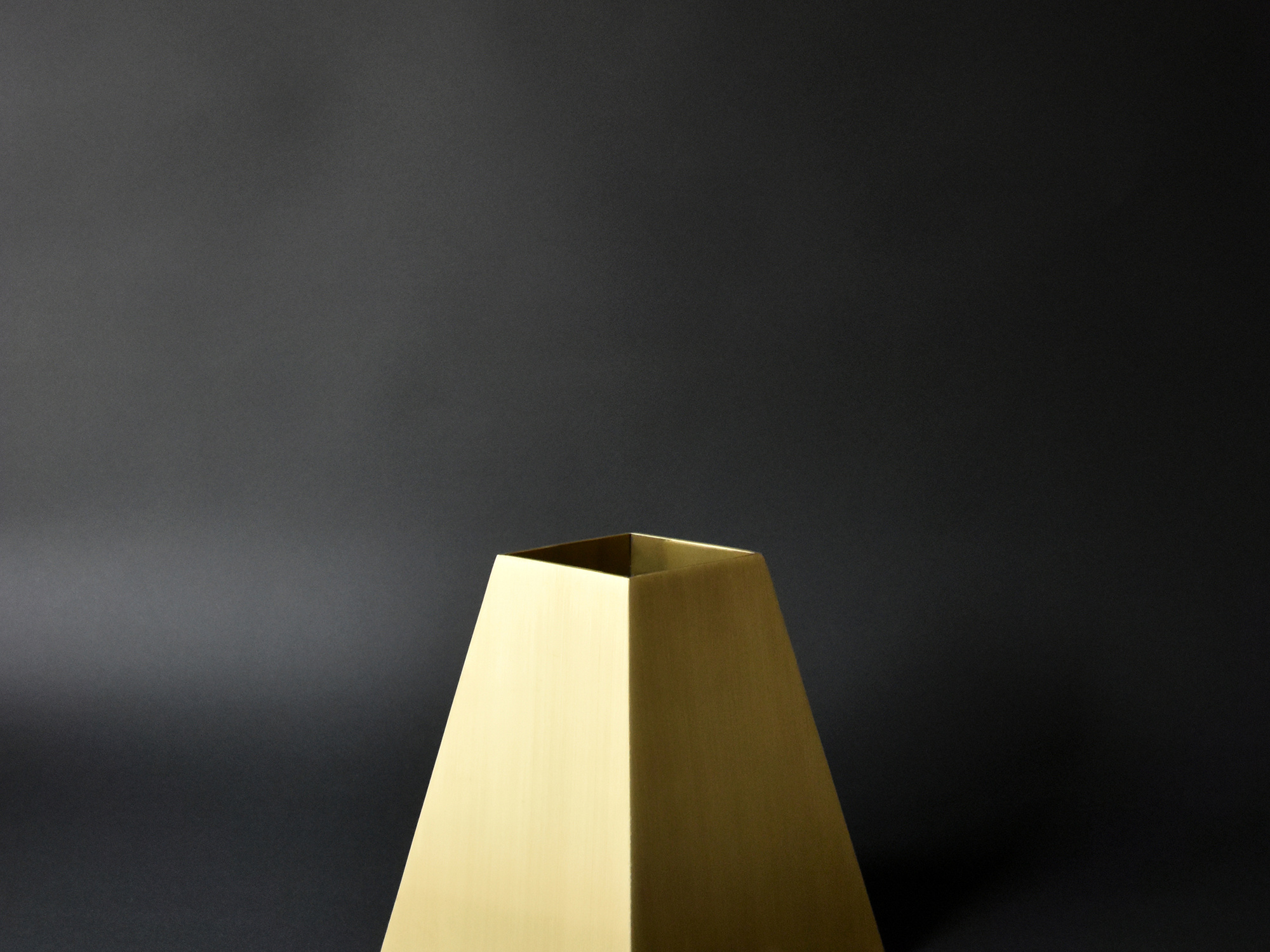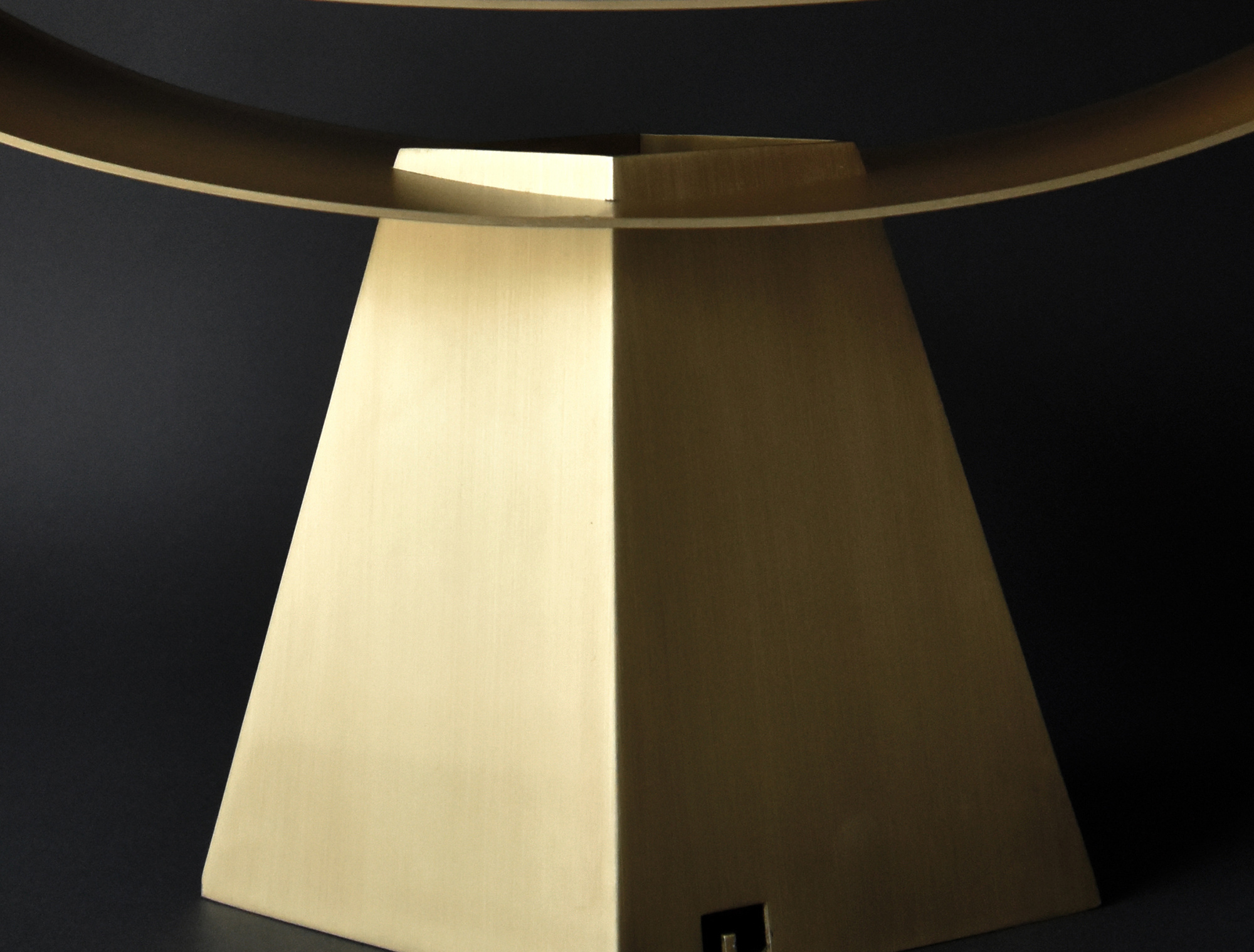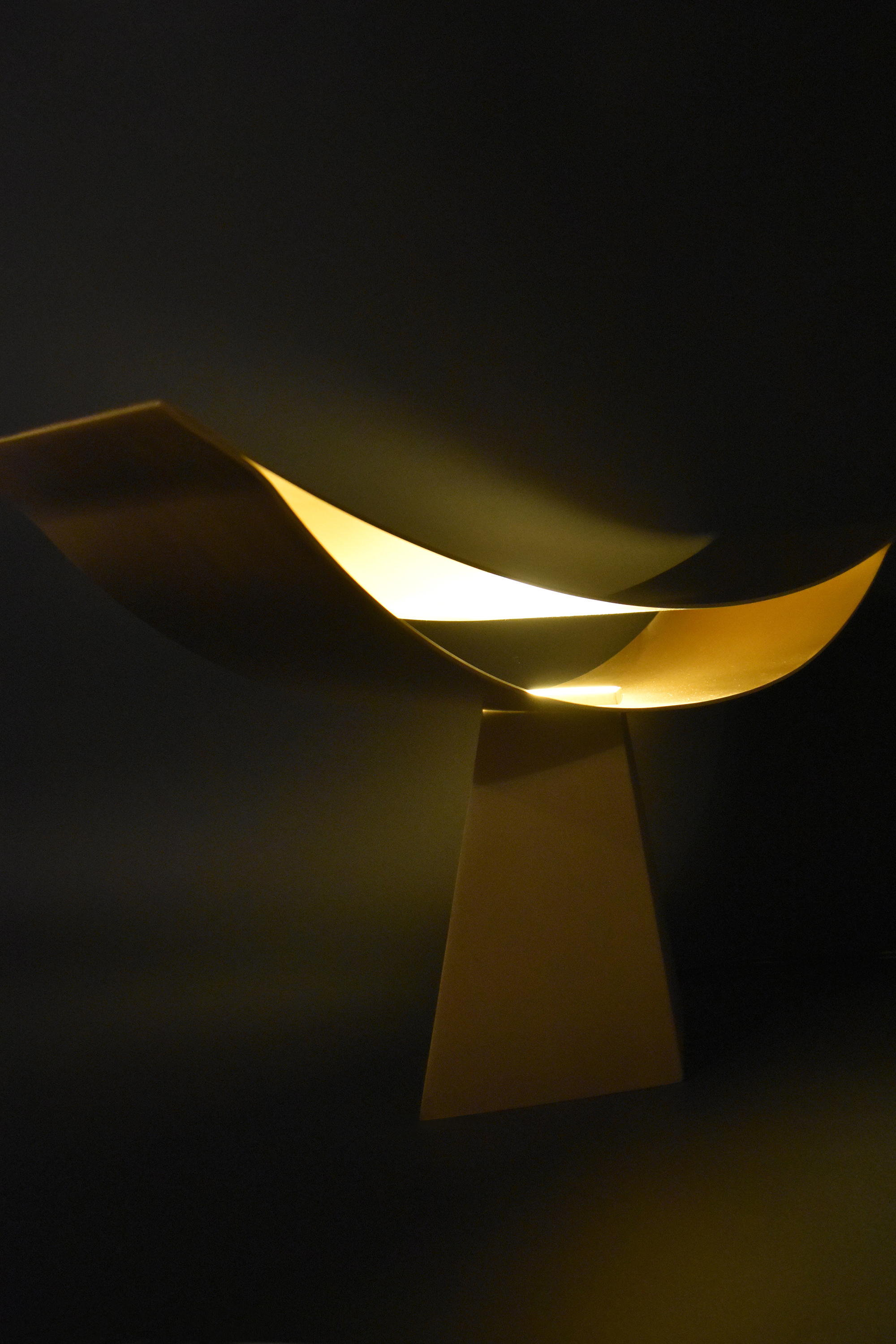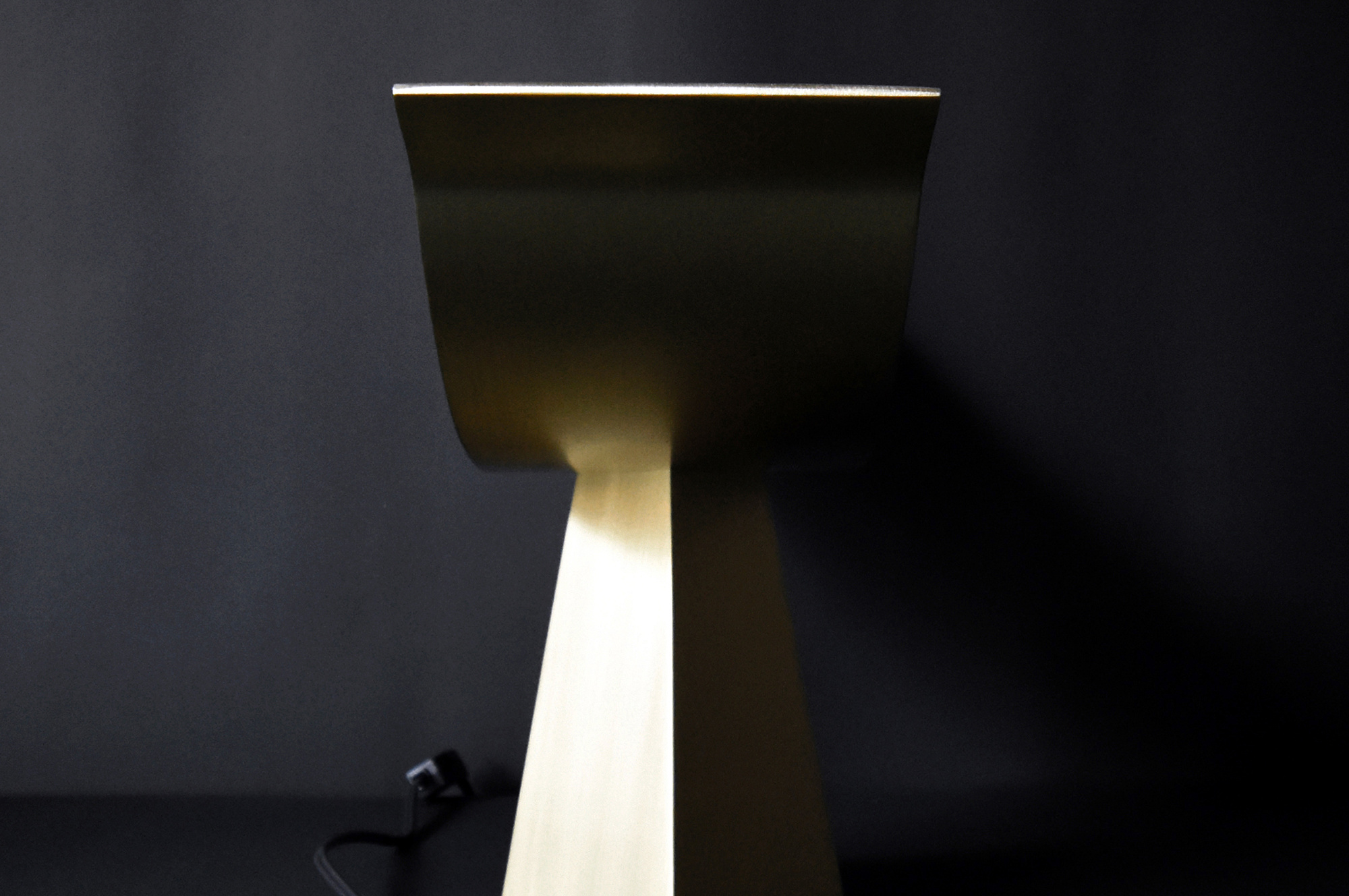 「ALUMINA」(アルミニウムの椅子シリーズ)で実験してきた薄い二枚の曲面で成り立たせる構造の可能性を照明に応用したもので、今回は、アルミニウムより真鍮の方が、温かな光との相性が良いと判断した。