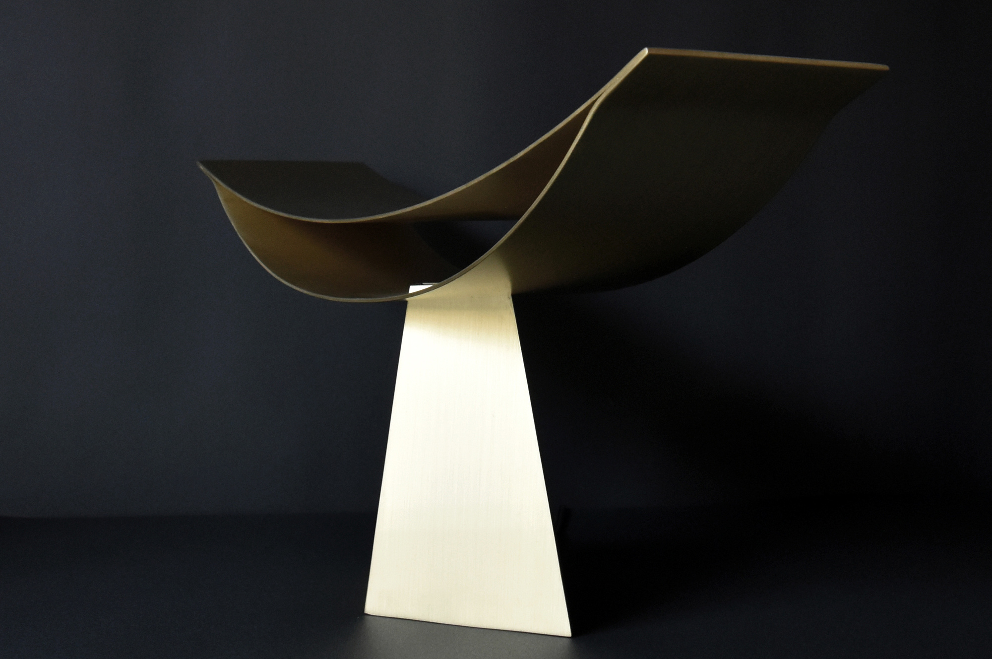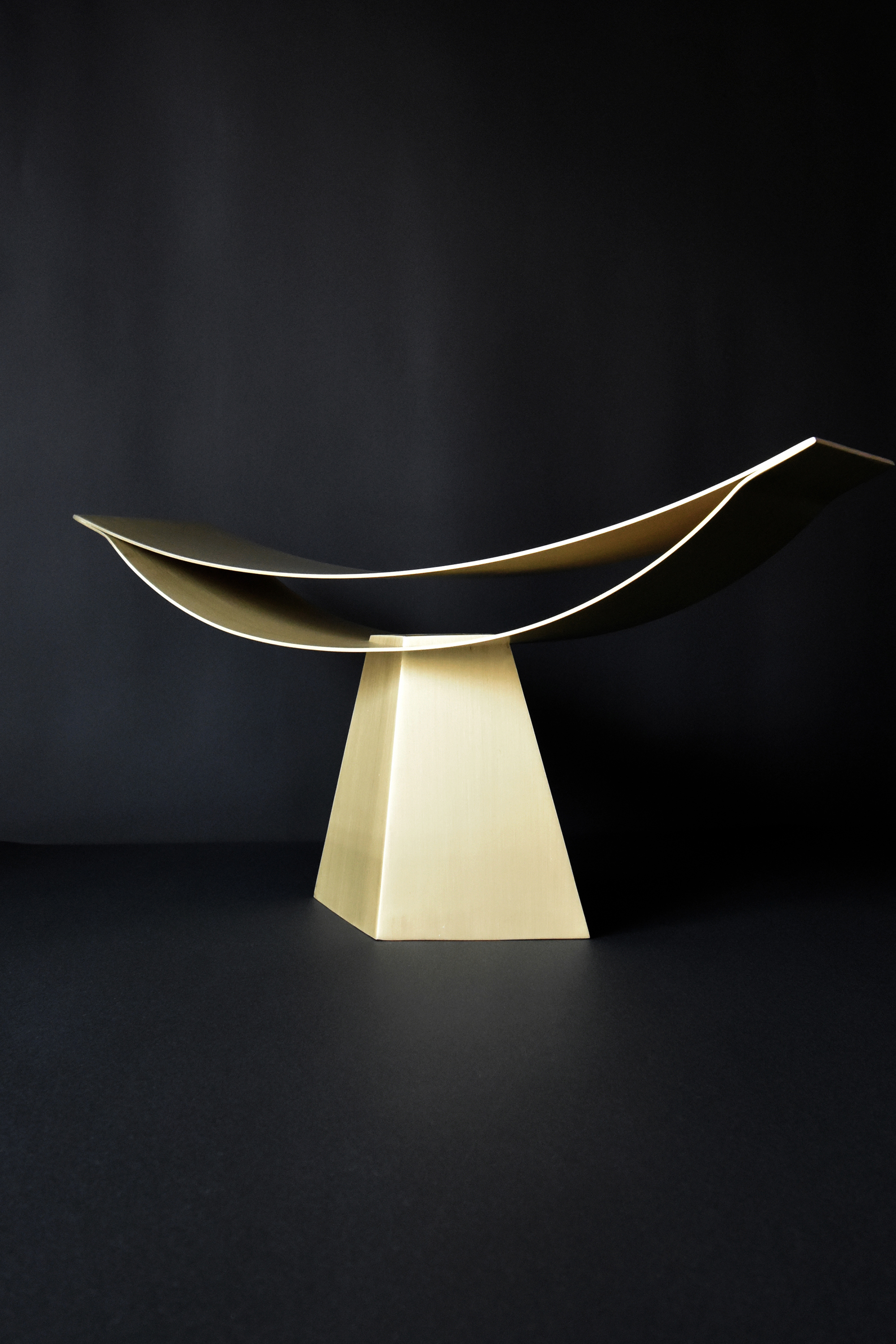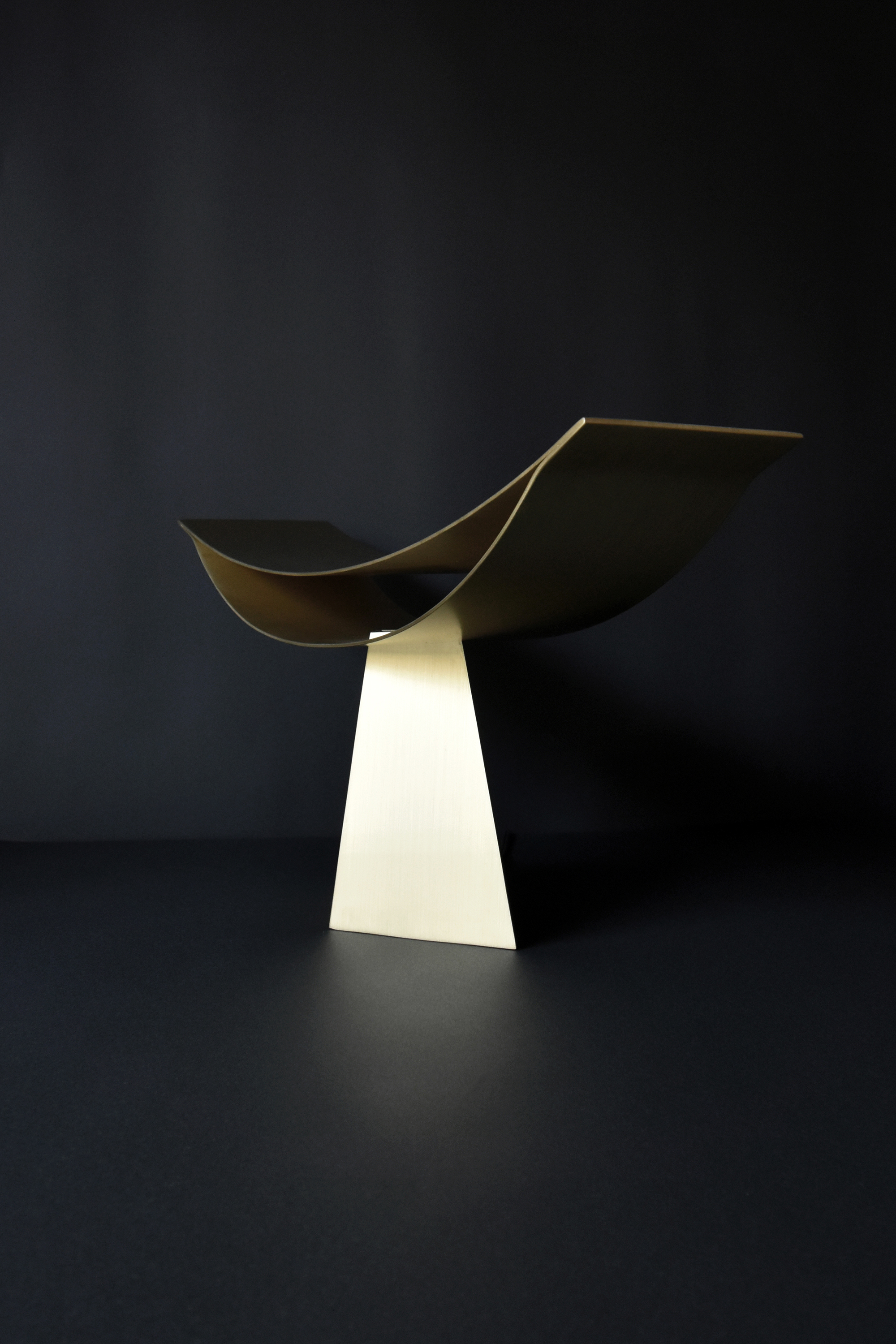 This lighting fixture applies the possibilities of a structure made up of two thin, curved surfaces, which I experimented with in "ALUMINA" aluminum chair series. This time, I determined that brass works better than aluminum for creating a warm light.
