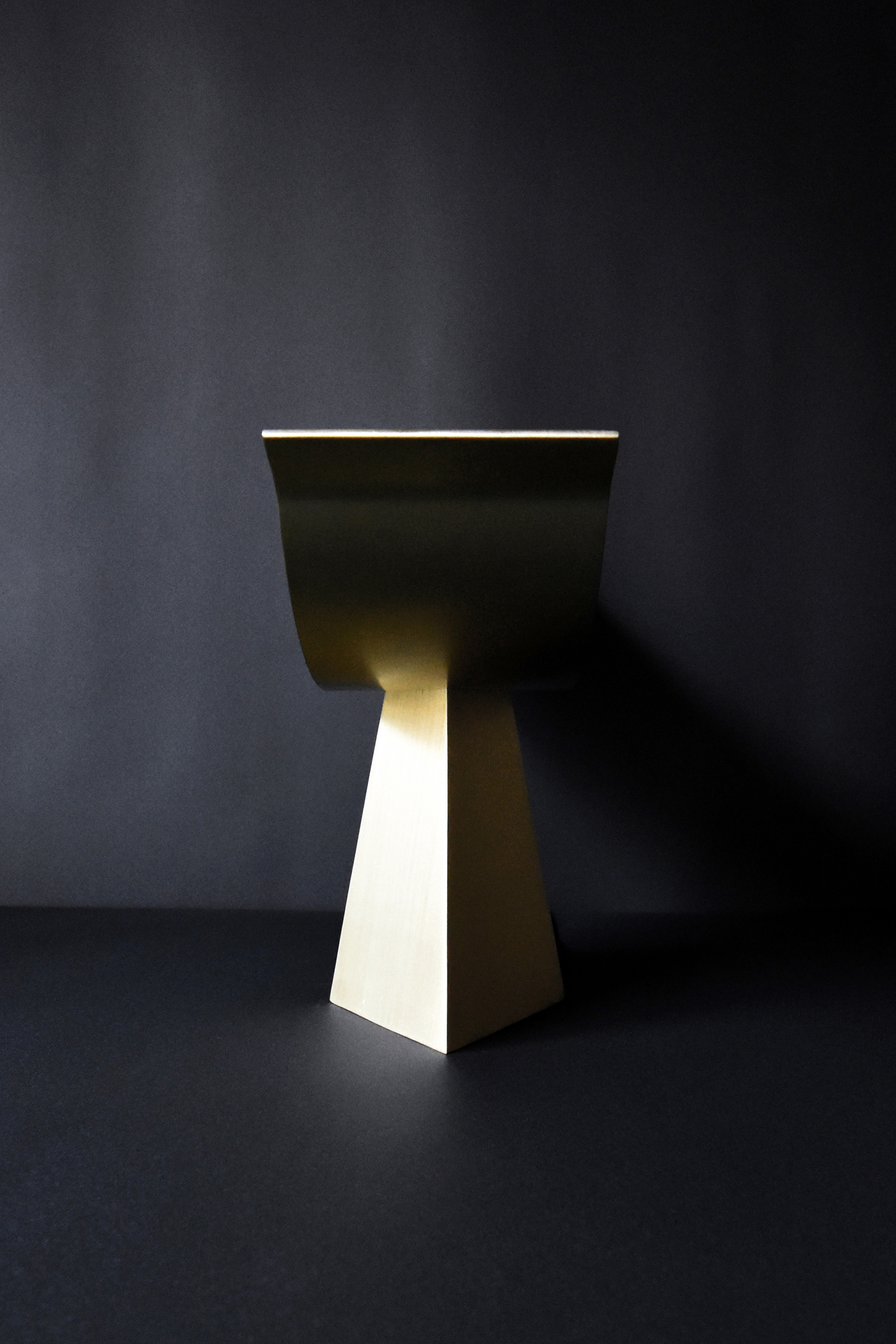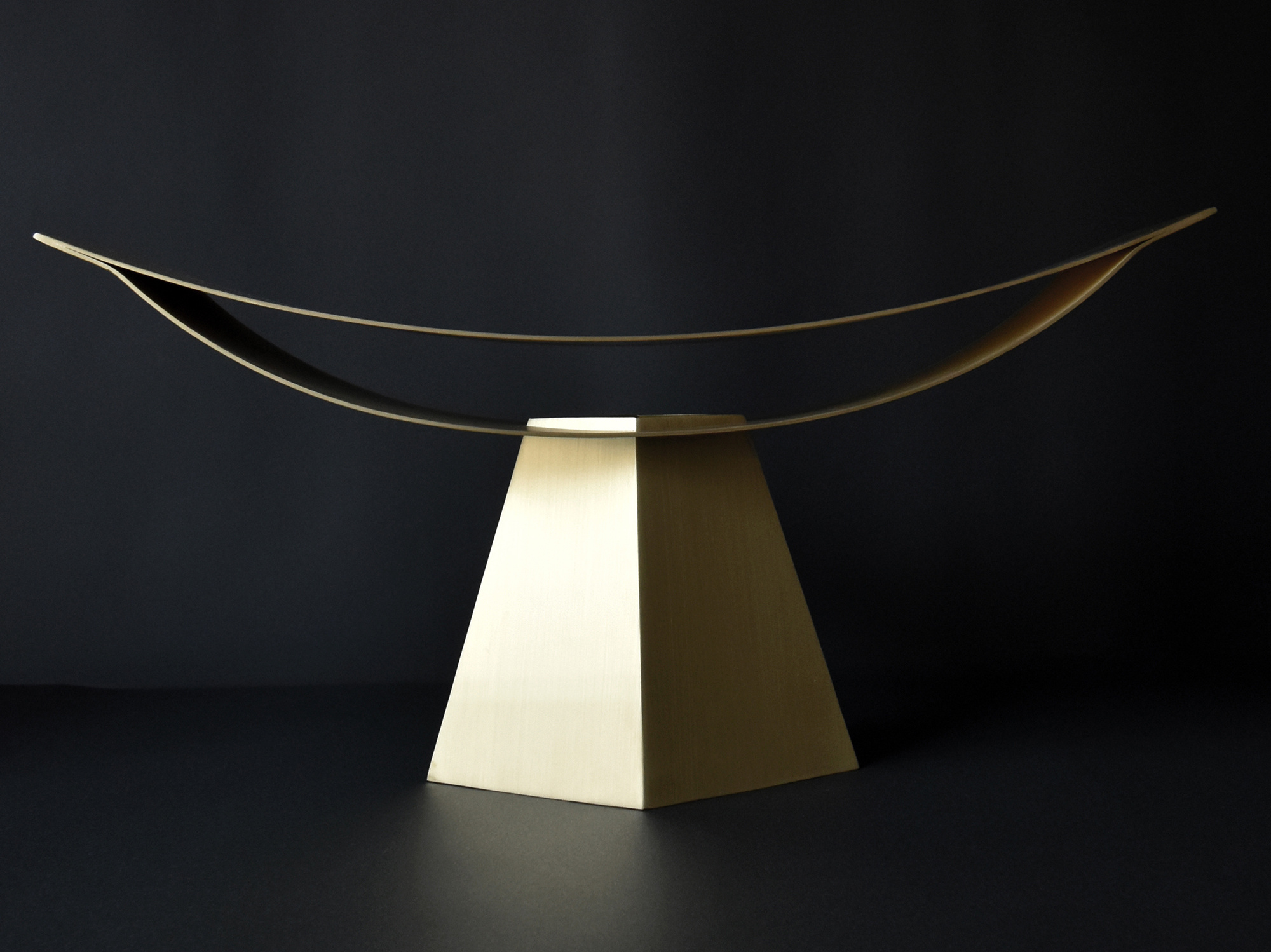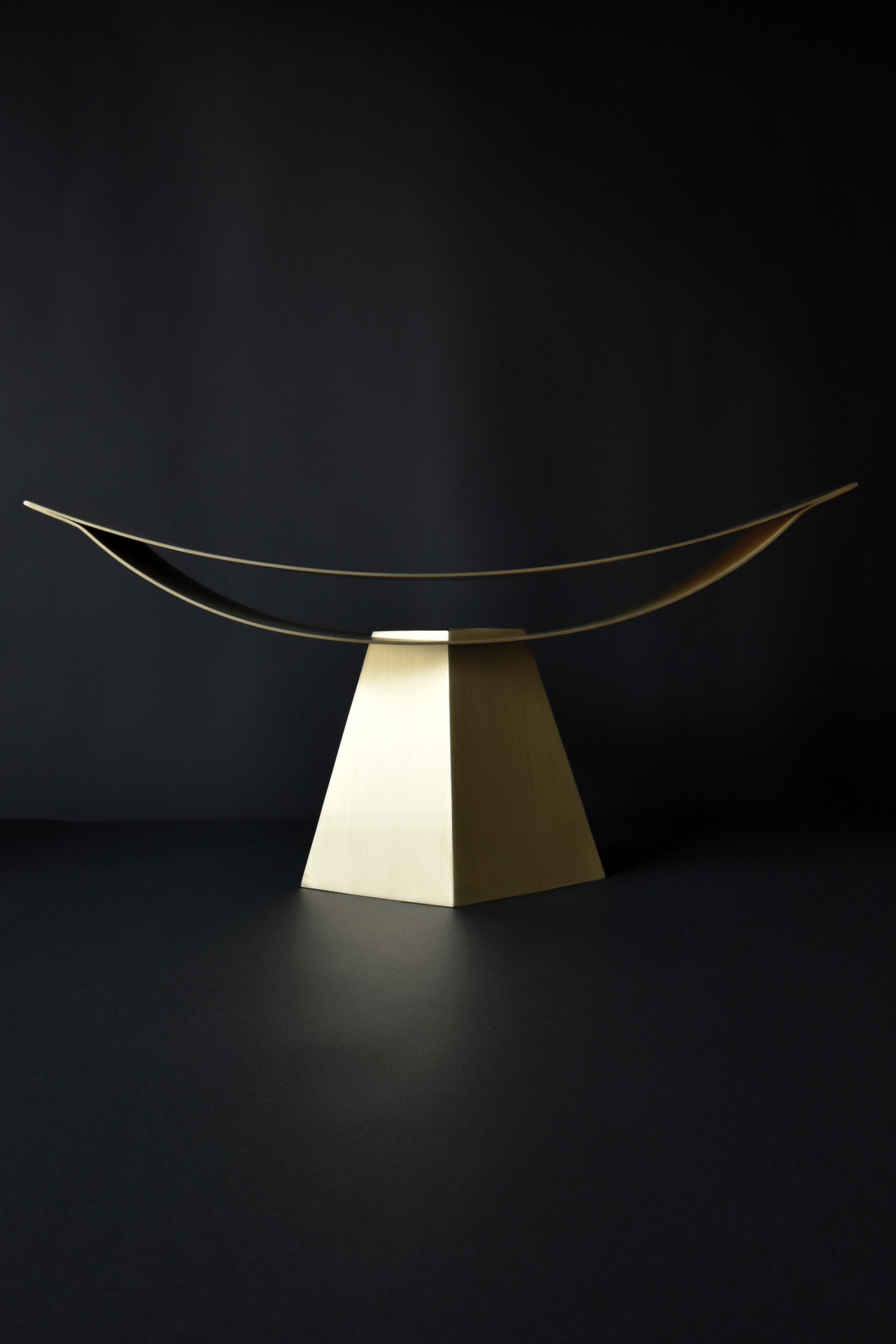 This lighting fixture applies the possibilities of a structure made up of two thin, curved surfaces, which I experimented with in "ALUMINA" aluminum chair series. This time, I determined that brass works better than aluminum for creating a warm light.