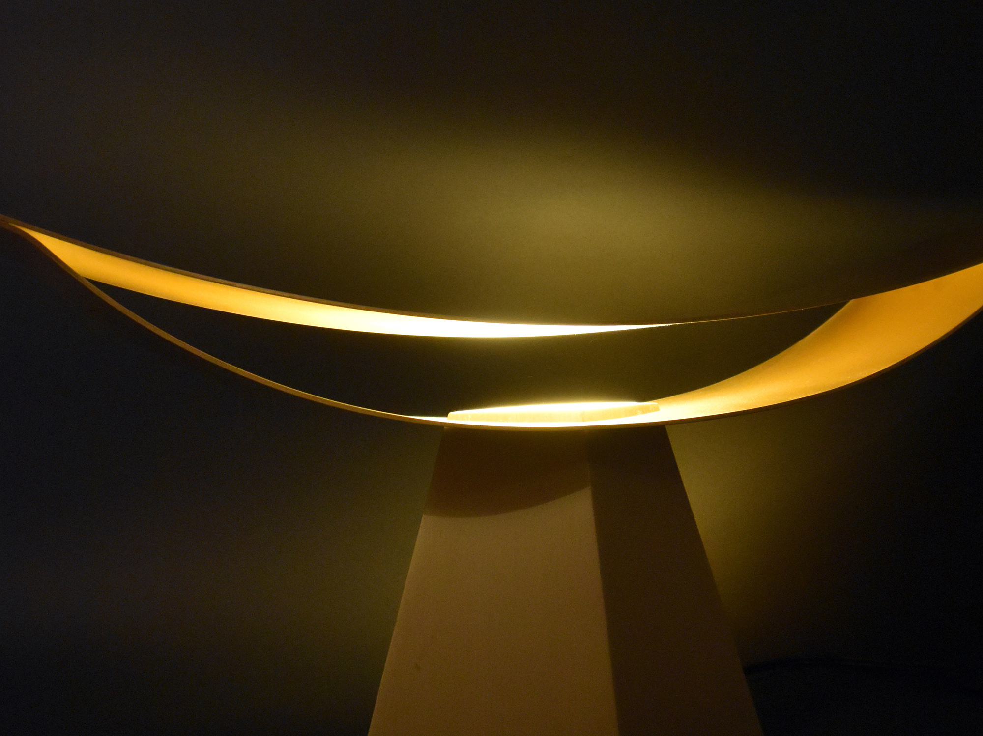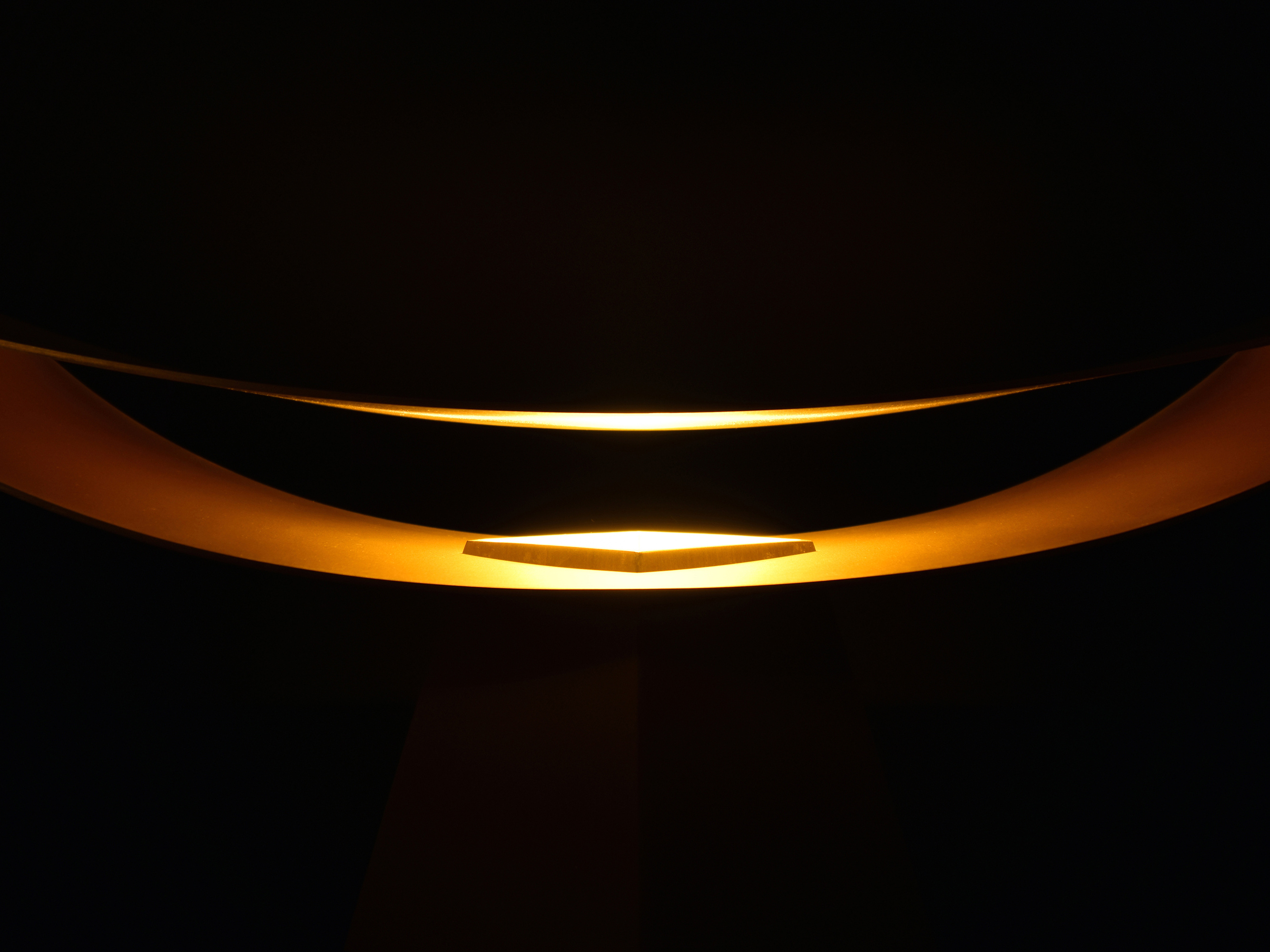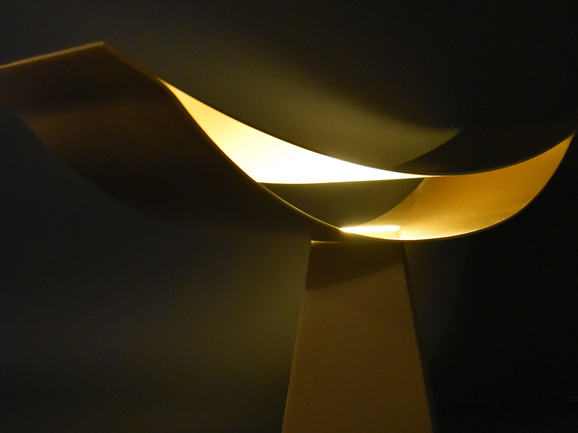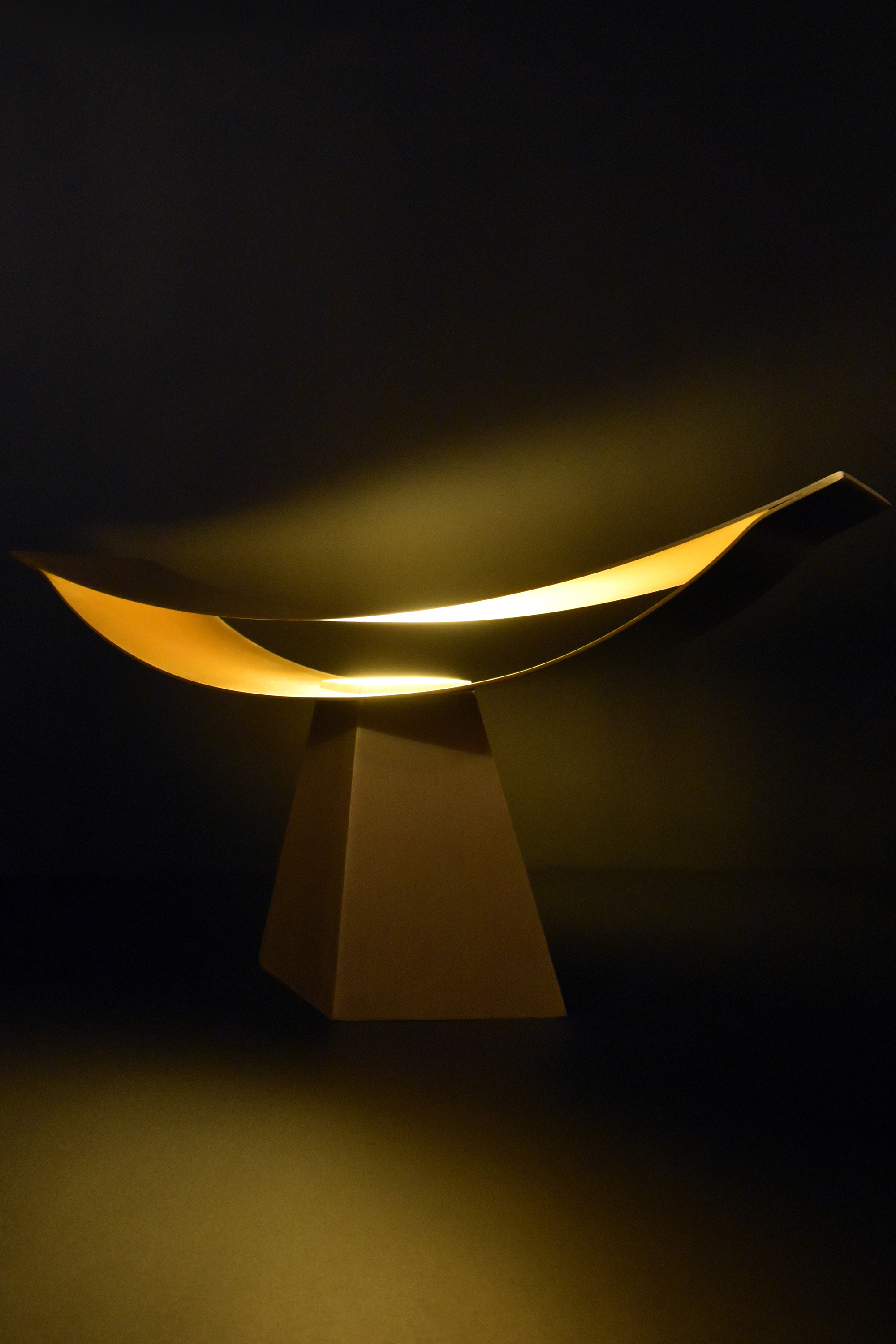 上部の反射板を異なる曲率の二枚の薄い曲面で作り、端部を溶接することでその構造は保たれる。真正面から見た時には、極力薄く作られた反射板のせいでその存在感は消える。そしてその存在感の無い部分に光を照らすことで、その存在は一気に反転する。一枚の反射板に光を当てるより、二枚の反射板の内側に光を当てることで、光がお互いに反射し合い、より存在感の強い光へと変化する。