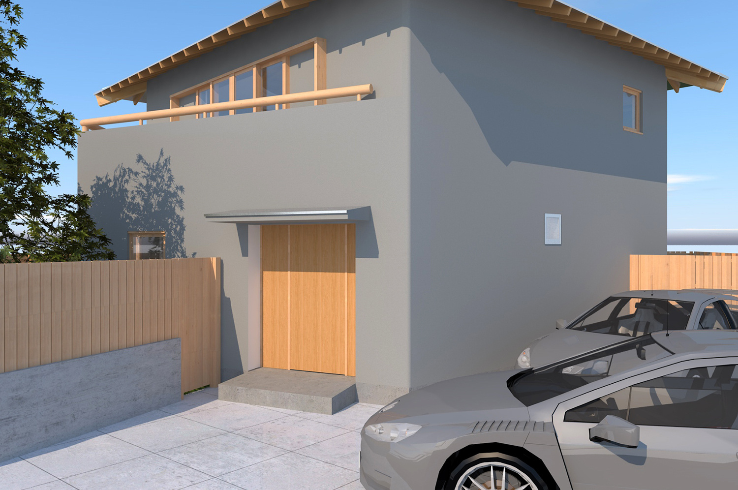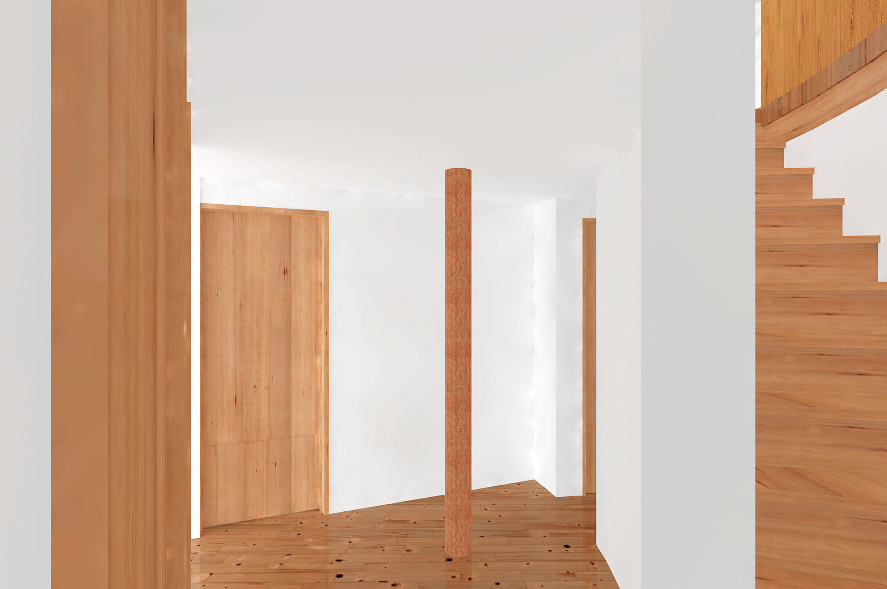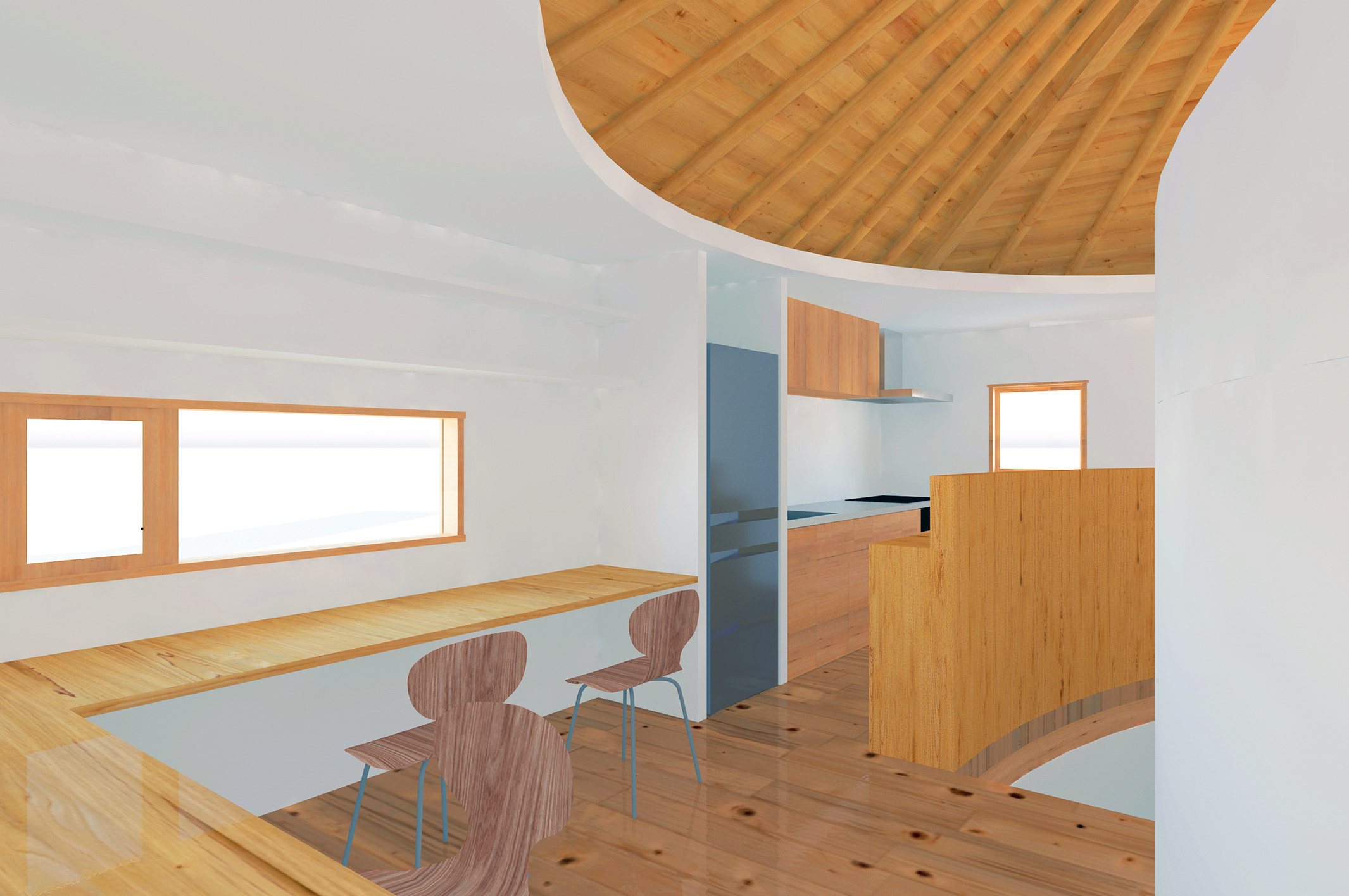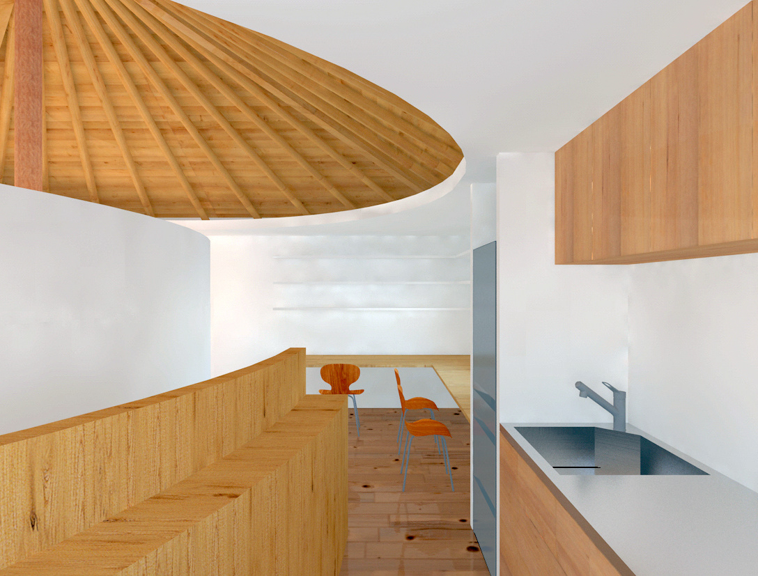 住宅とは、家族のそれぞれが楽しい時も悲しい時も必ず帰るべき精神的な拠り所でなければならない。そのような精神が宿る場所として、家族が一つの大きな傘の下に住むことを強く意識する空間作りを目指した。心柱を中心に傘を配した2階の厳格な正方形平面に対し、1階は敷地を緩やかに三つの庭と駐車場に分けるように、また十分な広さの寝室を確保するように、多角形平面としている。2階は、東側に存在するバルコニー手前の引込み戸を閉めると、真っ白な空間に中心の傘だけが象徴的に現れる。また傘の下の曲面の壁は、居間とその反対側の書斎や台所を分け、かつ傘を支える心柱の存在を強調する。