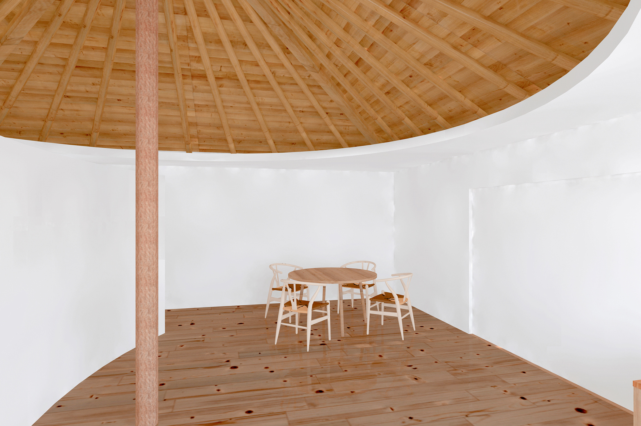 A home should be a spiritual anchor in a sense that each family member can return in times of joy and sorrow. We aimed to create a space that would allow the family to be strongly aware of living under one large umbrella as a place where such a spirit resides. In contrast to the strict square plan of the second floor with the umbrella placed around the central pillar, the first floor is polygonal in plan to gently divide the site into three gardens and a parking lot, and to ensure a sufficiently large bedroom. On the second floor, when the sliding door in front of the balcony on the east side is closed, only the central umbrella appears symbolically in the pure white space. The curved wall under the umbrella also emphasizes the presence of the central pillar that separates the living room from the study and kitchen on the opposite side.