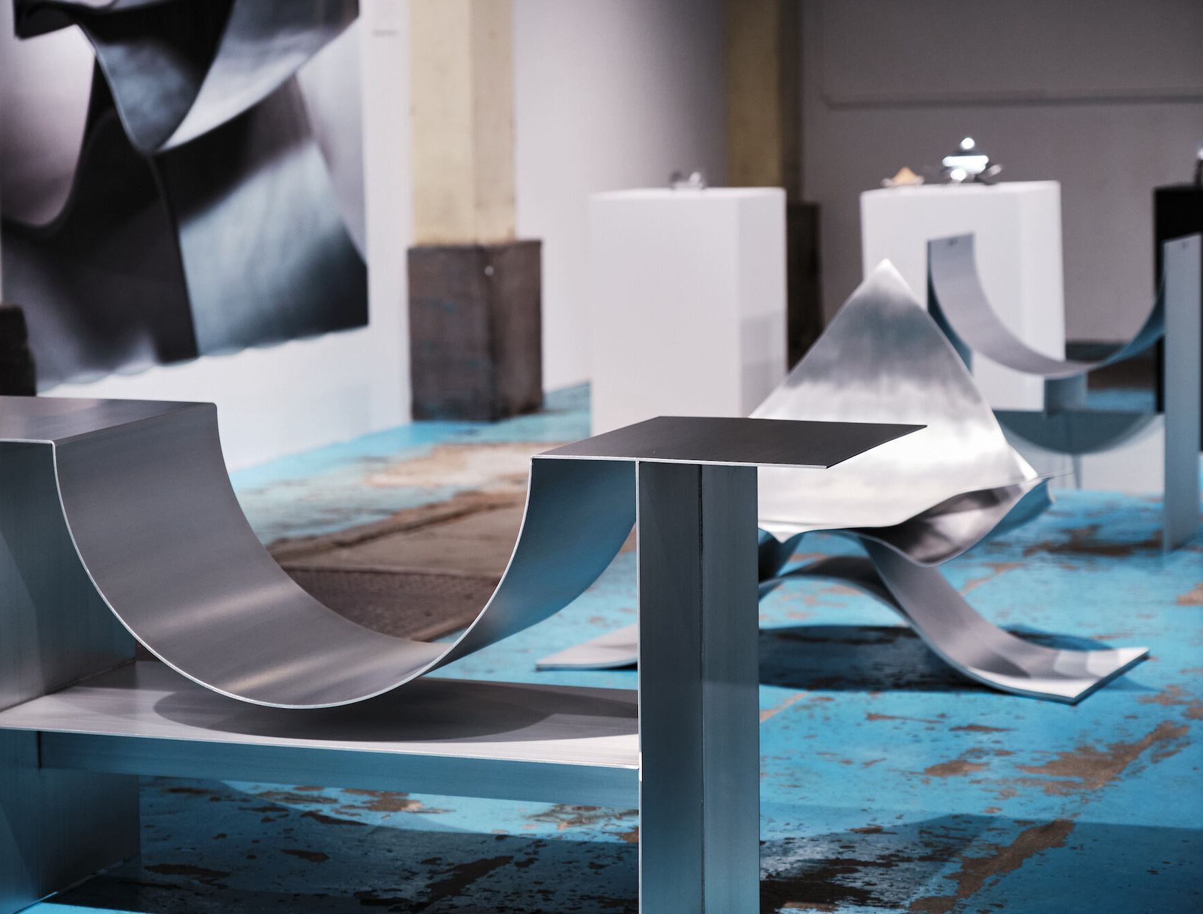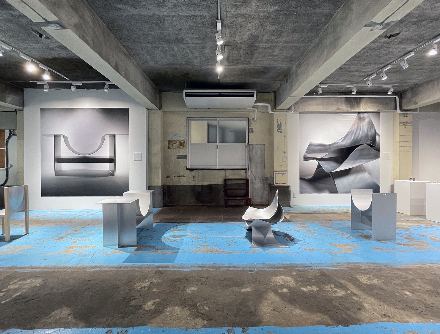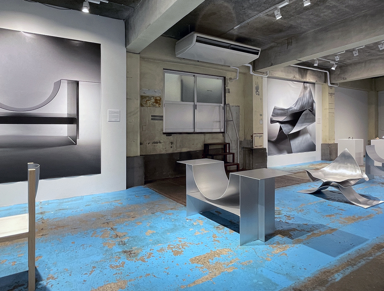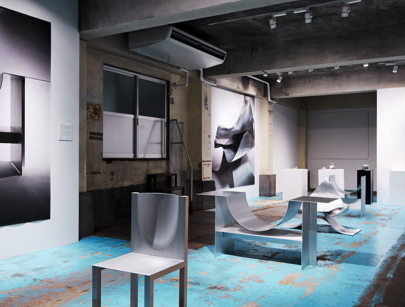2018年から菊川工業株式会社とのコラボレーションで制作してきたアルミニウムの椅子シリーズ「ALUMINA」の全作品7点を展示する展覧会。