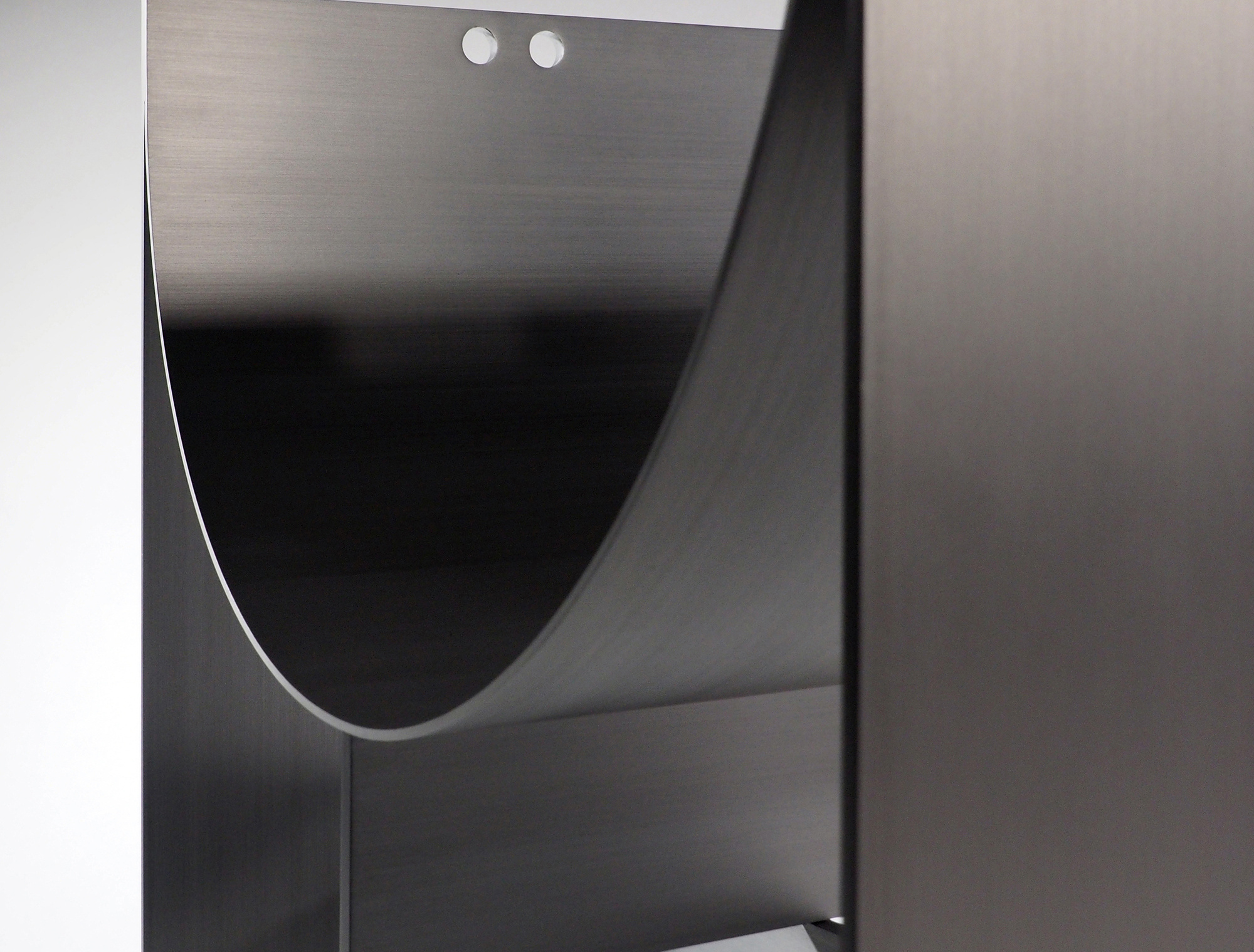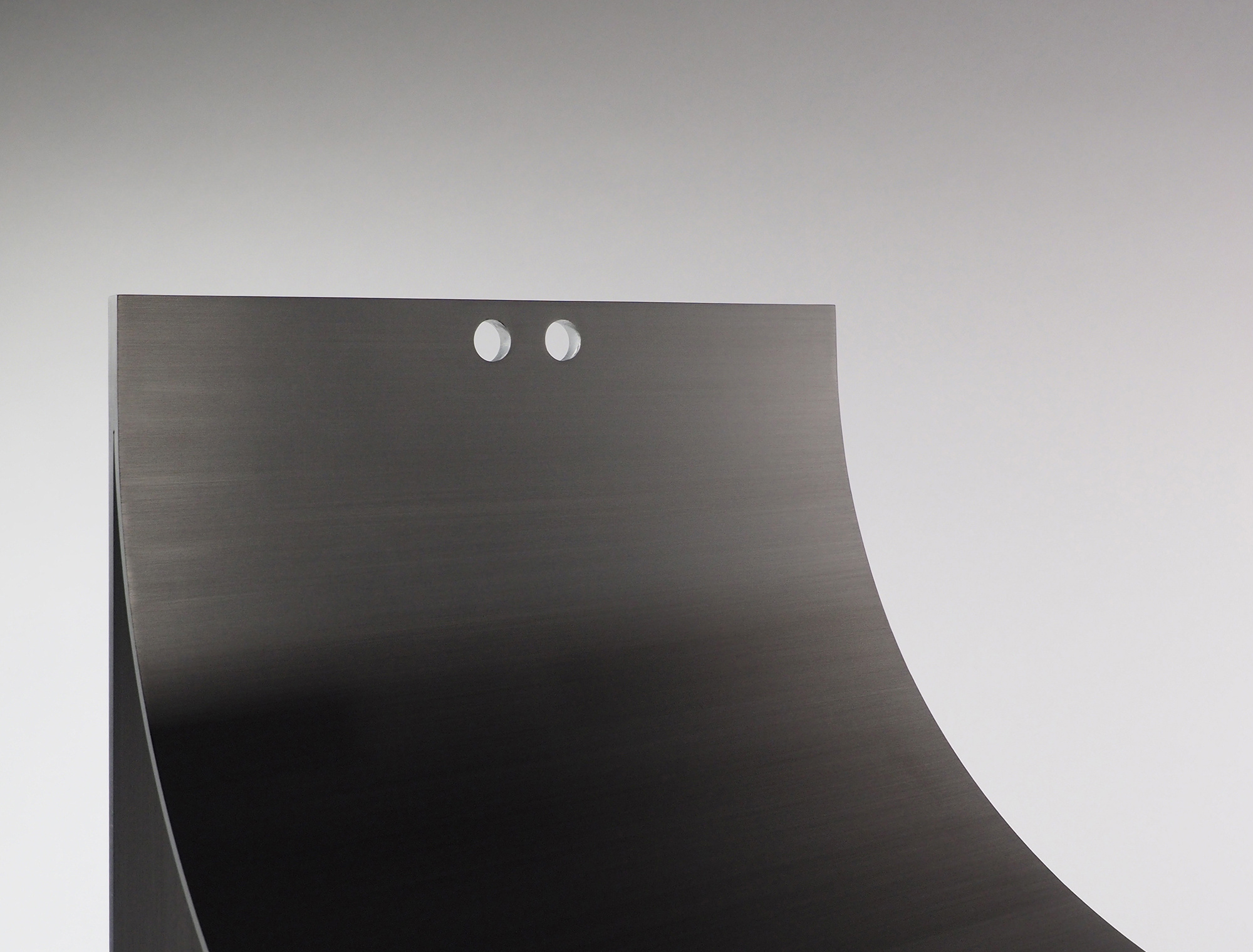 使用しているアルミ板の厚みは、半円形の座面が4mm厚、側板が6mm厚、座面下の直行する2部材は10mm厚である。当初、側板の板厚は4mmであったが、4mm厚と10mm厚の部材を溶接すると、側板に歪みが生じてしまうことが分かった。2枚の側板とそれらを繋ぐ部材を溶接なしで留める方法を検討した結果、側板の厚みを2mmだけ厚い6mm厚とし、10mm厚の部材に特殊なスプリングピンを内蔵させることで、溶接なしで留められるようになった。