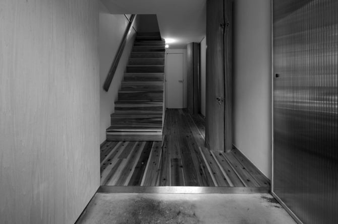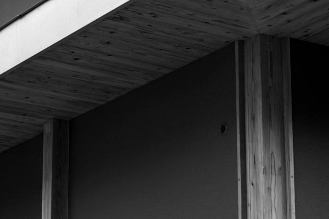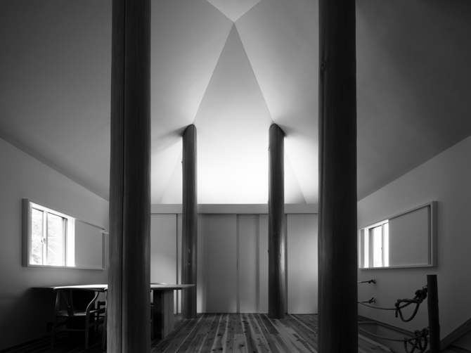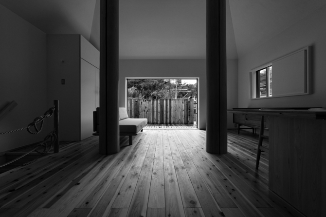まず大地に四本の柱を立てることを決めた。最初に住宅の中心的な架構をつくり、そこを起点に住まいを構成していく。必ずしも住宅に象徴的な中心の場を作ることではなく、概念的な“中心”を内包した住宅のつくり方である。そしてこれは、旧広瀬家住宅のように甲府盆地東部に古くから見られる民家形式「四つ建て」に繋がる。更に古くは、竪穴式住居の四本の柱にも繋がると考える。その意味でも、この形式は、住宅建築の原型を表していると言えるだろう。