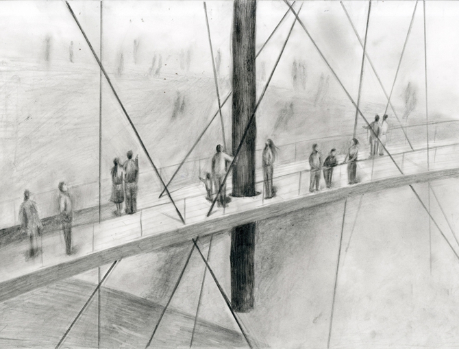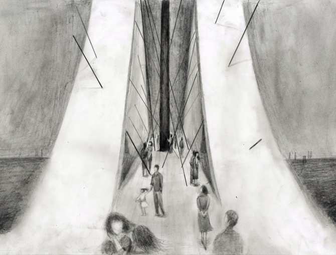 橋の中央には、人々の祈りや願いの象徴として、できるだけ太く長い南三陸の巨大な杉丸太を吊り下げたい。この「復興の橋」の計画は、その貴重な丸太を探すために、南三陸の山々を皆で歩きまわることから始まるのだ。自然の生命力を強く示す存在としての杉丸太に、人々の思いを託すのである。自然現象のなかで人間が晒される事象に対して、最終的に人々の心が向かう先は、祈りや願いであり、その拠り所を一本の杉丸太に託す。