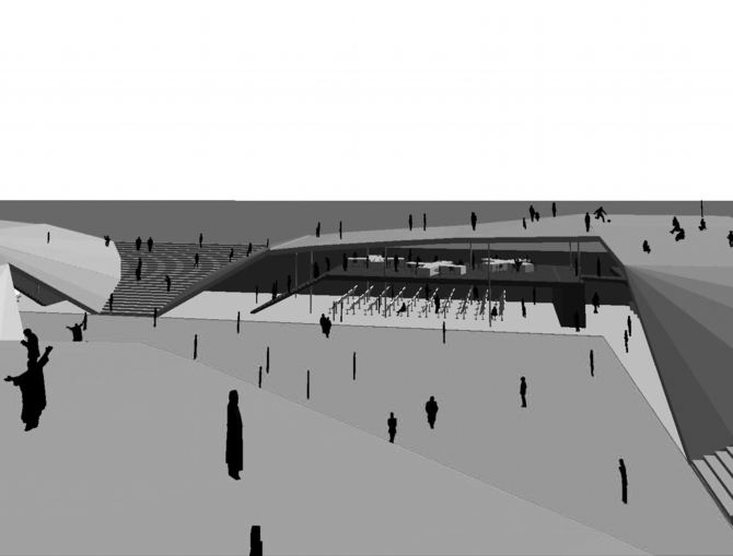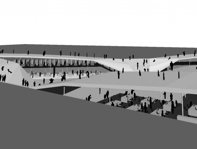 それぞれの箱(部屋)の上部は別の機能のための空間で、事務所、先生のためのオフィス、カフェ、図書室、ギャラリースペース、展示スペースが配置される。それらの空間は地上レベルより少し下がっているが、地下1階からも地上からもアクセスできるようになっている。