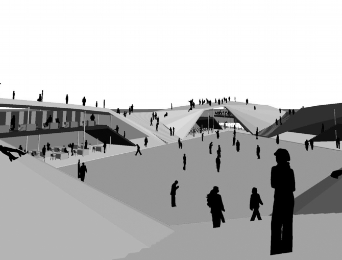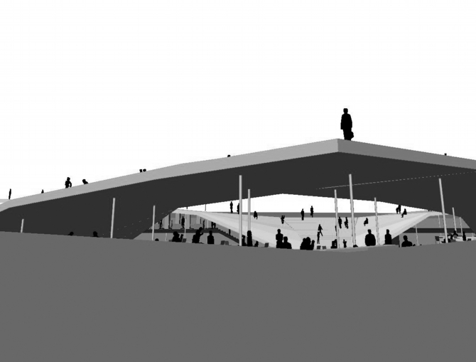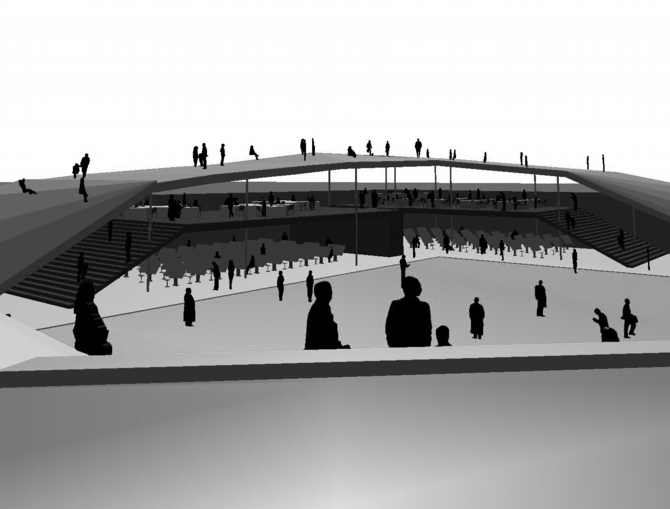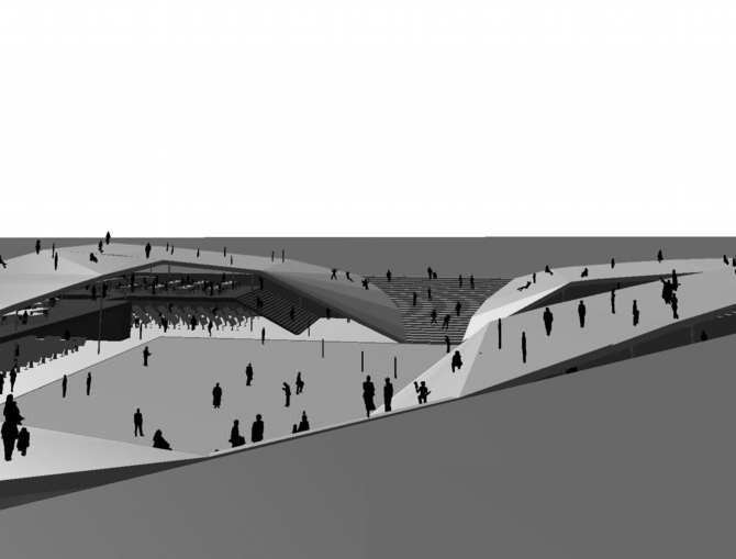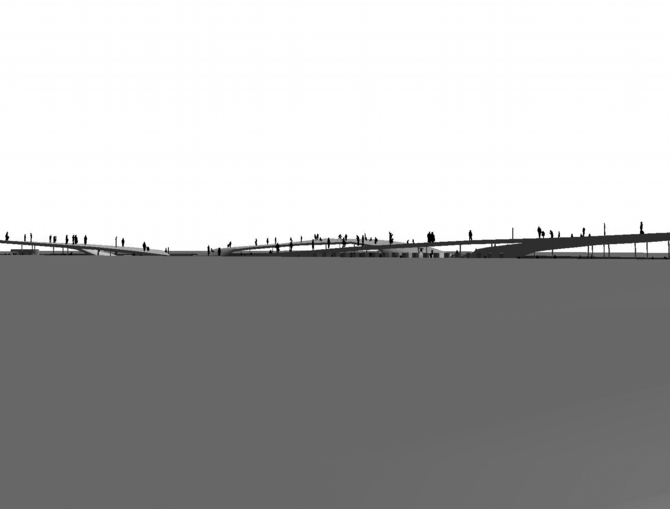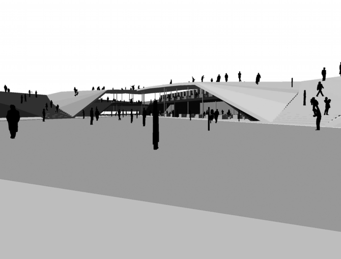 また建物の屋上レベルを、地上から上り回遊できるような芝生のランドスケープにすることで、周辺環境への連続的な繋がりを一層深めている。