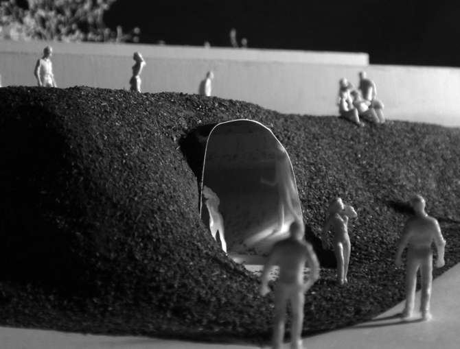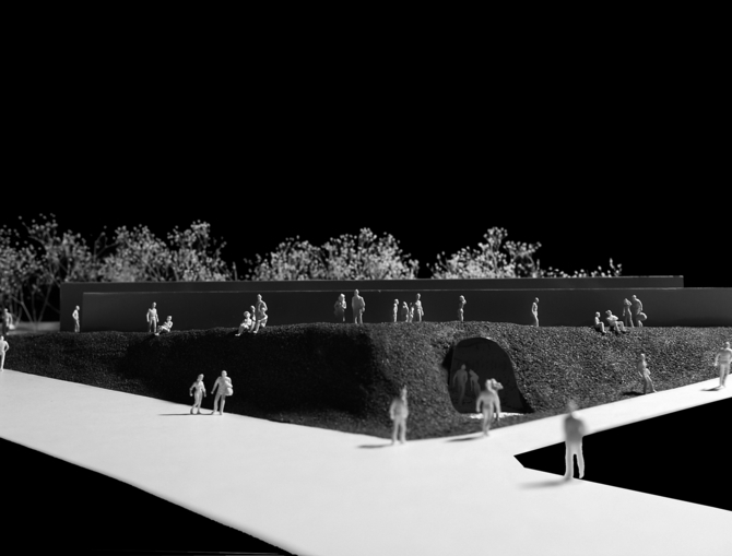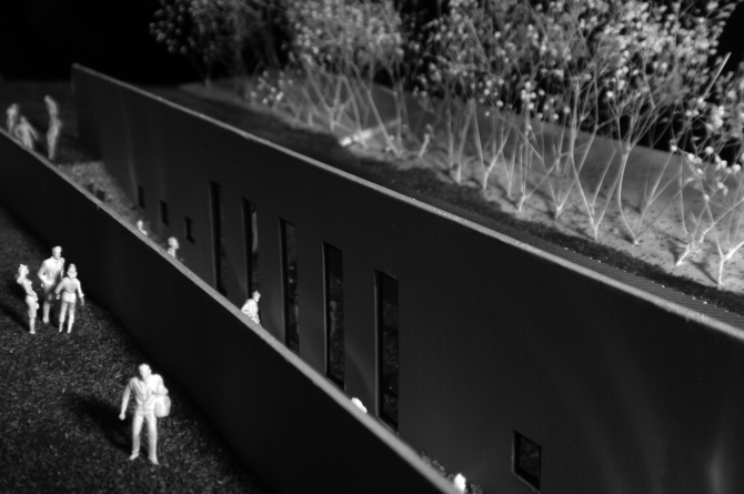 地上に建物を建てることで失われがちな豊かな自然環境に対し、建物全体を半地下に埋めることで、地形の特徴を最大限に生かし、一番使用頻度の高い夏場の環境にも配慮している。また、スロープにより地上との空間的連続性も確保している。