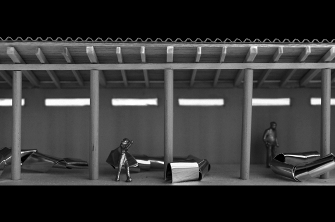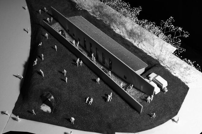 3枚のコンクリート壁を主な構造とし、その間の2つの空間を内外のアトリエ兼ギャラリーとしている。内部空間は、木造の屋根を掛けることで、予算内での建設を可能にする。