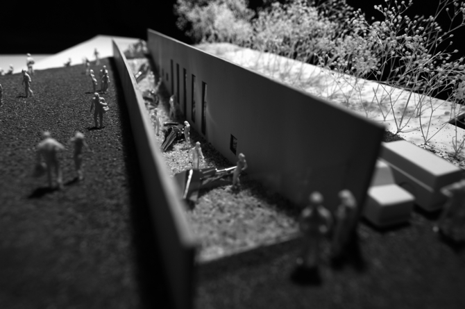 前面道路からは、コンクリートの壁だけが、アート作品のように見えるのみである。