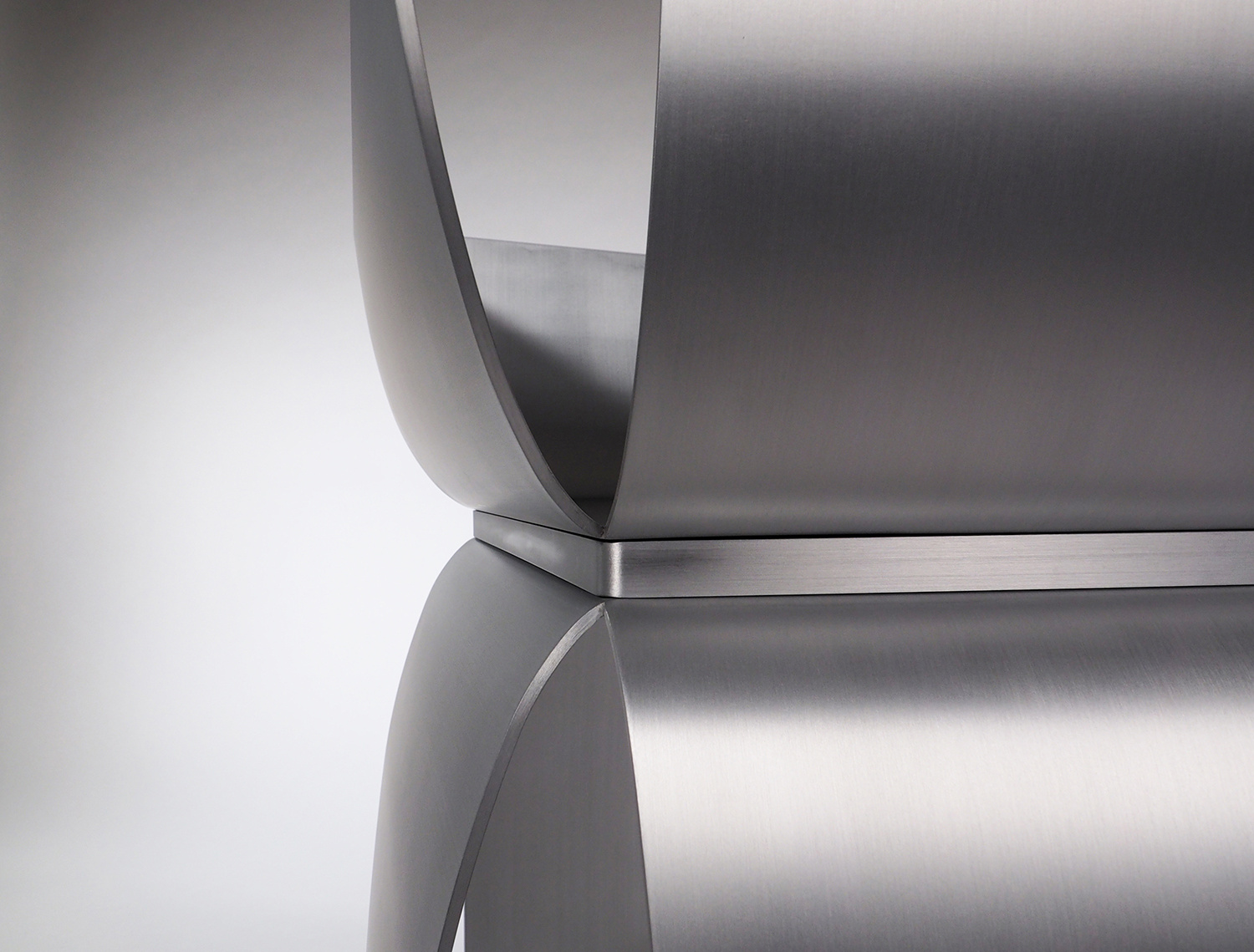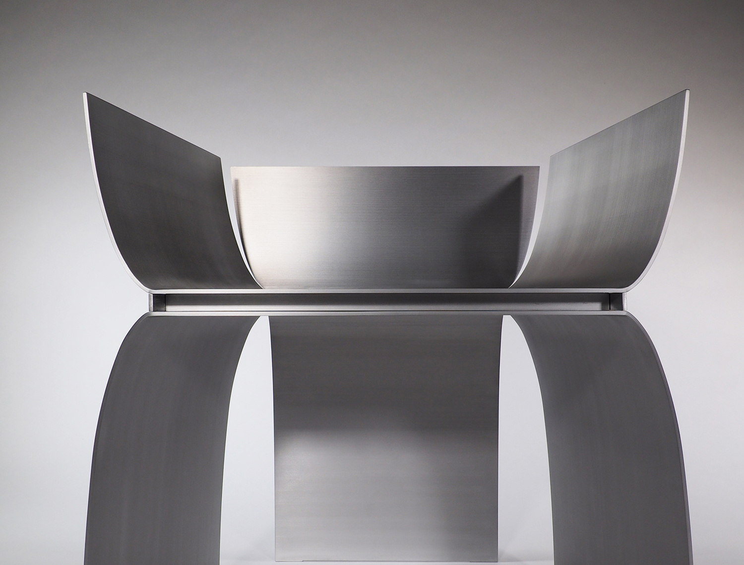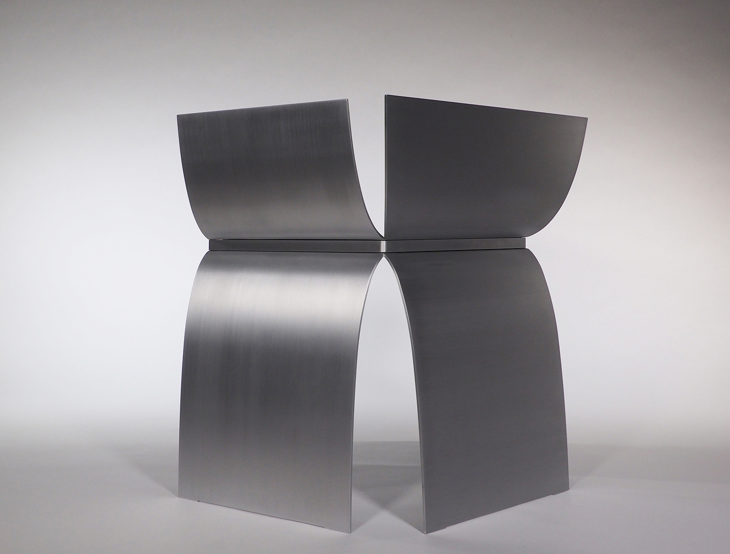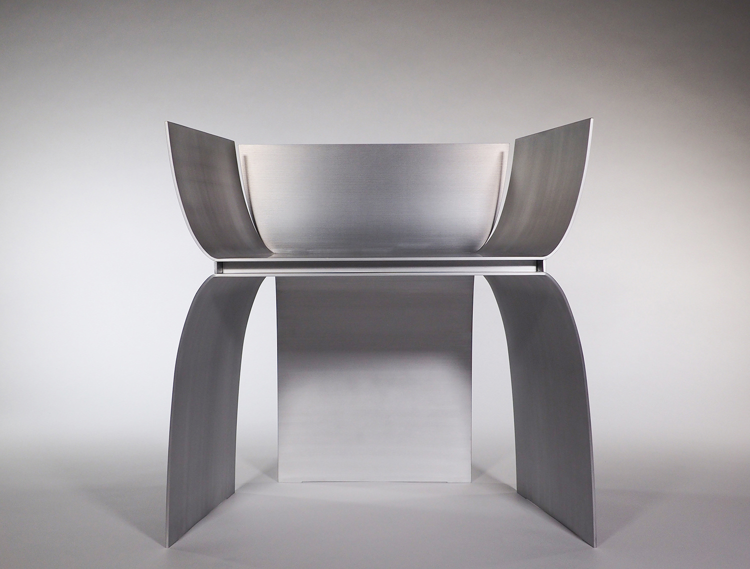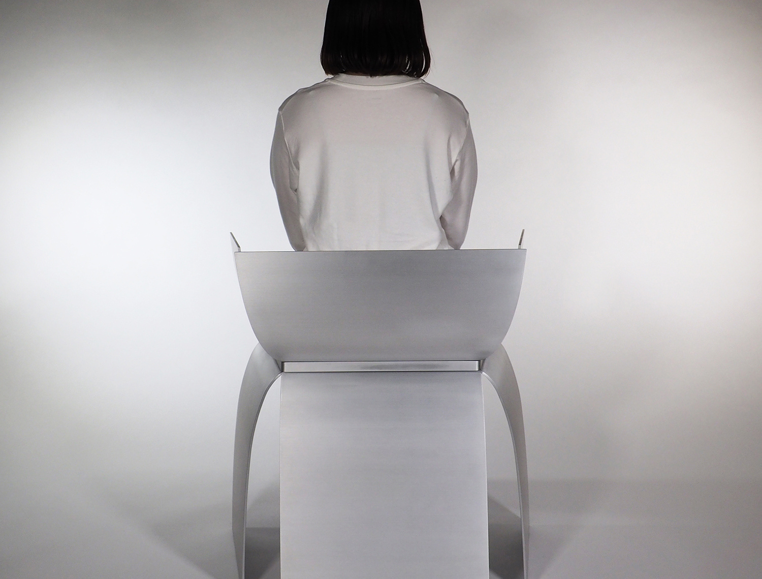 アルミニウムの溶接において、厚みを3mm以下にすると歪みの問題が生じることが経験上分かってきたので、薄くしても4mm厚を使用することが多い。今回の形状は前面の座面下が開いており、構造的な不安が残っていた。最初に図面化した際に、側板をとりあえず5mm厚で設定し、試作を作りながら厚みを上げていくことを考えていた。しかし、色々な製作方法の検討を重ねることで、当初の5mm厚で構造的に全く問題なく出来ることが分かった。また意外なことに、今までデザインしてきたアルミニウム製の椅子の中で構造的に最も強い形状の一つとなり、100kgの体重が掛かっても全く問題なかったのは驚きであった。