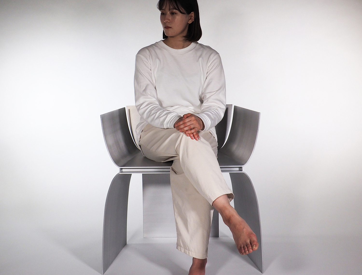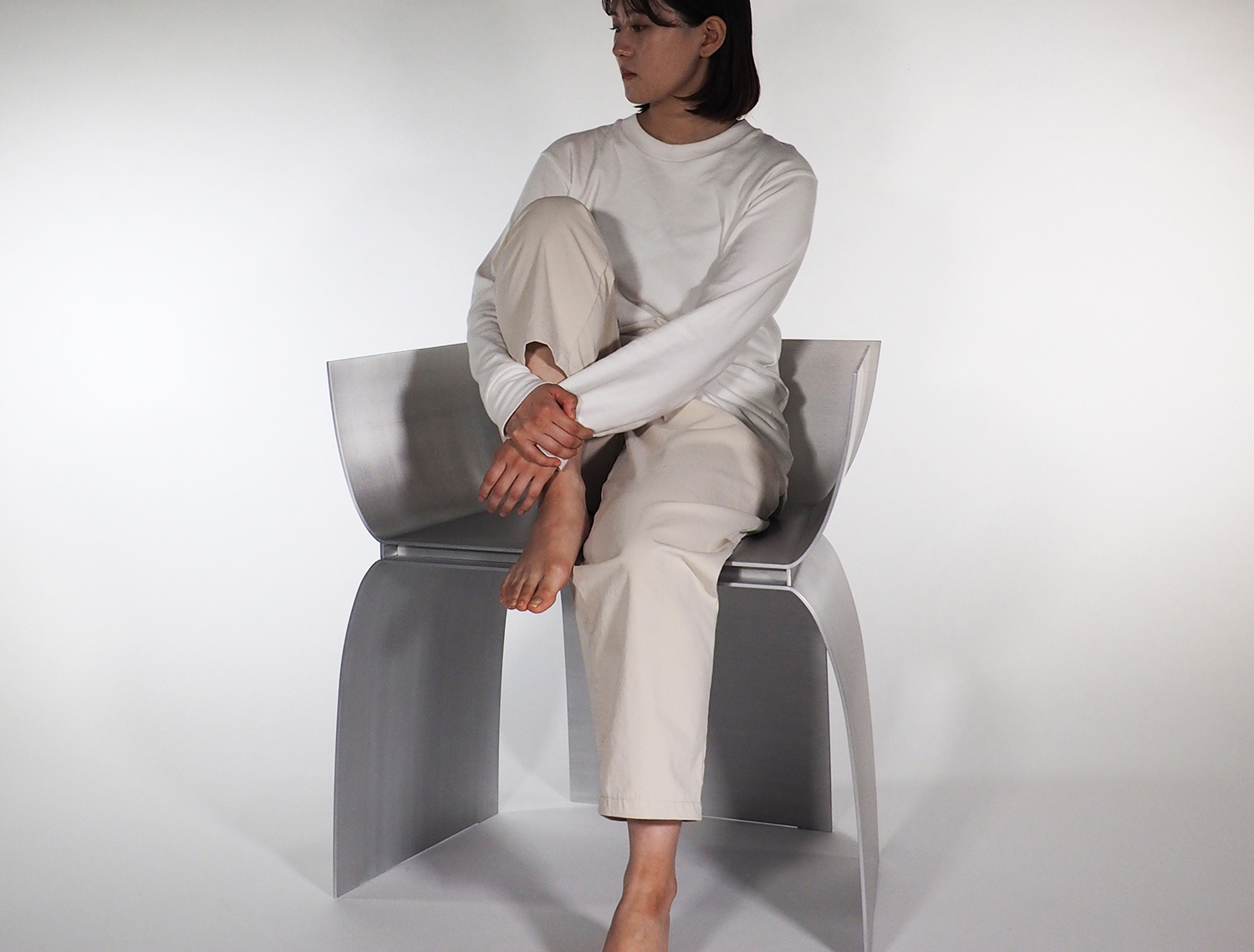 Except for stools without backboards, chairs often have three basic parts: legs, a seat, and a backboard. The more ambiguous the relationship between these three is, the further away the chair is going to be from the fixed concept of a chair. The first thing that came to my mind this time was a cross-sectional shape that looks like an "r" with the legs and back plate continuing. Then, by gathering three of these shapes and supporting the seat surface only with the recessed part of the “r” shape, the three shapes of the legs, the seat surface, and the back plate are vaguely connected, and the load flow looks unclear. I wondered if I could design a chair that is seemingly unstable and not immediately understandable. In addition, by gathering three of the same shape, the part that used to be the backboard can also be used as an armrest, and it creates a shape that gently embraces the person.