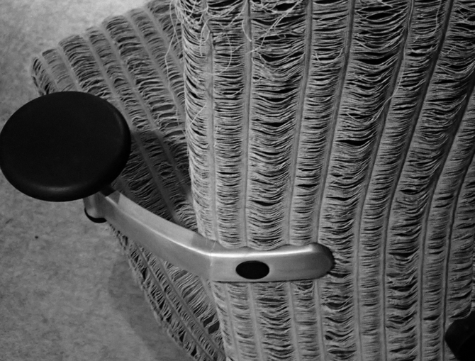 そこで、カバーリングは一見、オフィス家具では有り得ないような畳のような表情をもった素材にした。また、椅子を使用する毎に、その表情が日々変化していくような素材選びにもこだわった。