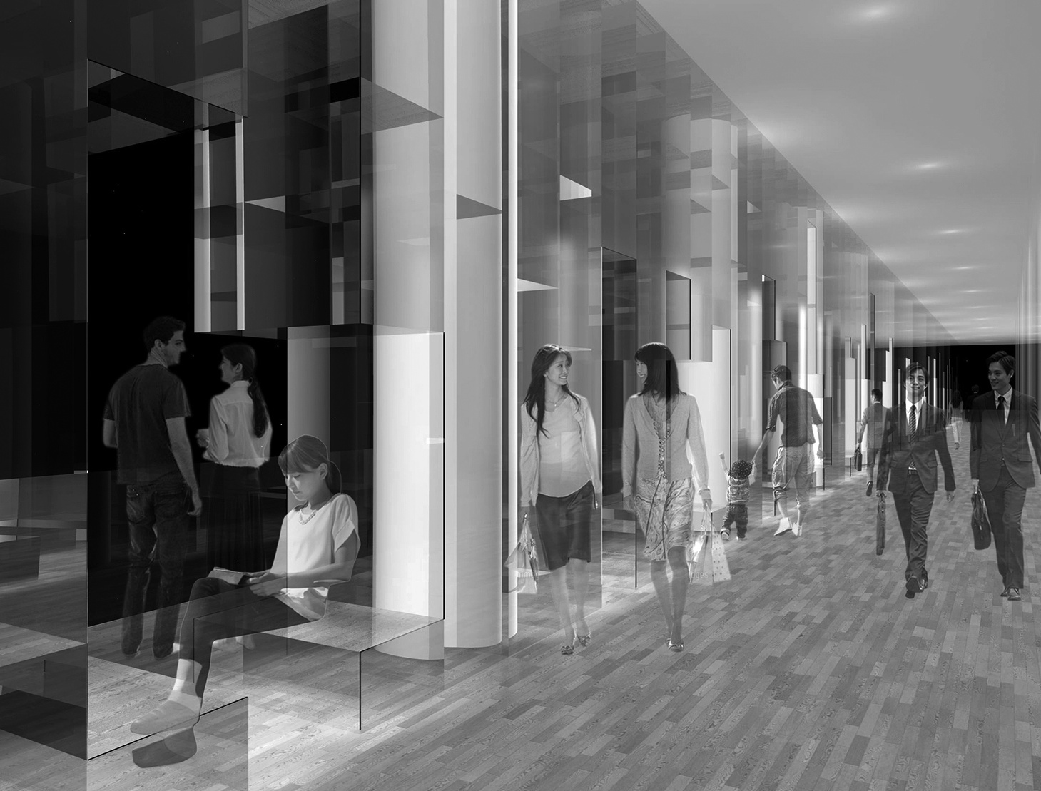 そこで我々は、歩行者通路空間に、このパノラマビューを楽しみながら憩い、そしてアートを体験できるアートギャラリー空間を提案します。アートギャラリーは、幅1.2m、高さ5mの透明なガラス壁が112枚、70cm間隔で立ち並び、その間を様々な高さのガラスの棚で繋がれた、長いディスプレイ・ウォールを中心に構成されています。