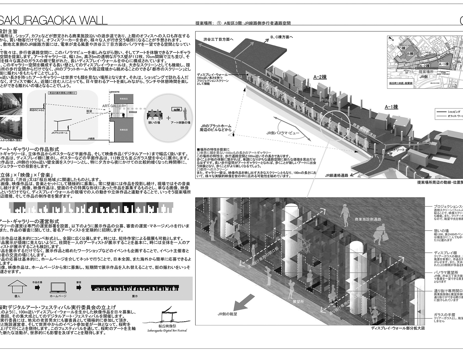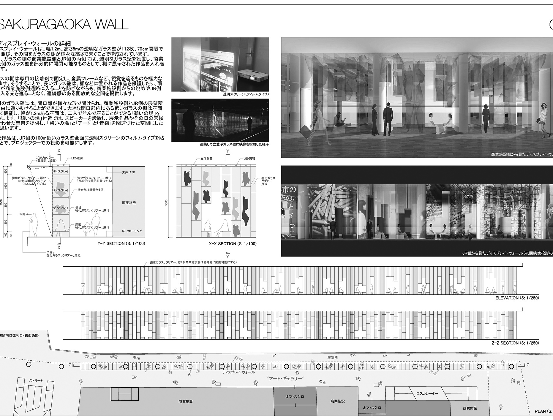 また、このギャラリー空間を構成する長い壁としてのディスプレイ・ウォールは、大きなスクリーンとしても機能し、提案場所の歩行空間からだけでなく、JRのプラットホームや周辺環境から眺めることのできる「都市のスクリーン」として、街に賑わいをもたらすことでしょう。