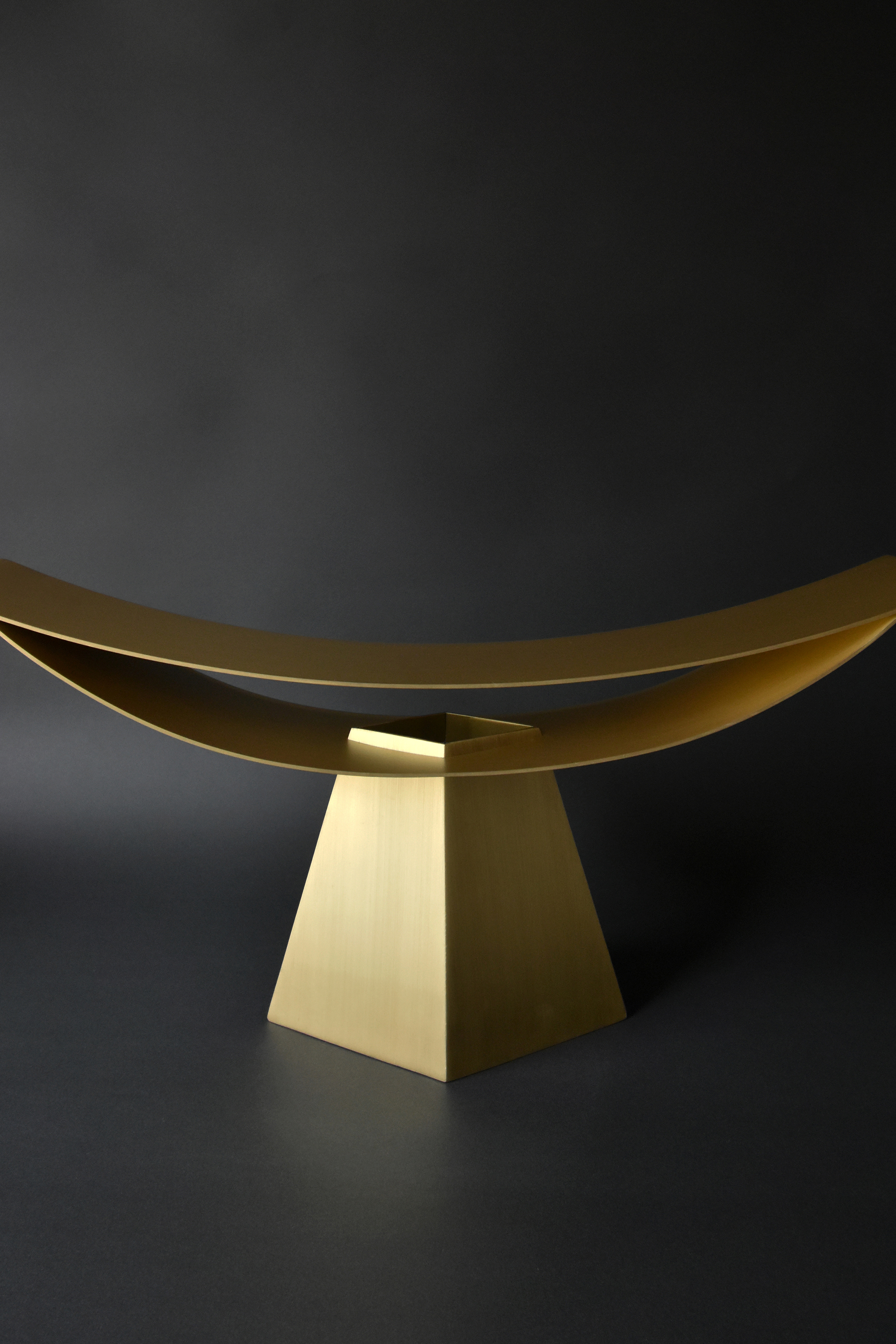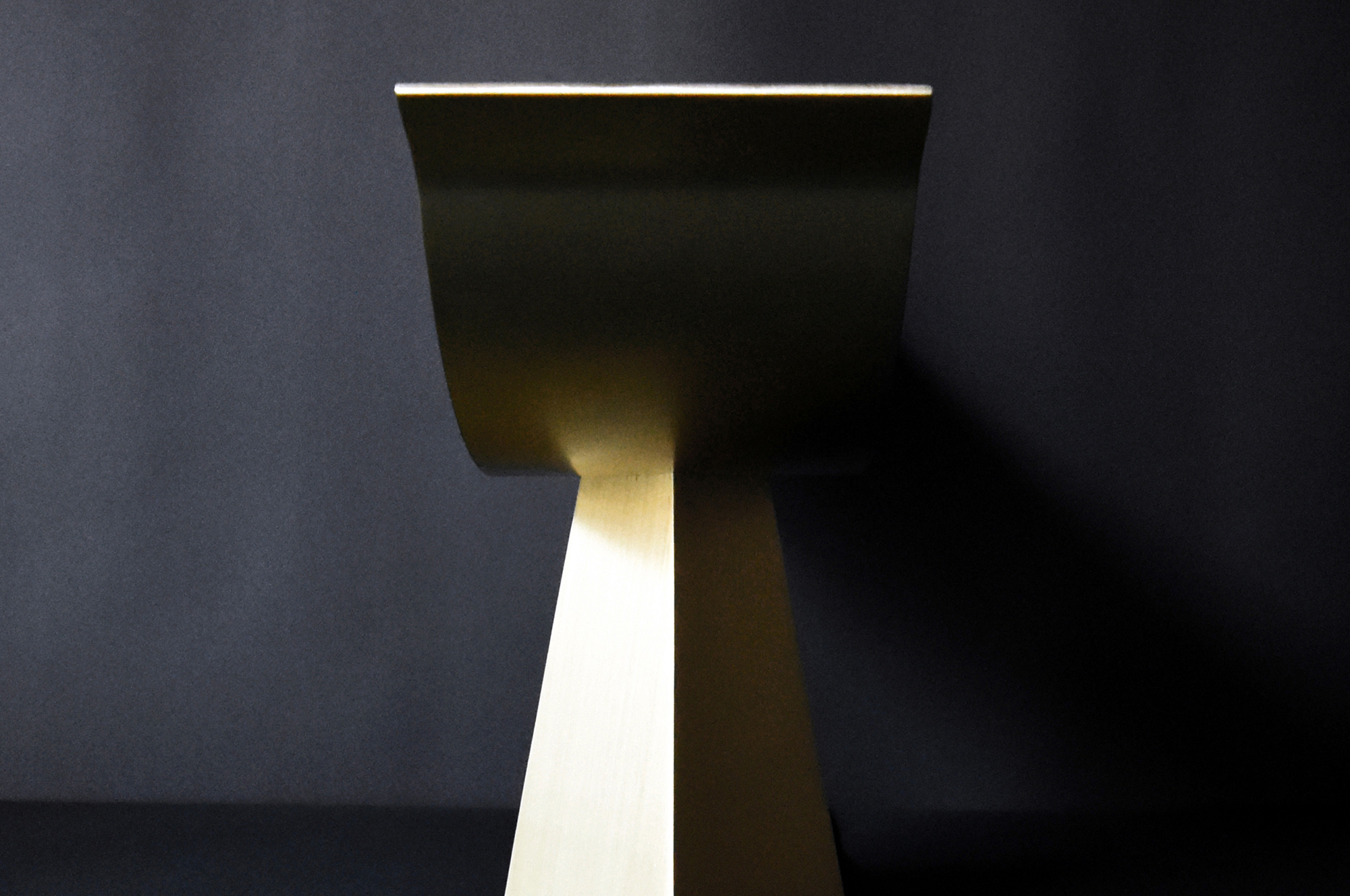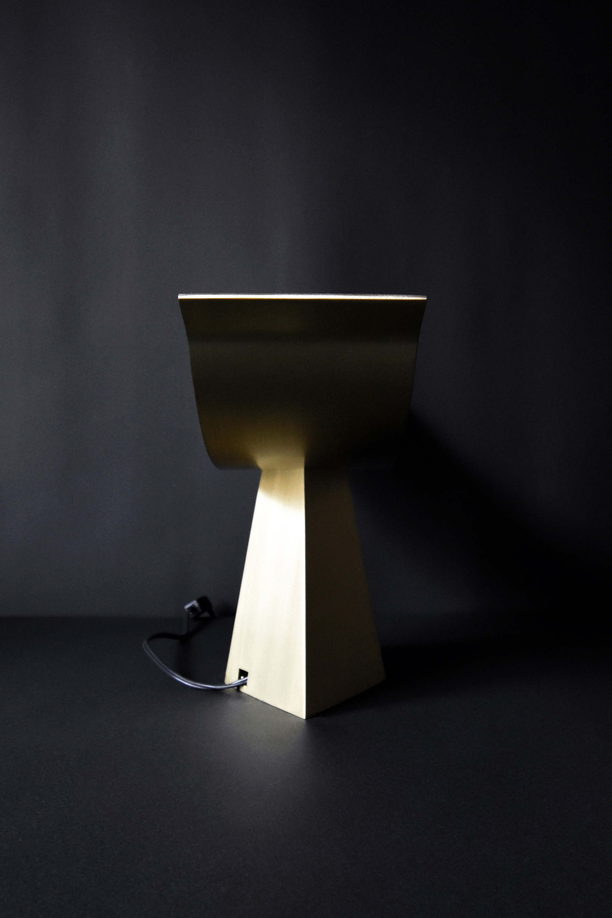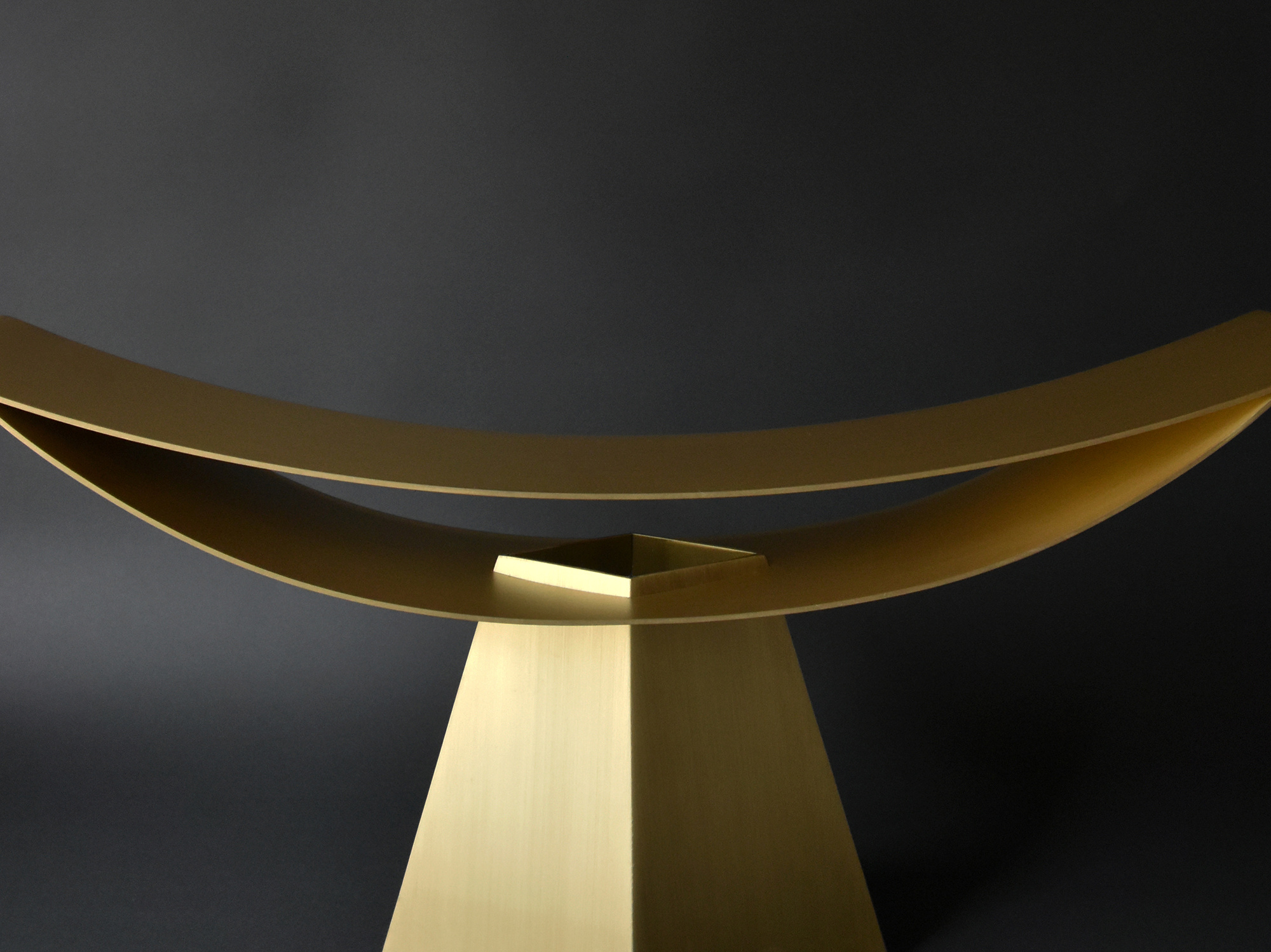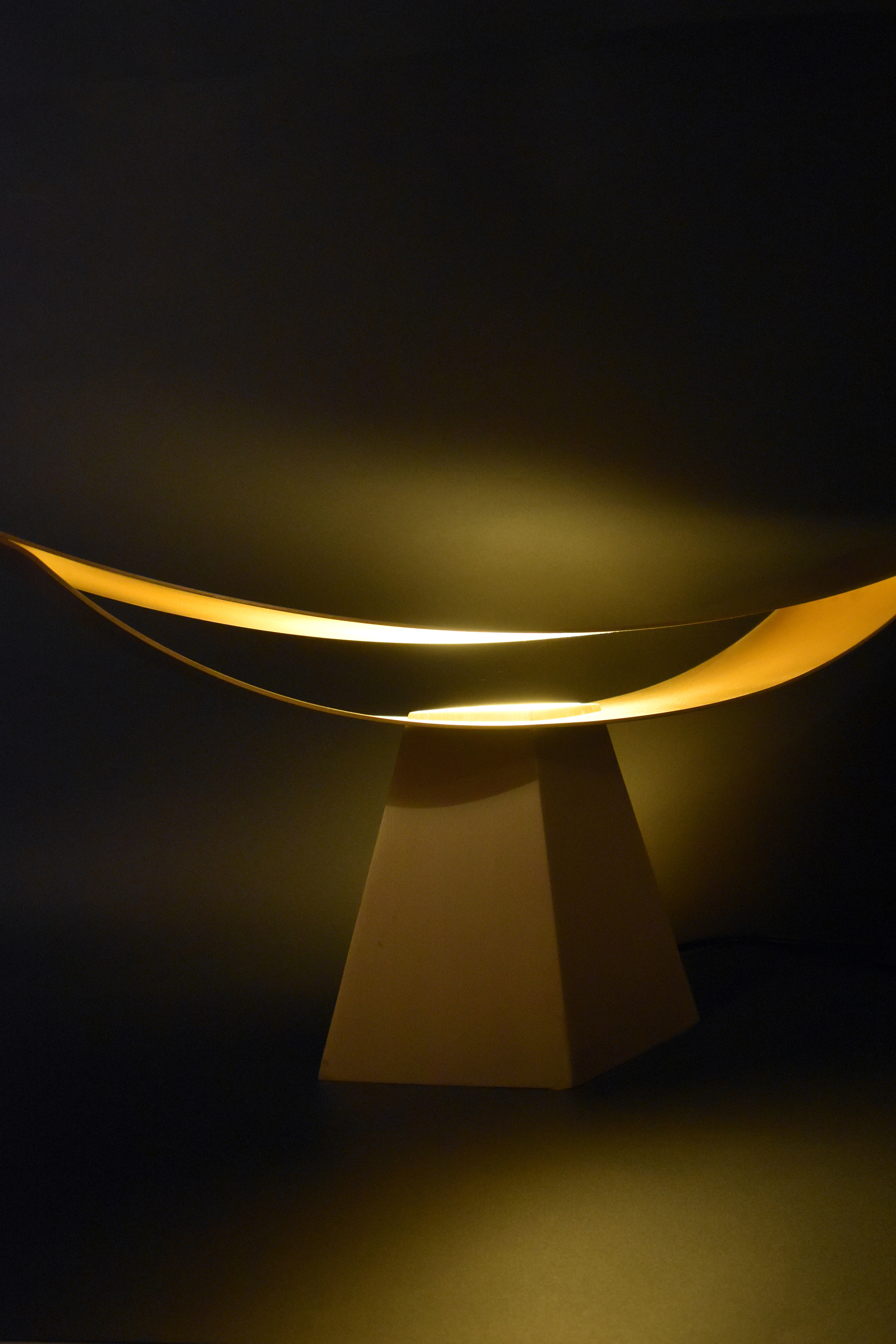 「ALUMINA」(アルミニウムの椅子シリーズ)で実験してきた薄い二枚の曲面で成り立たせる構造の可能性を照明に応用したもので、今回は、アルミニウムより真鍮の方が、温かな光との相性が良いと判断した。