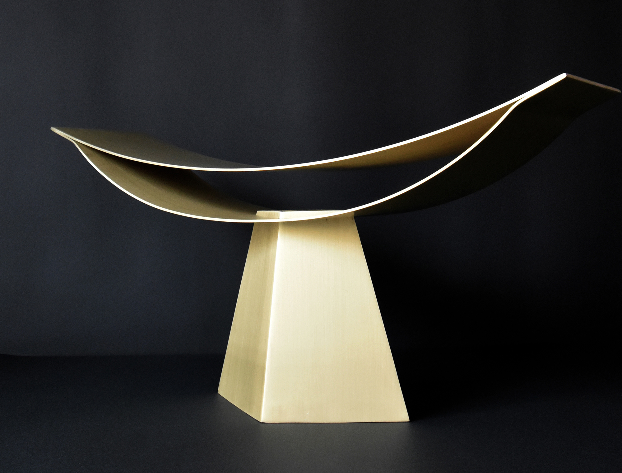 This lighting fixture applies the possibilities of a structure made up of two thin, curved surfaces, which I experimented with in "ALUMINA" aluminum chair series. This time, I determined that brass works better than aluminum for creating a warm light.