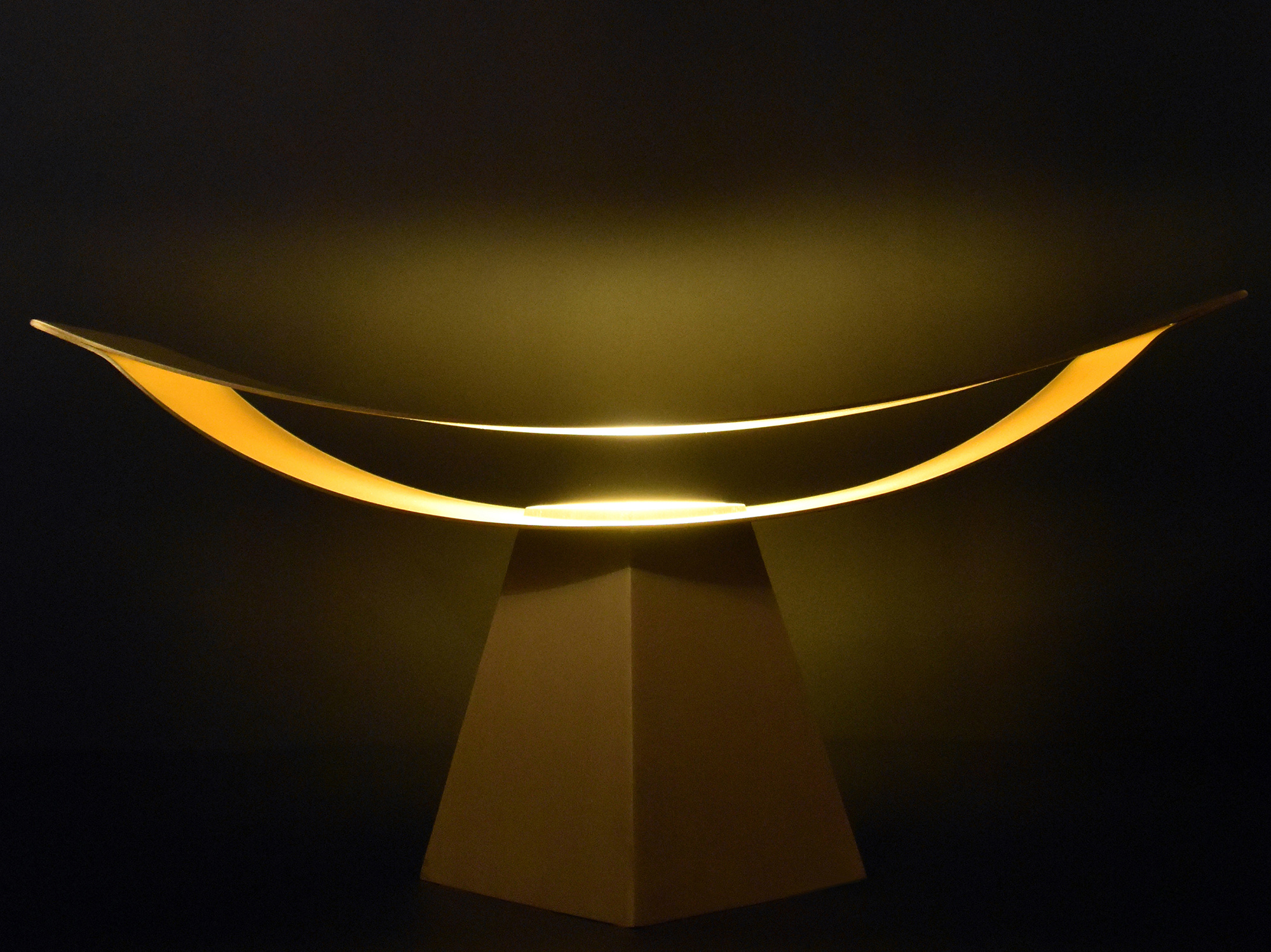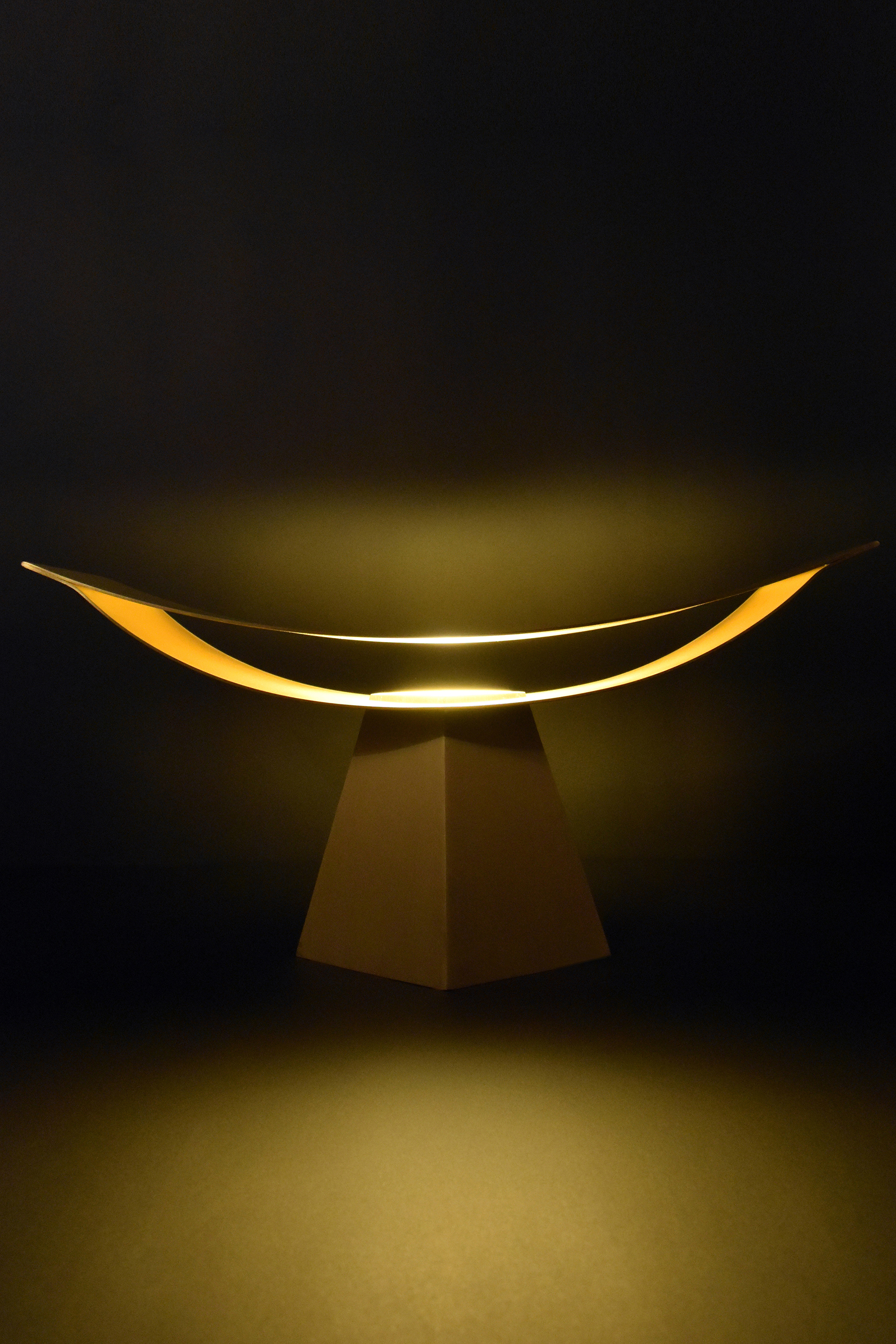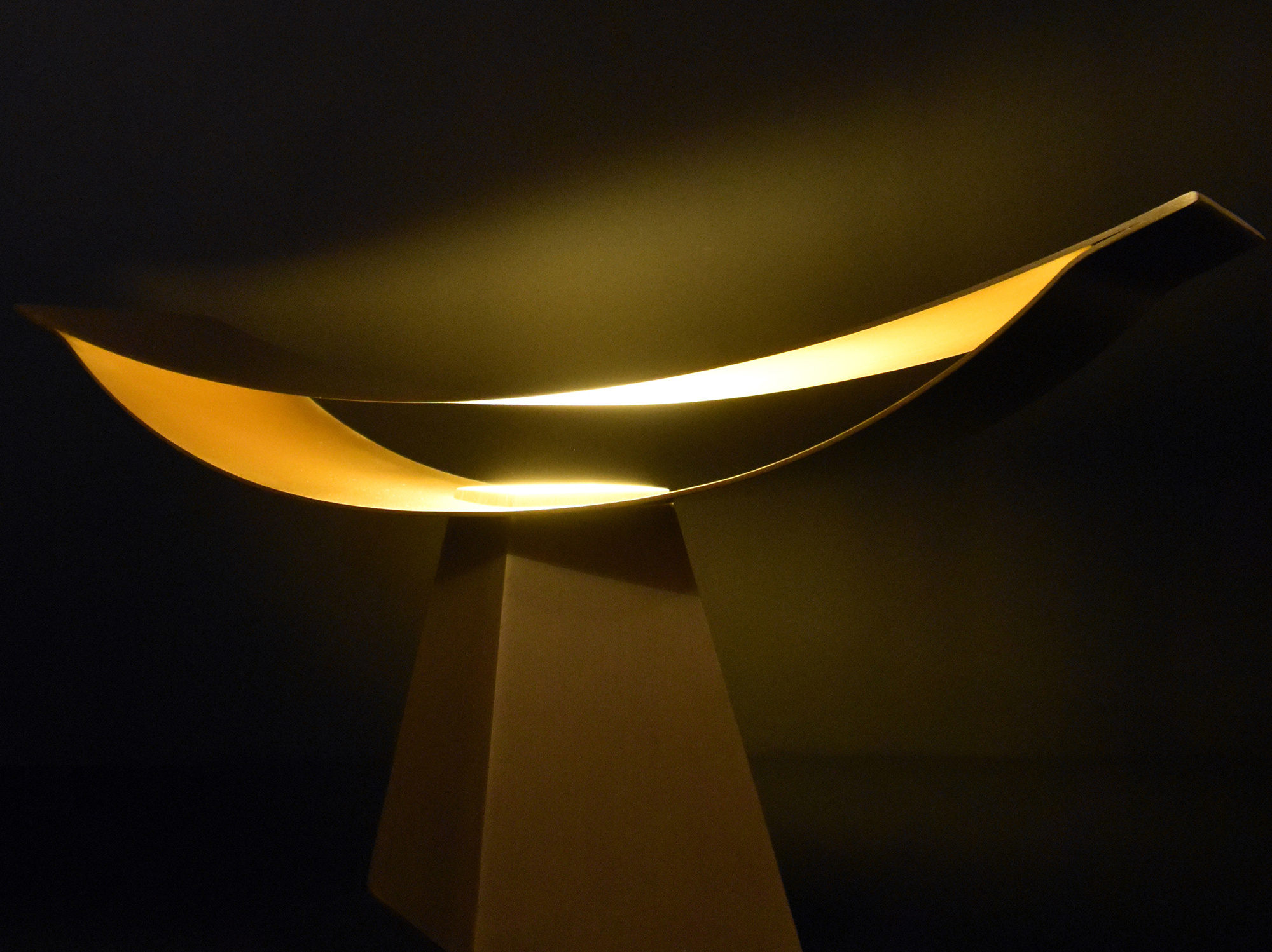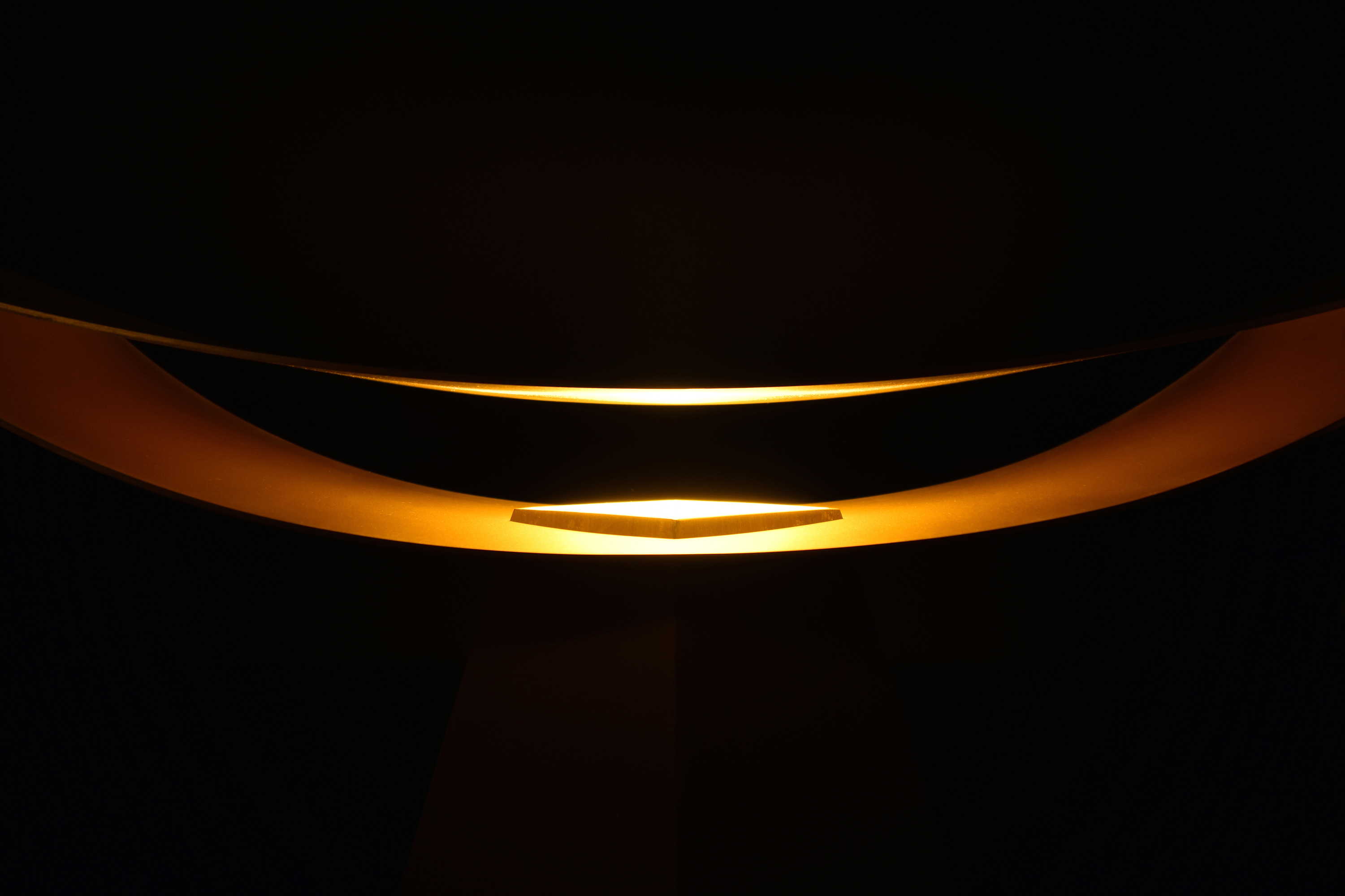 上部の反射板を異なる曲率の二枚の薄い曲面で作り、端部を溶接することでその構造は保たれる。真正面から見た時には、極力薄く作られた反射板のせいでその存在感は消える。そしてその存在感の無い部分に光を照らすことで、その存在は一気に反転する。一枚の反射板に光を当てるより、二枚の反射板の内側に光を当てることで、光がお互いに反射し合い、より存在感の強い光へと変化する。
