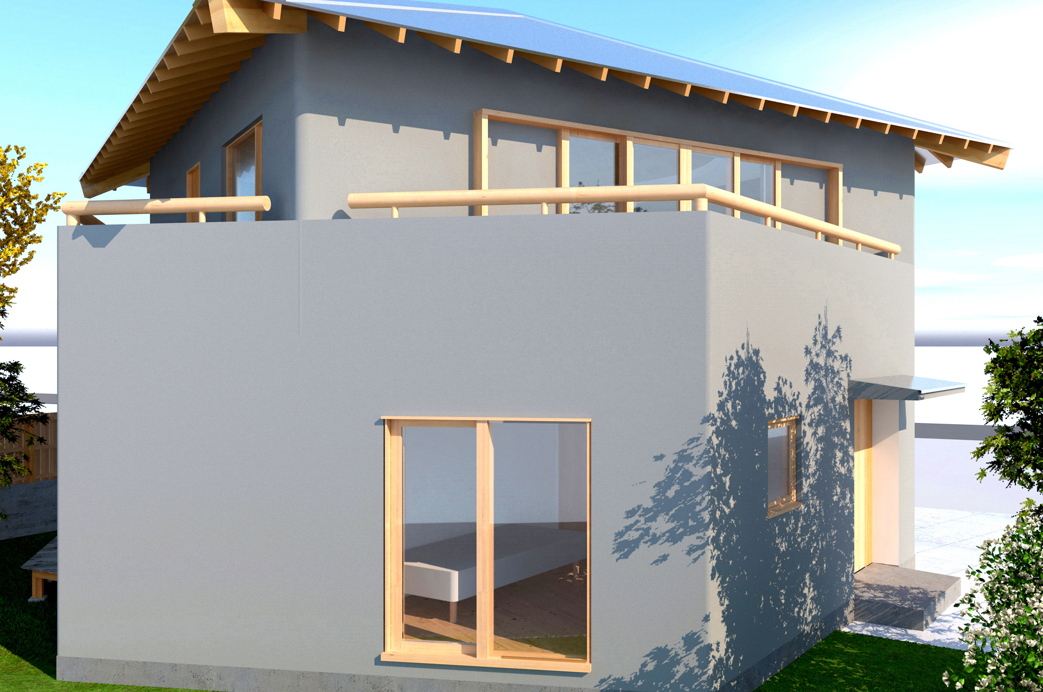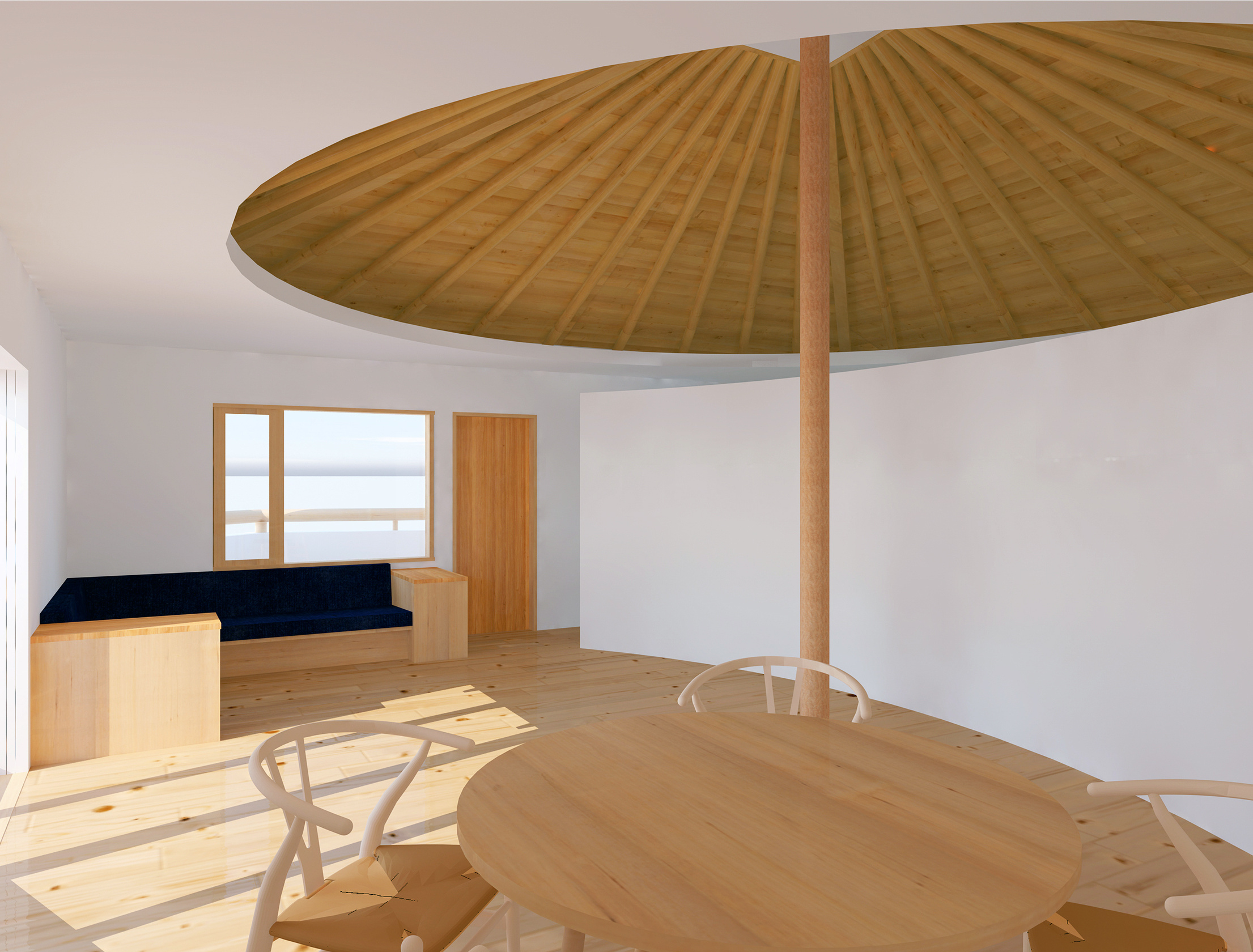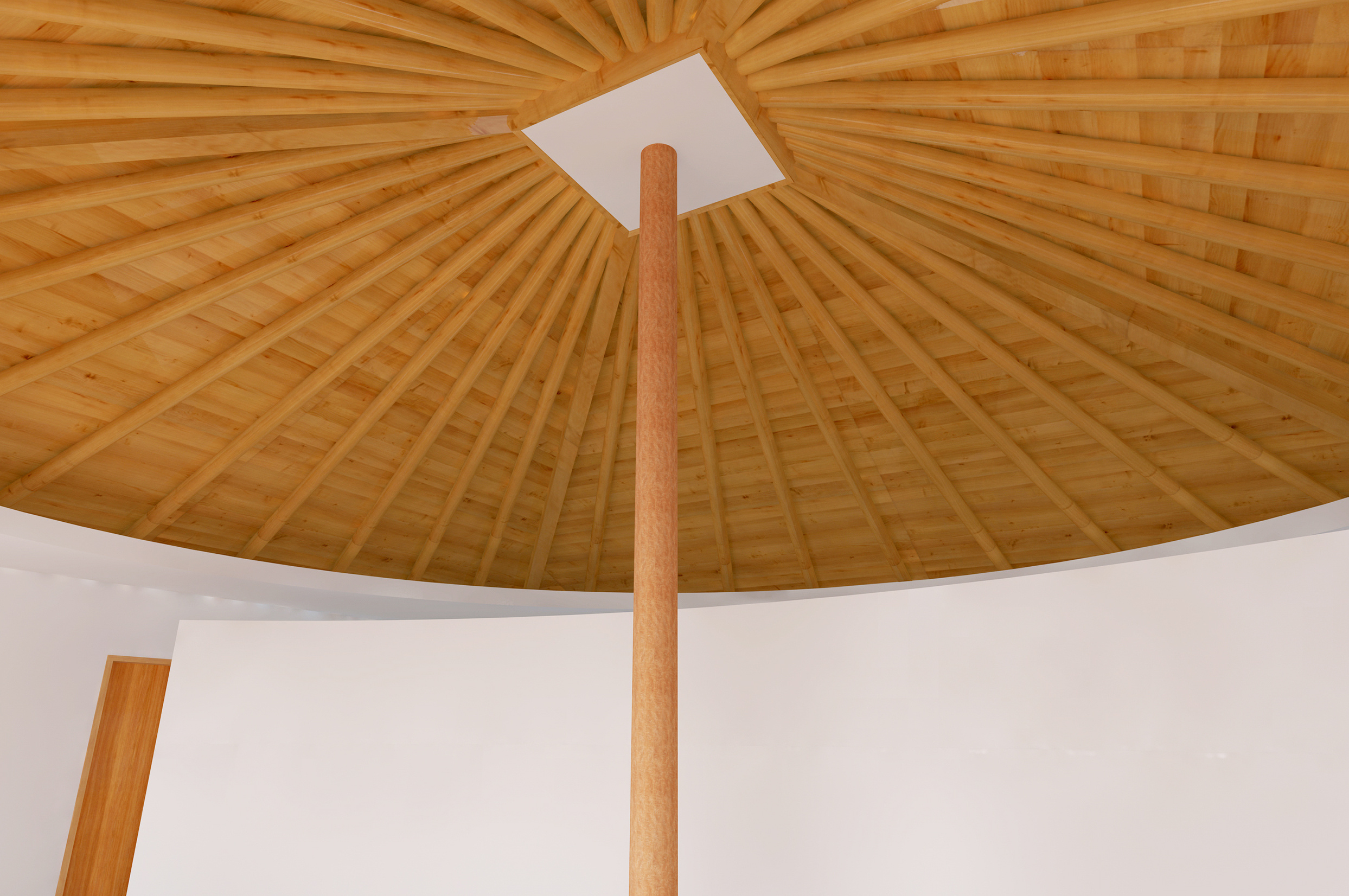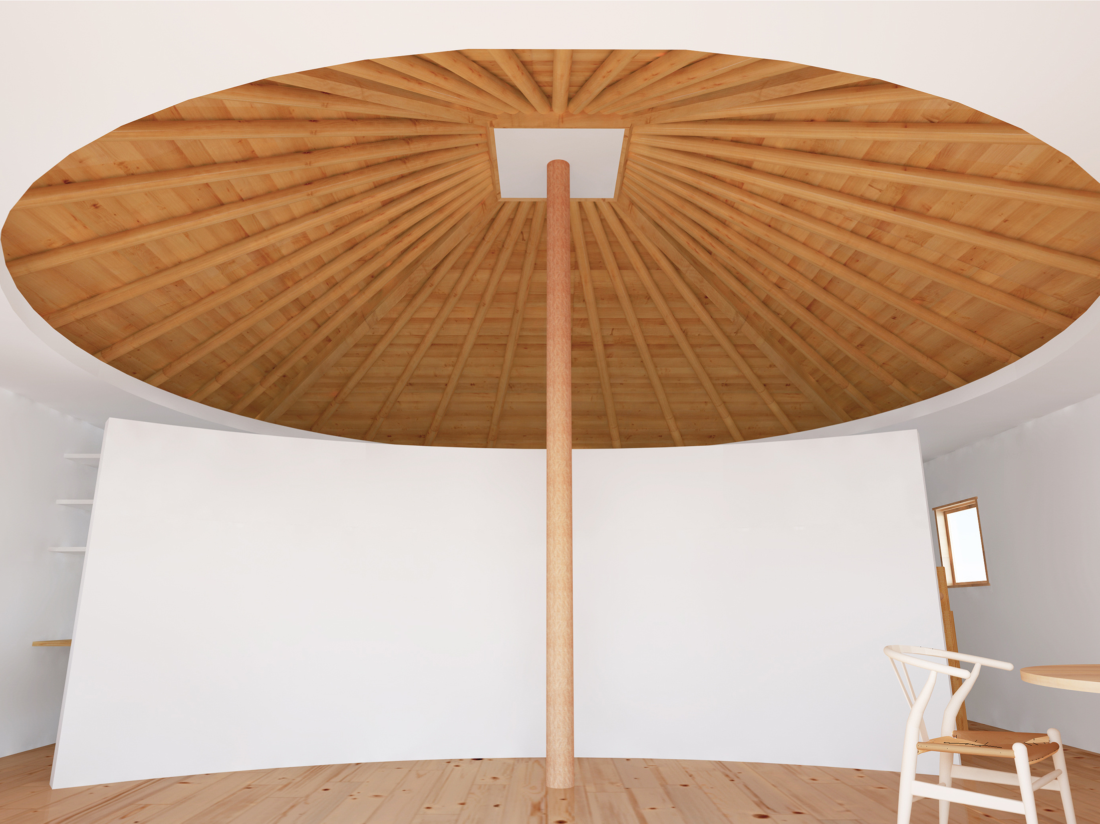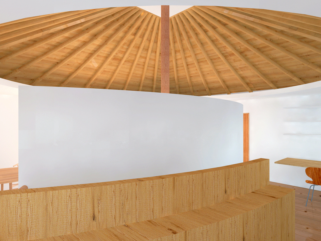 住宅とは、家族のそれぞれが楽しい時も悲しい時も必ず帰るべき精神的な拠り所でなければならない。そのような精神が宿る場所として、家族が一つの大きな傘の下に住むことを強く意識する空間作りを目指した。心柱を中心に傘を配した2階の厳格な正方形平面に対し、1階は敷地を緩やかに三つの庭と駐車場に分けるように、また十分な広さの寝室を確保するように、多角形平面としている。2階は、東側に存在するバルコニー手前の引込み戸を閉めると、真っ白な空間に中心の傘だけが象徴的に現れる。また傘の下の曲面の壁は、居間とその反対側の書斎や台所を分け、かつ傘を支える心柱の存在を強調する。