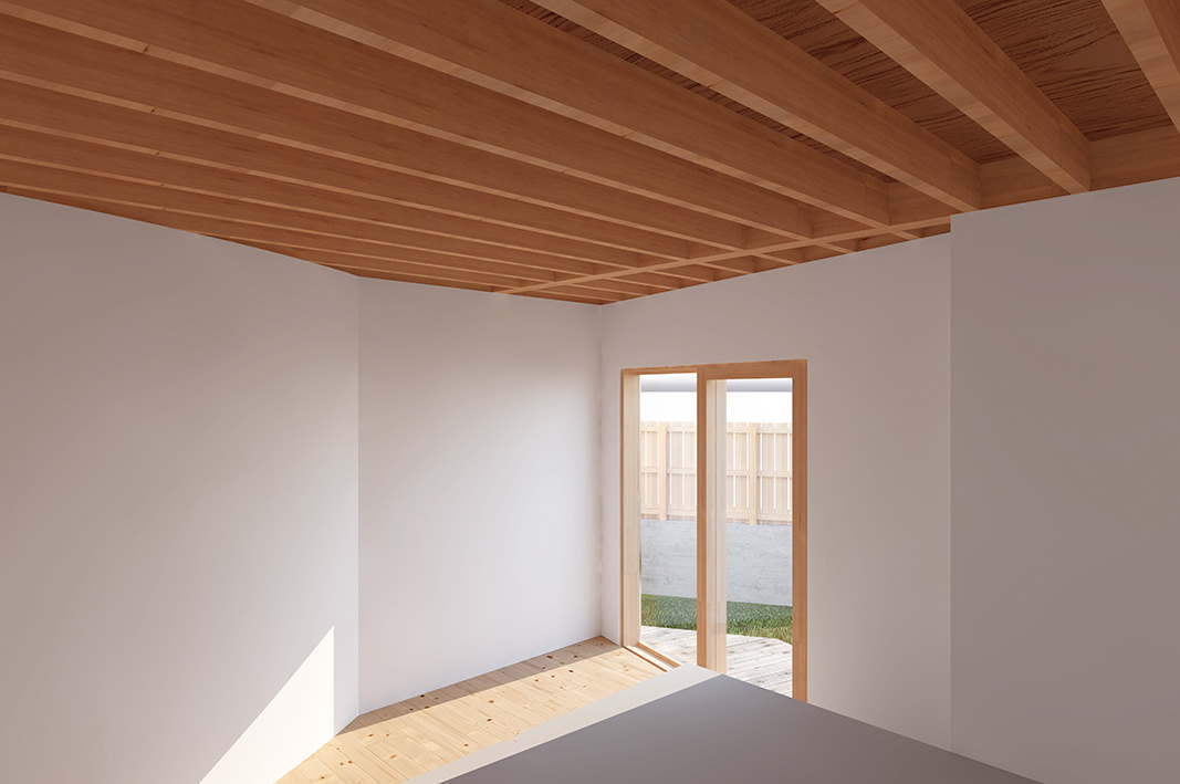 4人家族用の住宅である。敷地は、整然と区画整理され二階建の住宅が並ぶ典型的な郊外の住宅地の角地である。隣地の住宅が密集する中、どのように隣の住宅と物理的かつ心理的な距離を確保するかという問題と、そして何より、この家に住むことで、改めて家族というものが一つの屋根の下に住む意味を強く意識してほしいと願った。